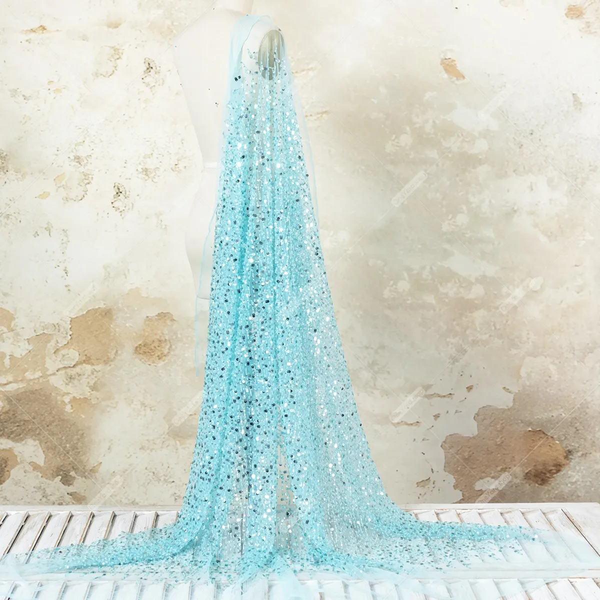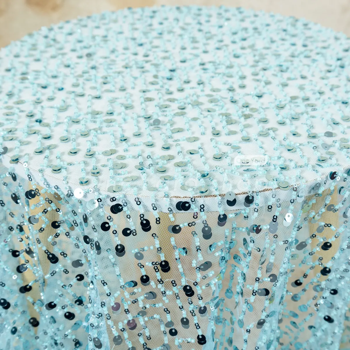 Dazzling ice blue 'rainfall' beaded sequinned tulle heavy beading fabric. Step into a fairytale with this mesmerizing ice blue beading material. Crafted on a base of soft mesh, this fabric features a stunning vertical linear pattern composed of shimmering sequins and heavy beads. The design mimics the look of a glistening frozen waterfall or gentle rain. Heavyweight and draped, it is the perfect choice for creating 'Frozen' inspired princess gowns, prom dresses, veils, or glamorous event overlays.
