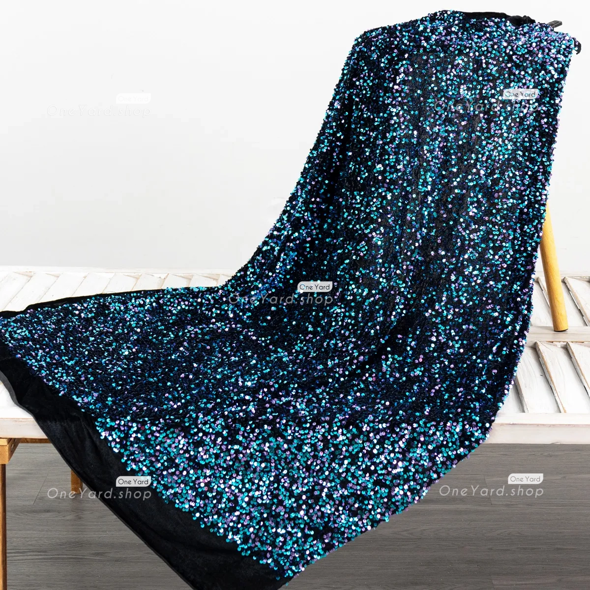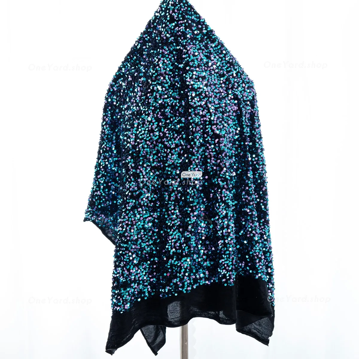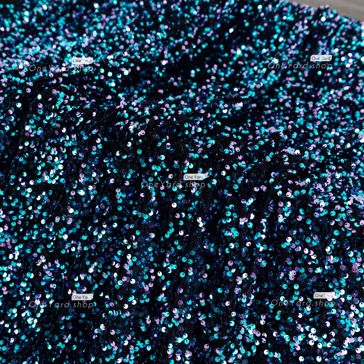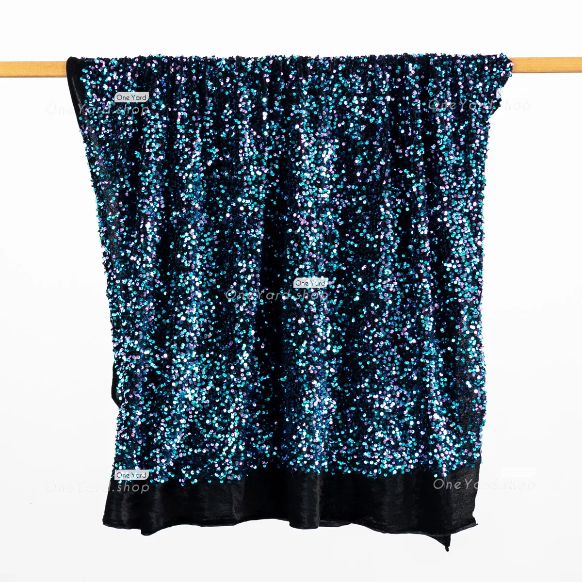 This stunning fabric is adorned with sparkling, iridescent indigo 5mm sequins that catch the light and create a mesmerizing, almost magical effect. The sequins are a mix of deep teal, sapphire blue, and hints of purple, sewn on black stretch velvet material, creating a rich and luxurious color palette. The fabric has a luxurious drape and a dense, sequin-packed surface, making it perfect for creating glamorous and eye-catching garments or accessories.