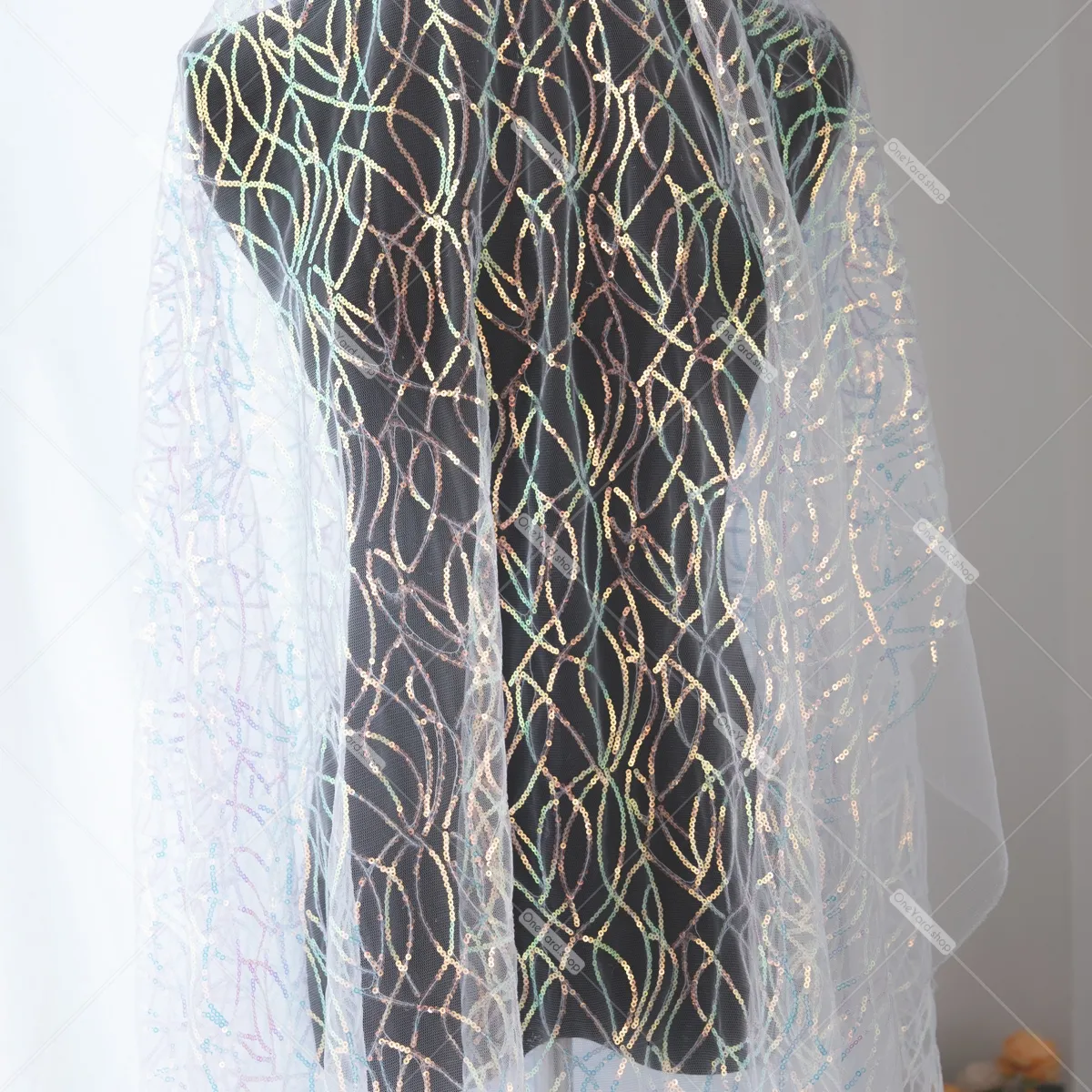 Dazzling iridescent 3mm sequins with wave patterns all over on soft white slightly stretchy mesh fabric sold by the yard. The iridescent sequin embroidered tulle mesh material is used for bridesmaid dresses, prom dresses, dance gowns, and more.