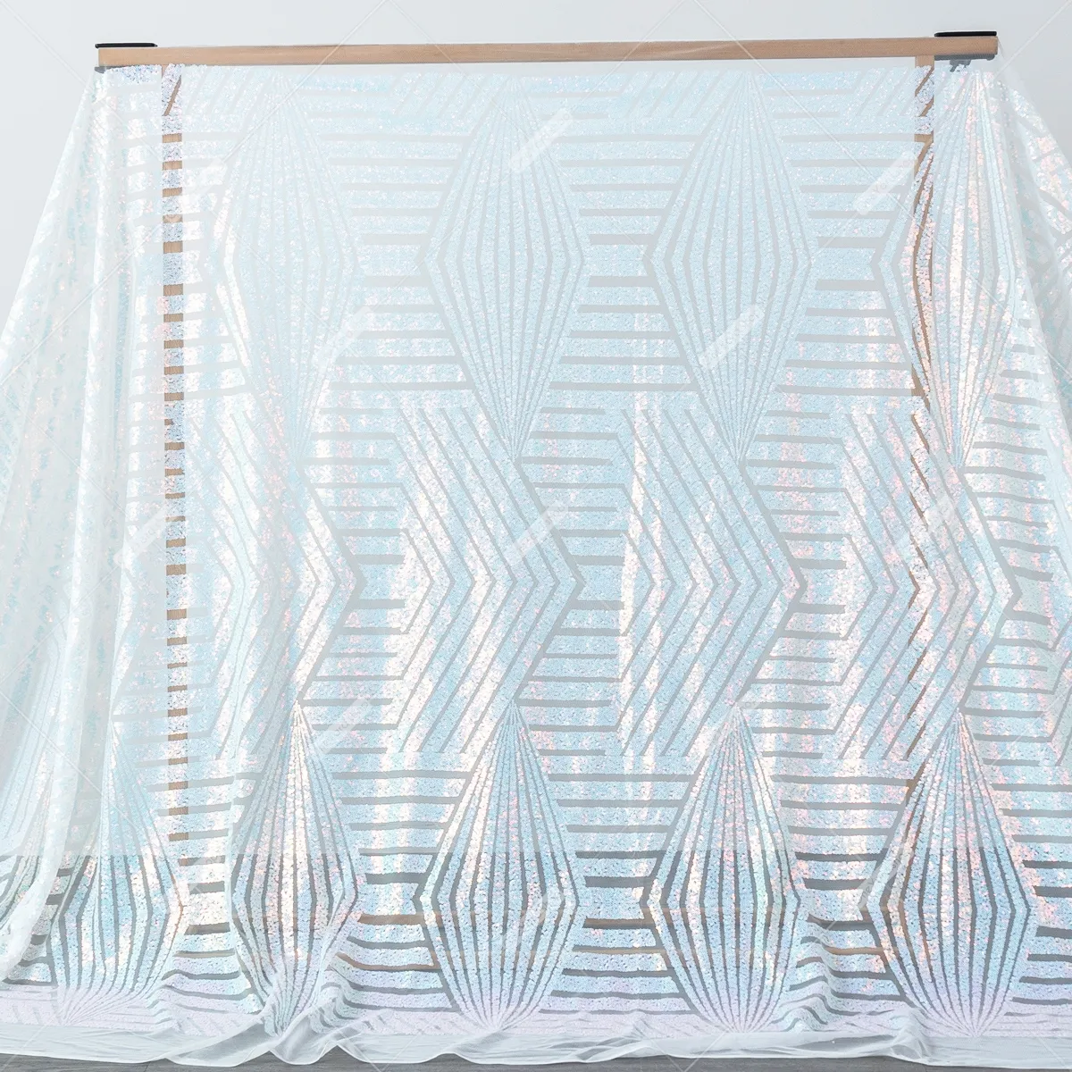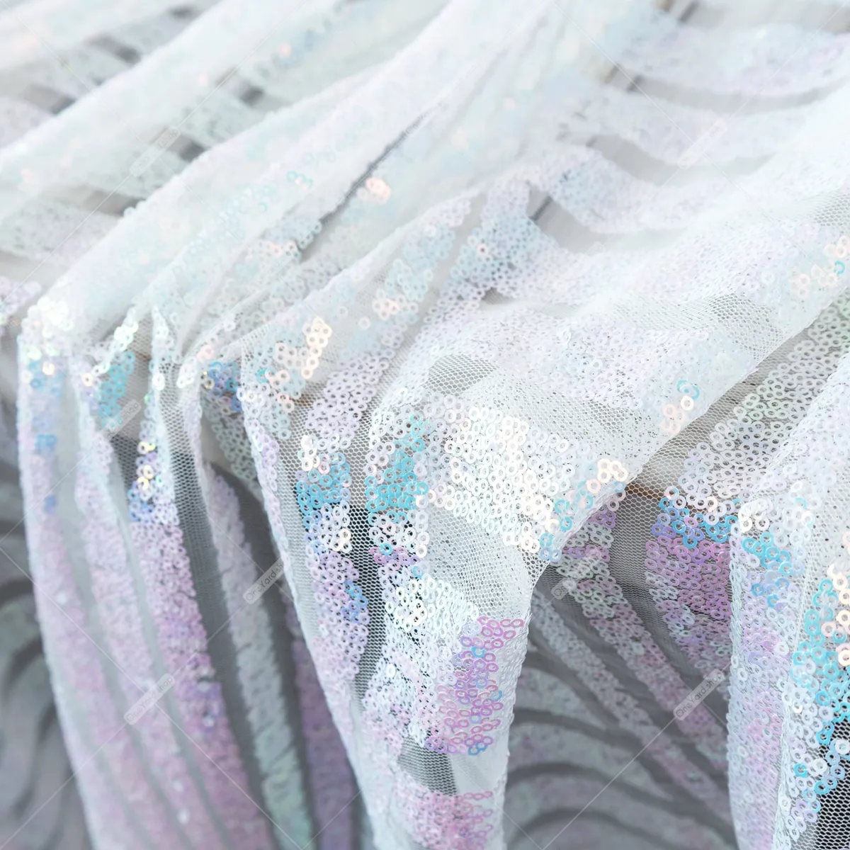 Fancy pink & blue iridescent white 3mm sequin with bombshell stripe patterns metallic fabric sold by the yard. Geometric stripe pattern iridescent sequin on mesh material for prom dresses and decorations.