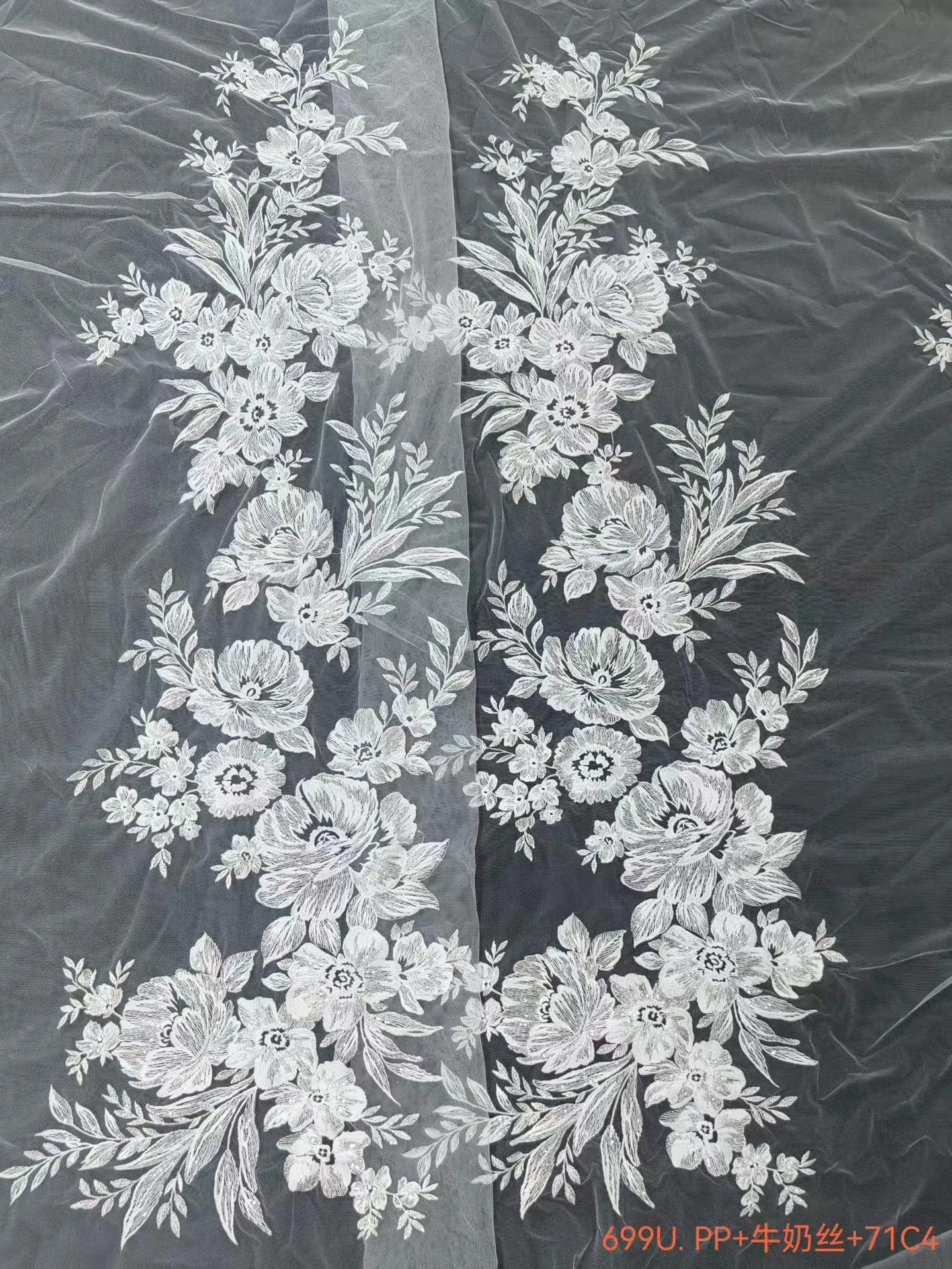 Make a bold and unforgettable statement with the 3D cording & milk silk large floral lace fabric. This unique blend ensures a deeply textured, architectural matte finish that remains soft and skin-friendly. The generous negative space between the majestic floral pillars not only creates a powerfully elongating silhouette but also allows designers to easily cut these giant motifs to use as custom appliques. The perfect choice for crafting regal bridal gowns, structured bodices, and couture overlays.