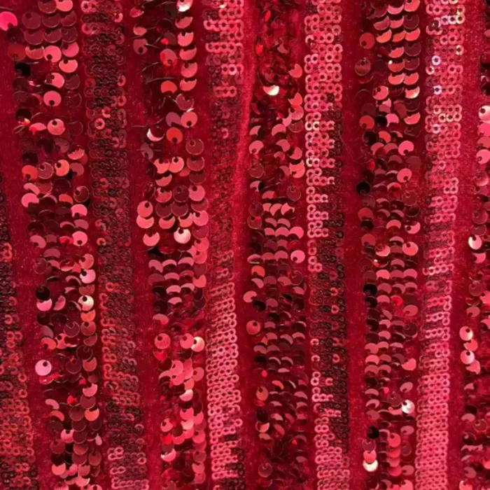 The new fashion metallic fabric is a cascade of vertical alternating large and small sequin stripes that are closely packed together, creating a shimmering and glamorous effect. This type of sequin fabric is often used for special occasion dresses, such as evening gowns or party dresses, due to its dazzling appearance.
