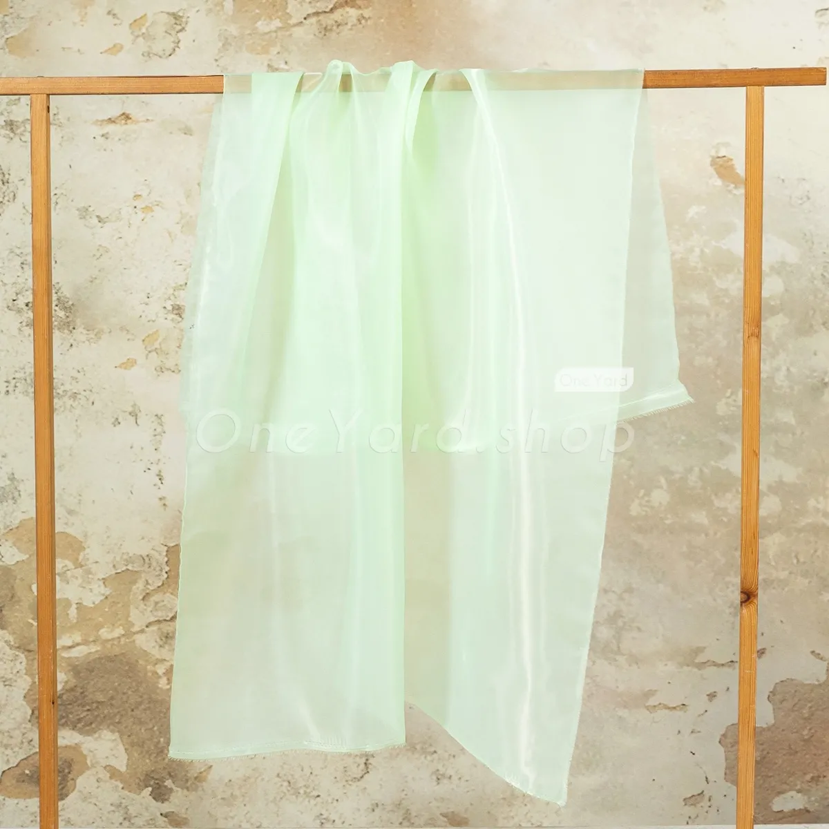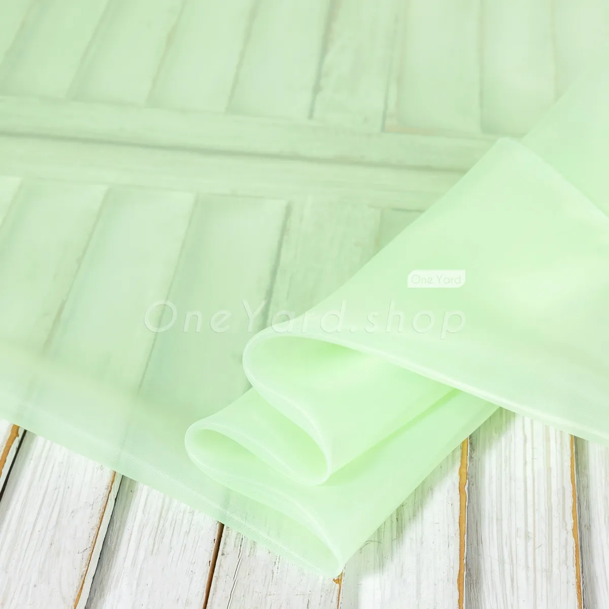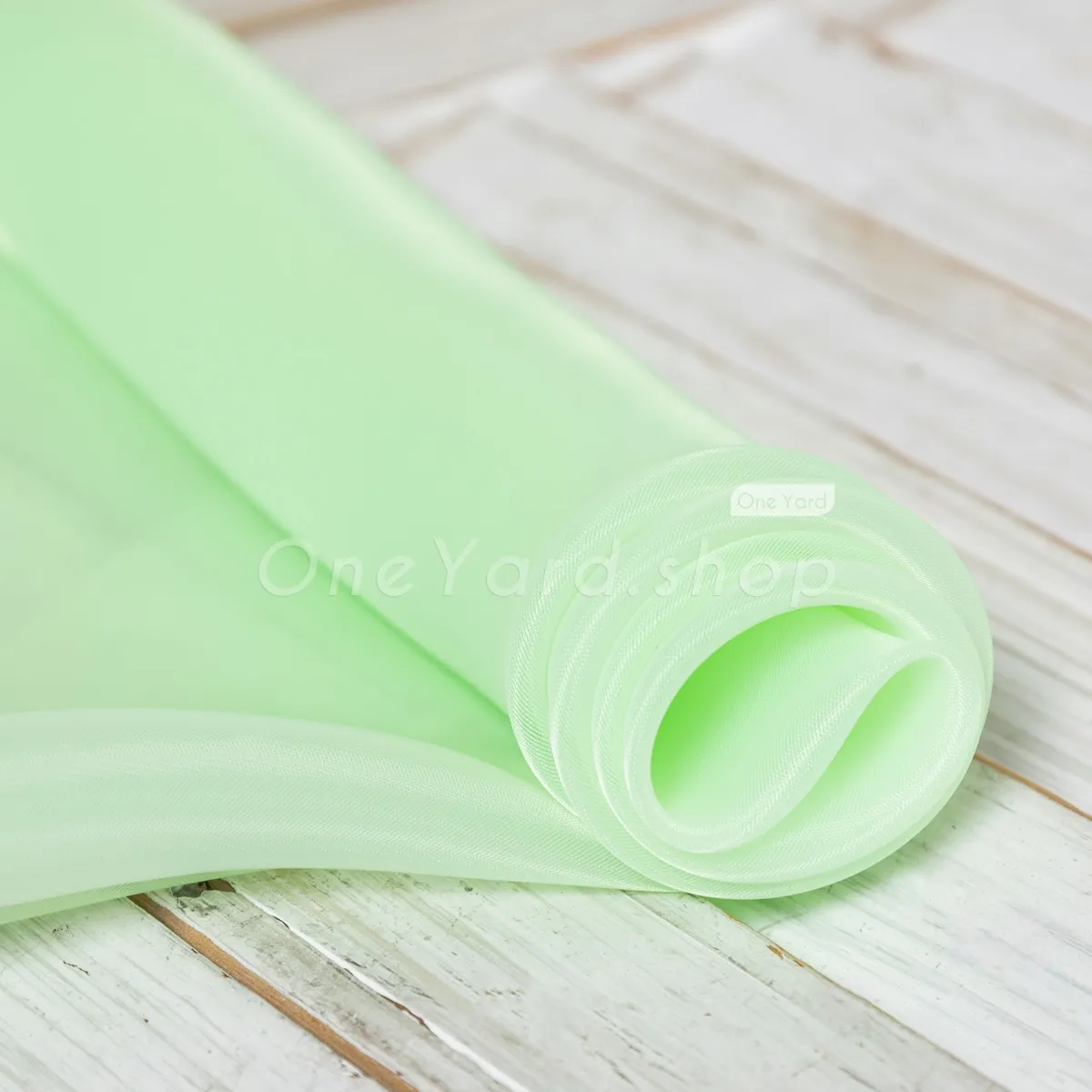 This is a beautiful, sheer, smooth, thick organza fabric in a delicate light green, almost mint, shade. The fabric has a crisp yet flowing quality, characteristic of organza, which allows it to hold shape while still draping softly. Its transparency makes it ideal for layering, overlays, and creating ethereal effects. Perfect for a variety of creative projects, including: elegant overlays for dresses, skirts, blouses, bridal wear, and theatrical costumes, unique gift wrapping, and various DIY projects.