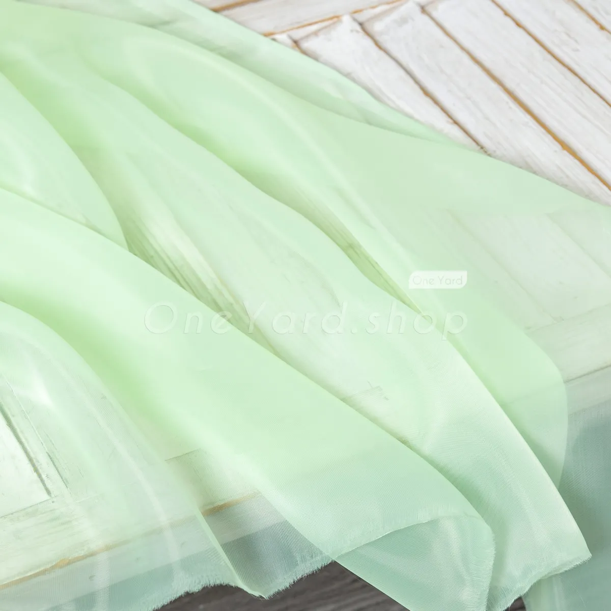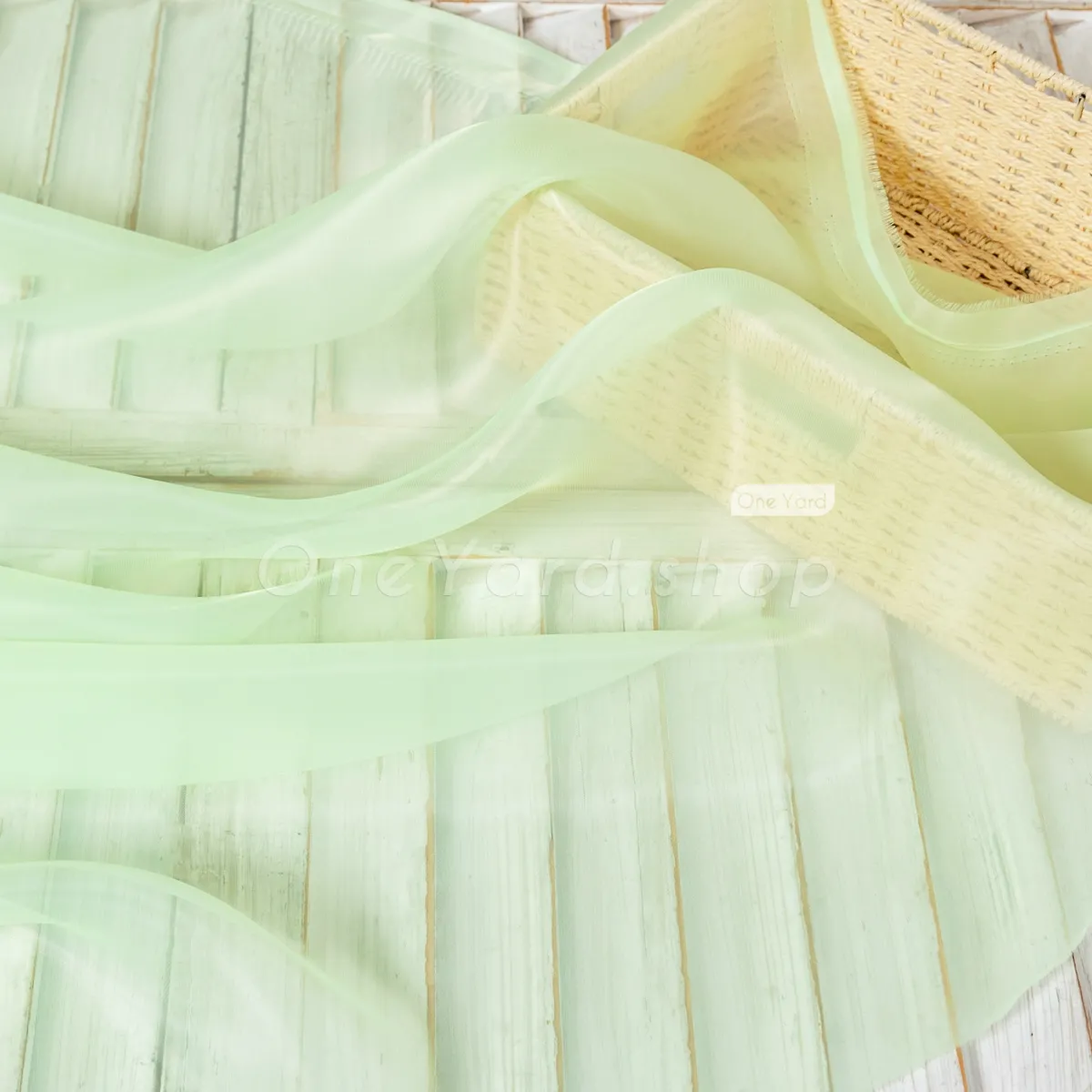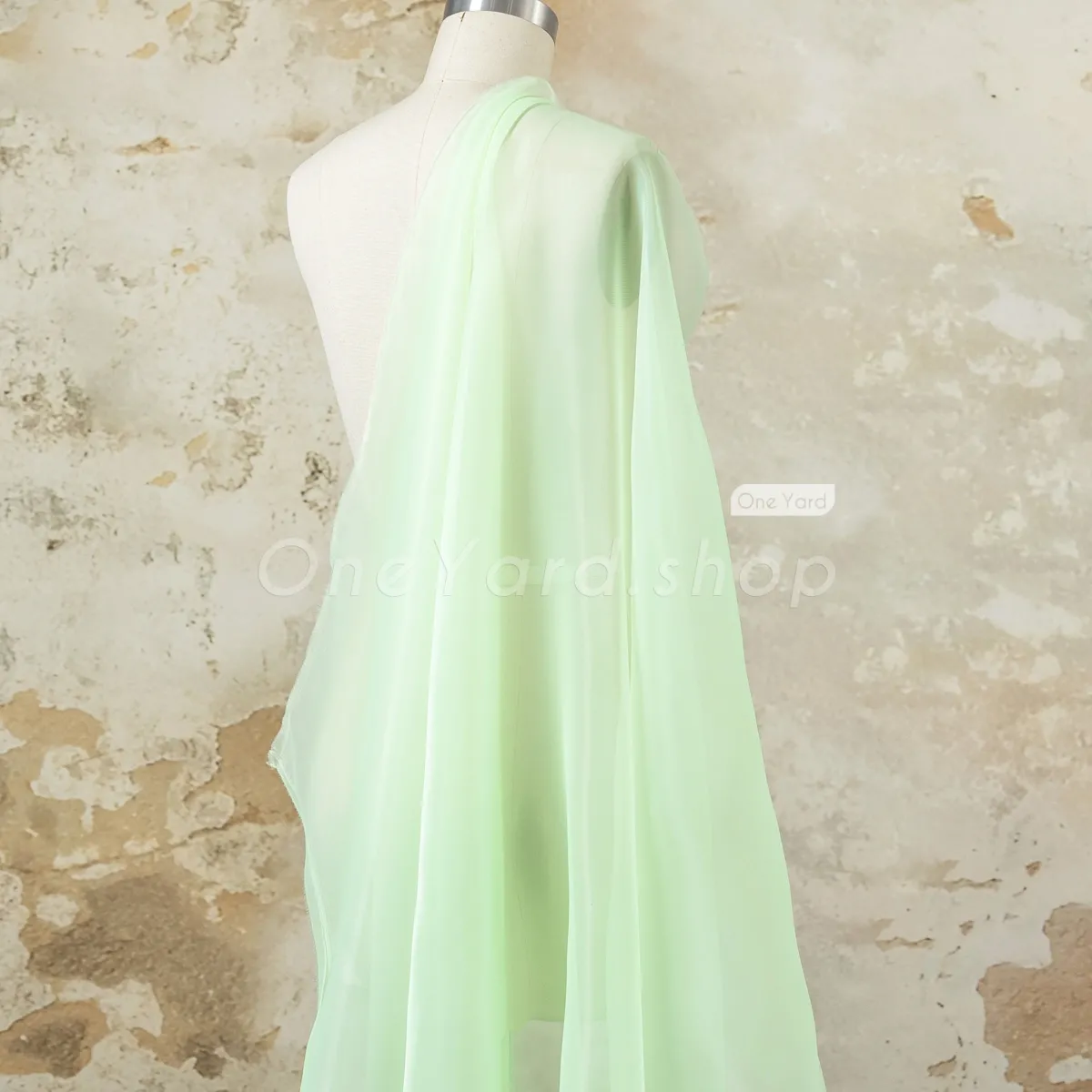 This is a beautiful, sheer, smooth, thick organza fabric in a delicate light green, almost mint, shade. The fabric has a crisp yet flowing quality, characteristic of organza, which allows it to hold shape while still draping softly. Its transparency makes it ideal for layering, overlays, and creating ethereal effects. Perfect for a variety of creative projects, including: elegant overlays for dresses, skirts, blouses, bridal wear, and theatrical costumes, unique gift wrapping, and various DIY projects.