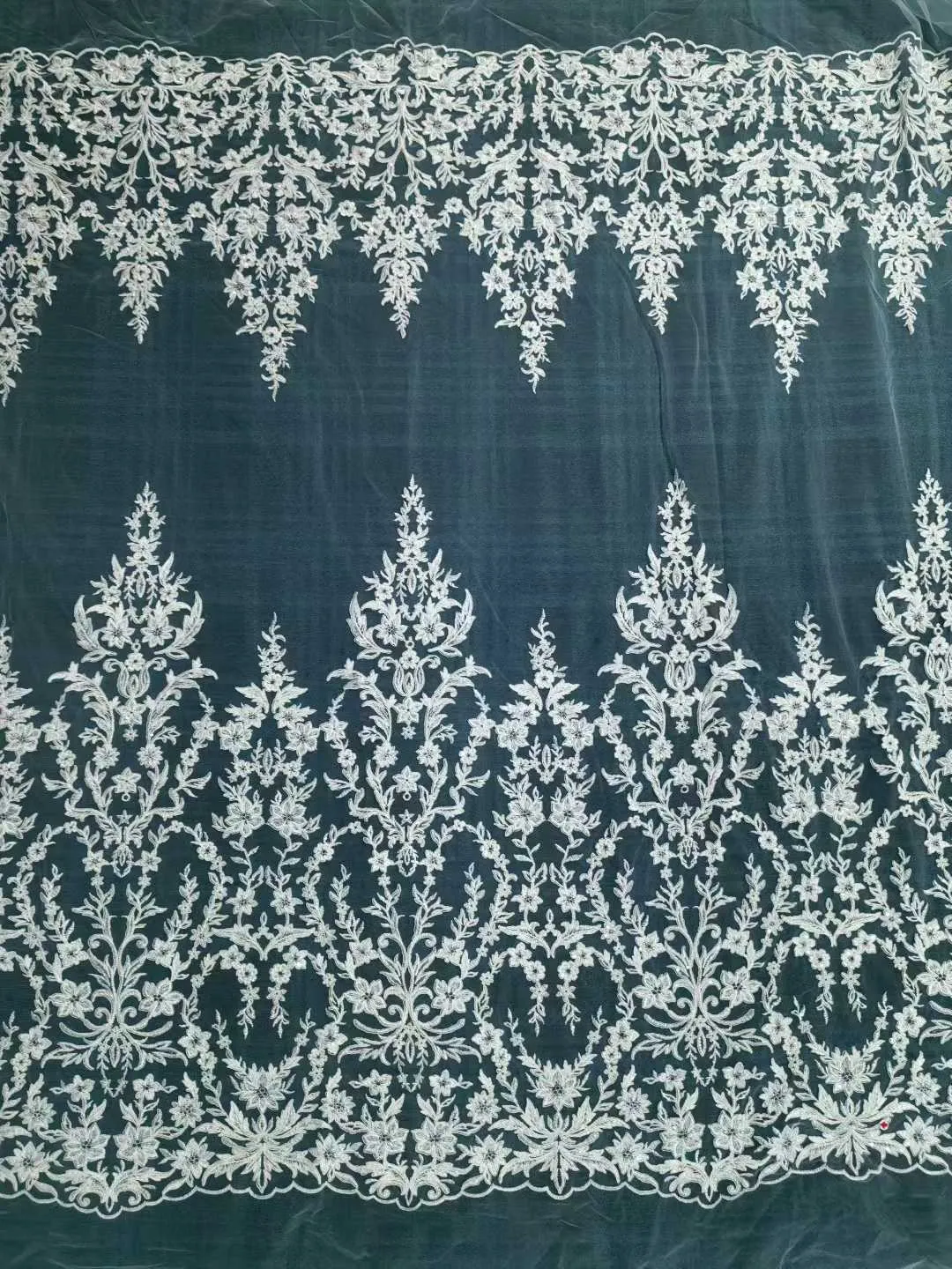 Elevate your bridal and evening wear with this majestic double-border embroidered mesh lace fabric. It features heavy, elegantly scalloped borders on both the top and bottom edges. The prominent bottom border boasts tall, symmetrical, spire-like floral damask motifs that reach gracefully upward, perfectly mirrored by the top edge to create a stunning framed effect. This ready-to-use border layout is the ultimate choice for designing cathedral veils, A-line skirt hemlines, and couture overlays.