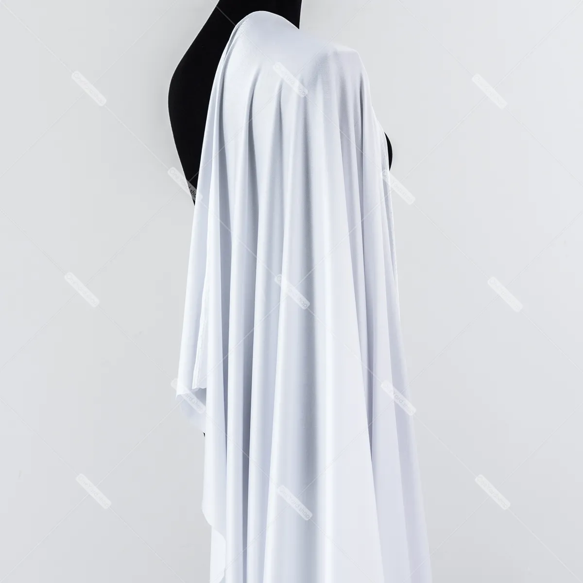 Matte pure white spandex jersey knit fabric sold by the yard. This matte white jersey material is perfect for women’s tops, dance wear, special occasions, and almost every other activewear you can imagine.