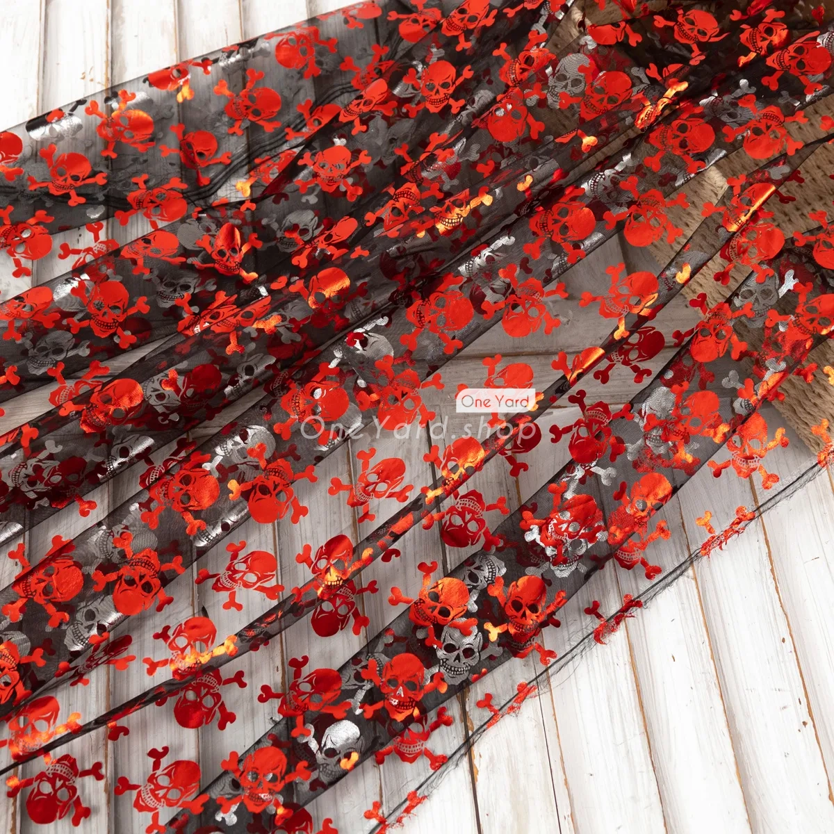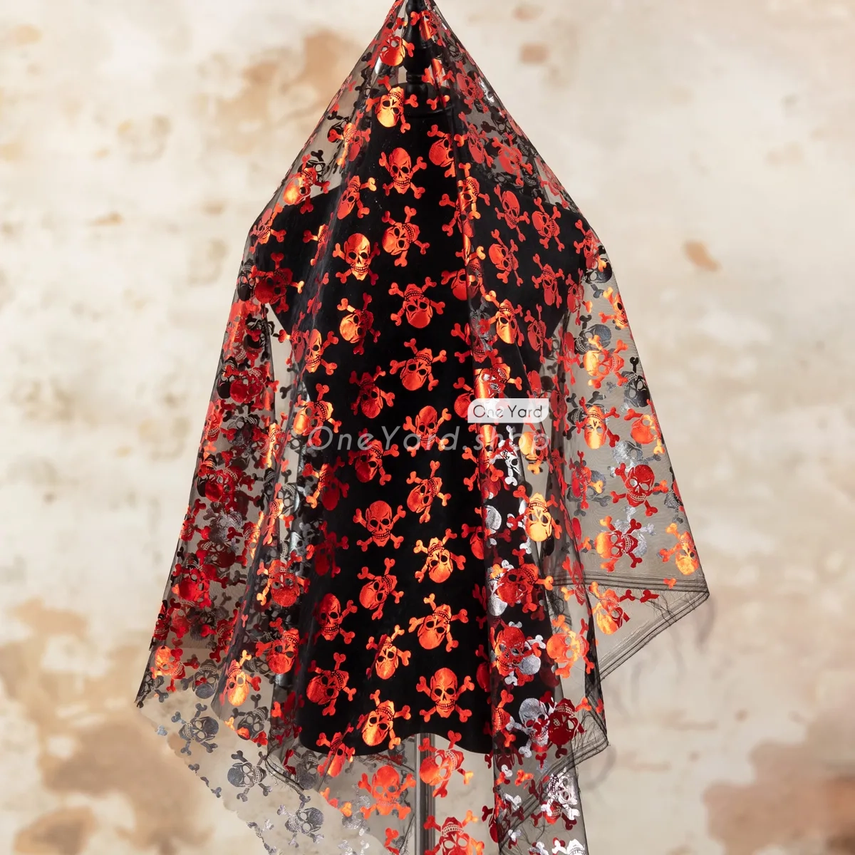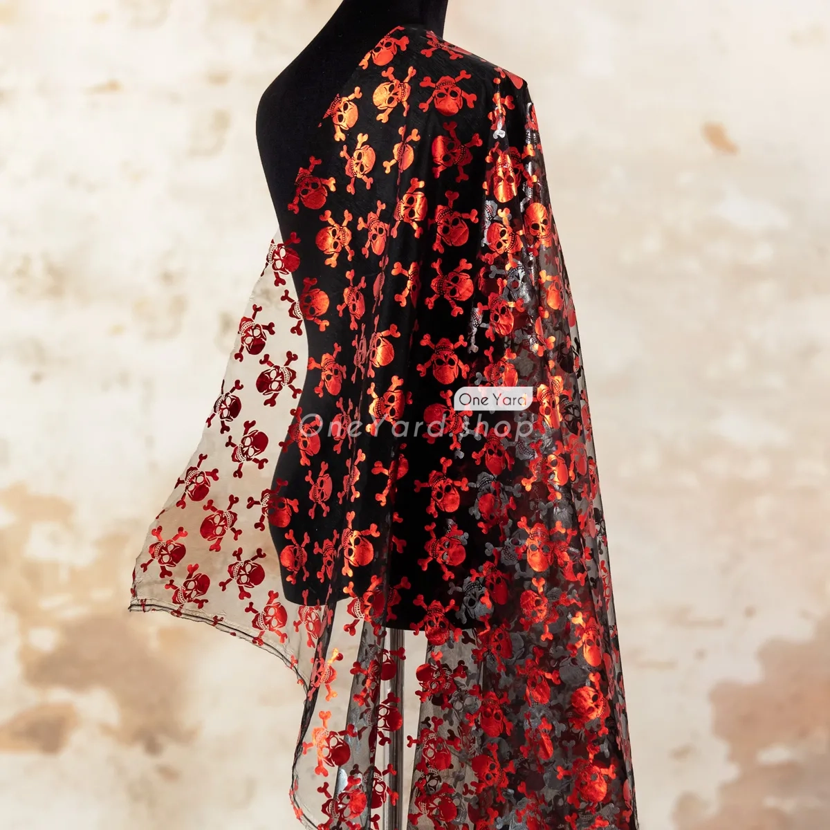 Metallic Red Skull Black Sheer Mesh Halloween Fabric