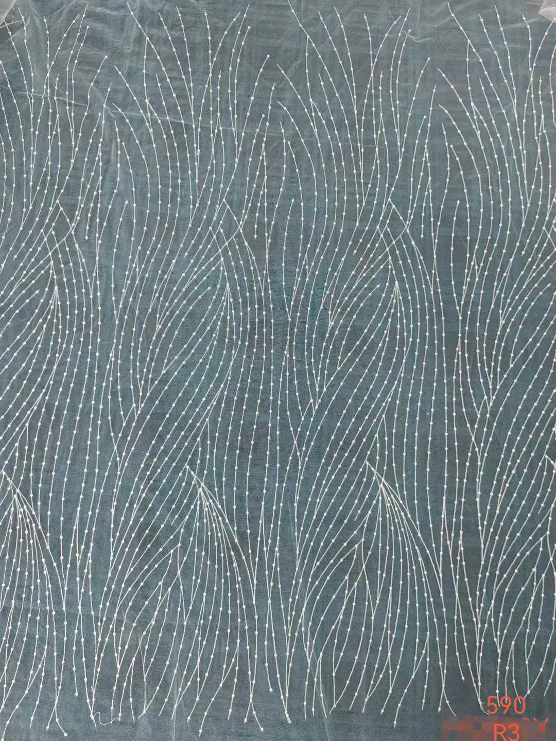 Create a sleek, contemporary silhouette with this unique embroidered mesh lace fabric. Moving away from traditional florals, this striking design features continuous, flowing vertical wavy lines meticulously formed by delicate dotted embroidery and subtle beadwork. Crafted with lustrous rayon thread on a sheer mesh base, the cascading wave pattern offers an incredibly fluid, elongating visual effect. Perfect for crafting modern minimalist bridal gowns, chic evening wear, and high-fashion statement overlays.