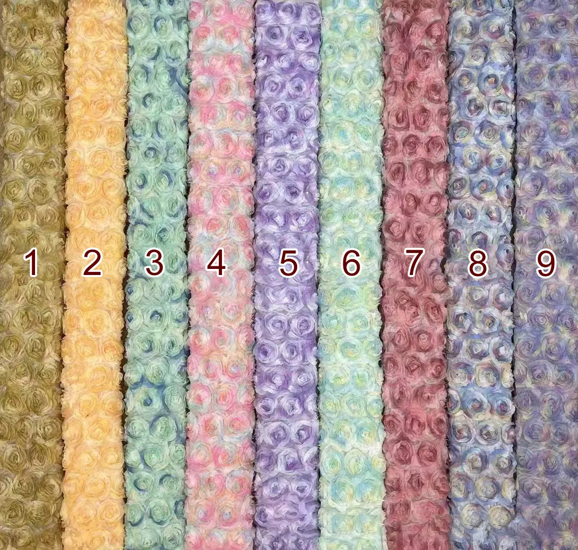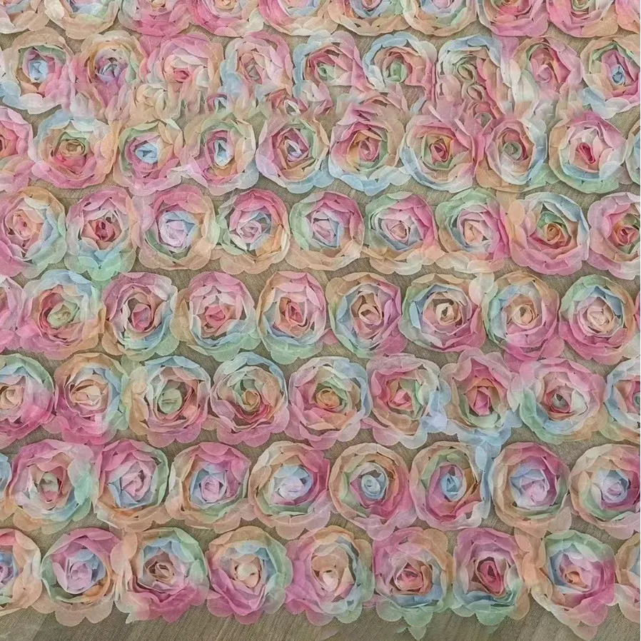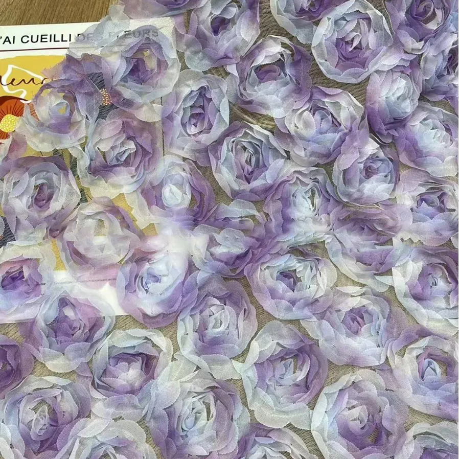 Romantic ombre tulle 3D flower embroidery fabric by the yard. The surface of the fabric is entirely embroidered with multi-dimensional rosettes made from soft mesh fabric, creating a voluminous texture. This material is soft to the touch and possesses a fluid, graceful drape. An ideal choice for creating voluminous skirts for flower girl dresses, romantic evening gowns, or statement sleeves. Perfect for photography backdrops, decorative table runners, or garden-themed celebrations.