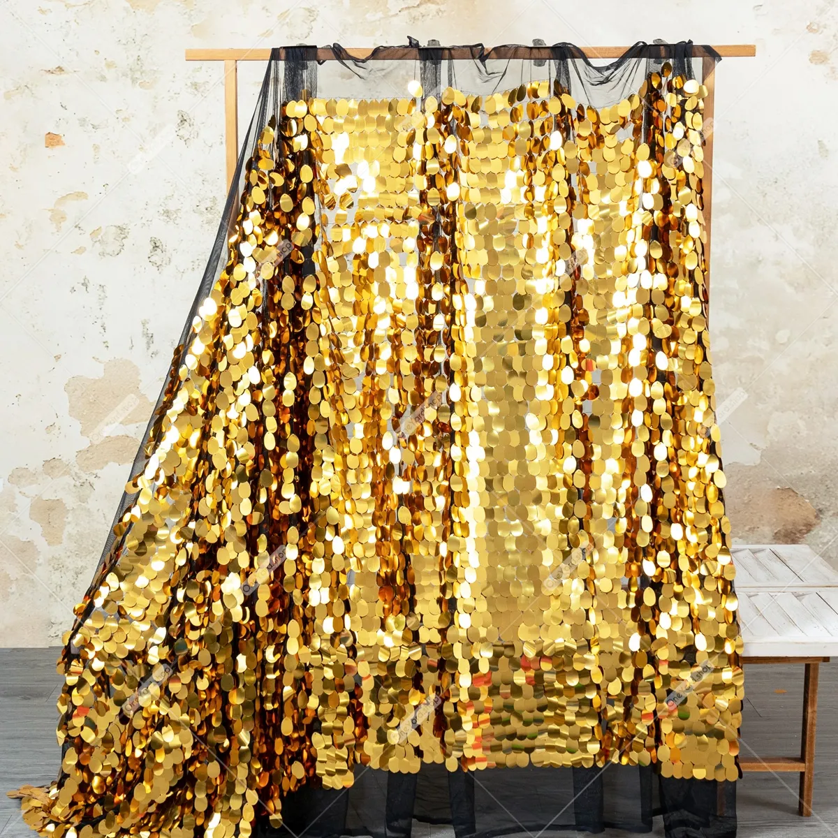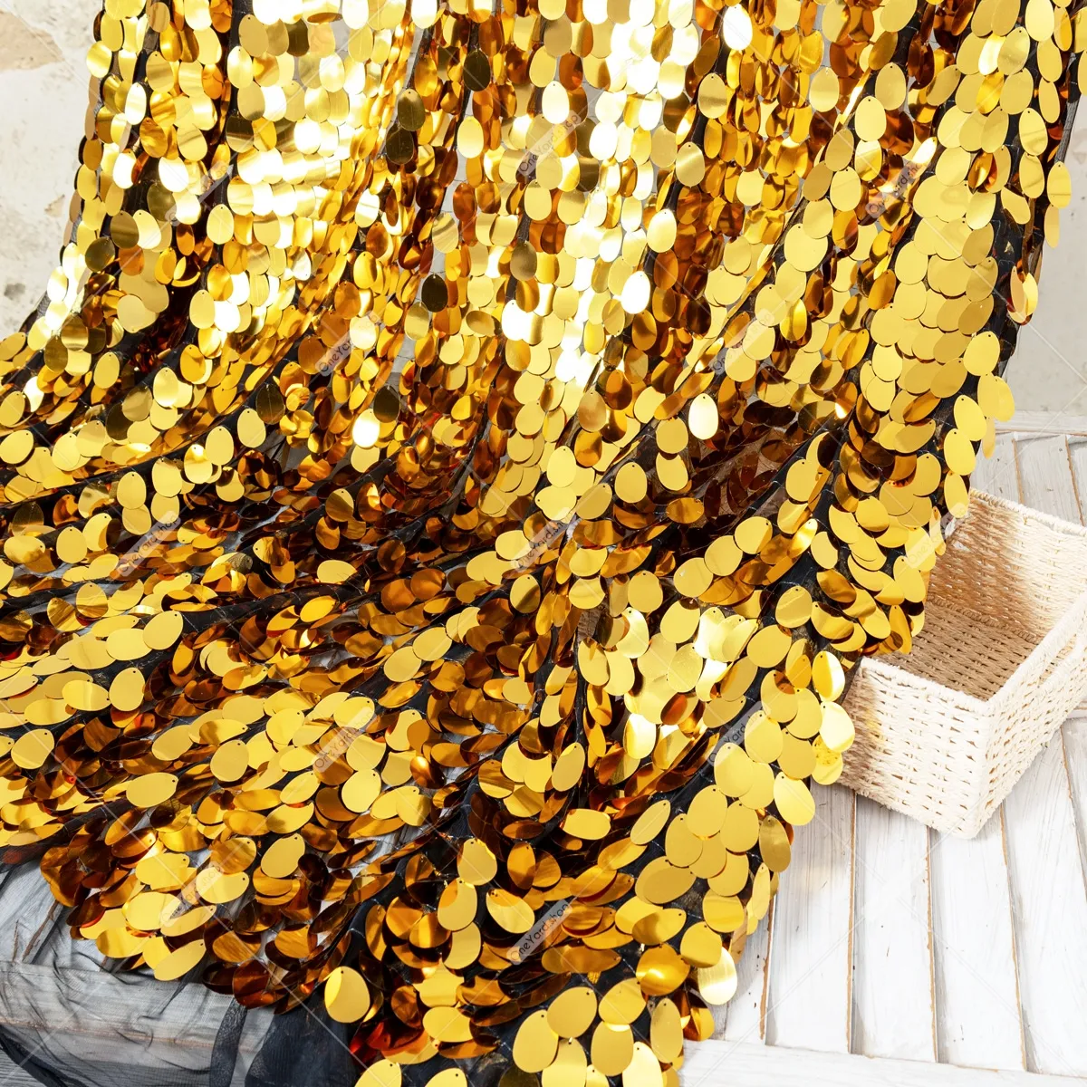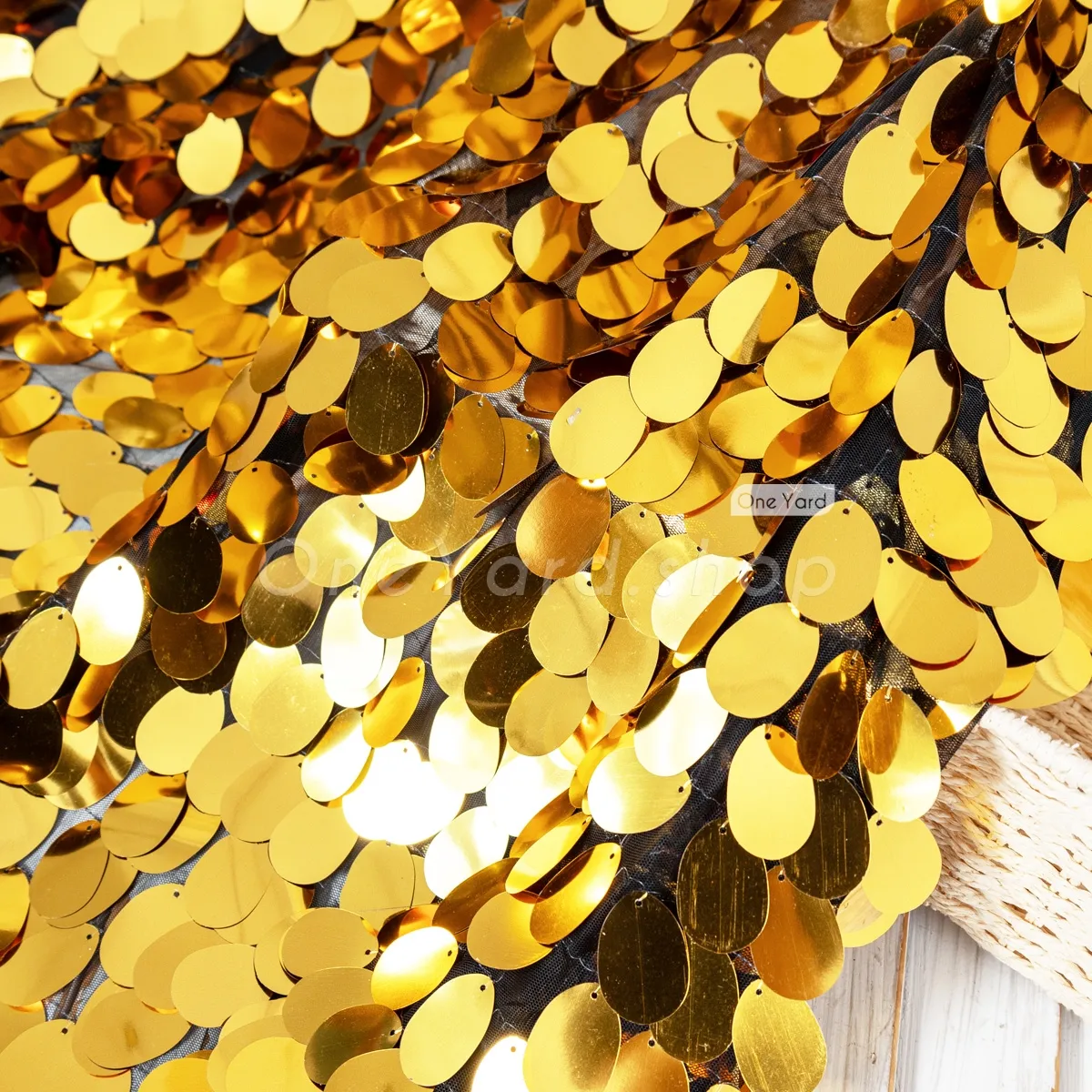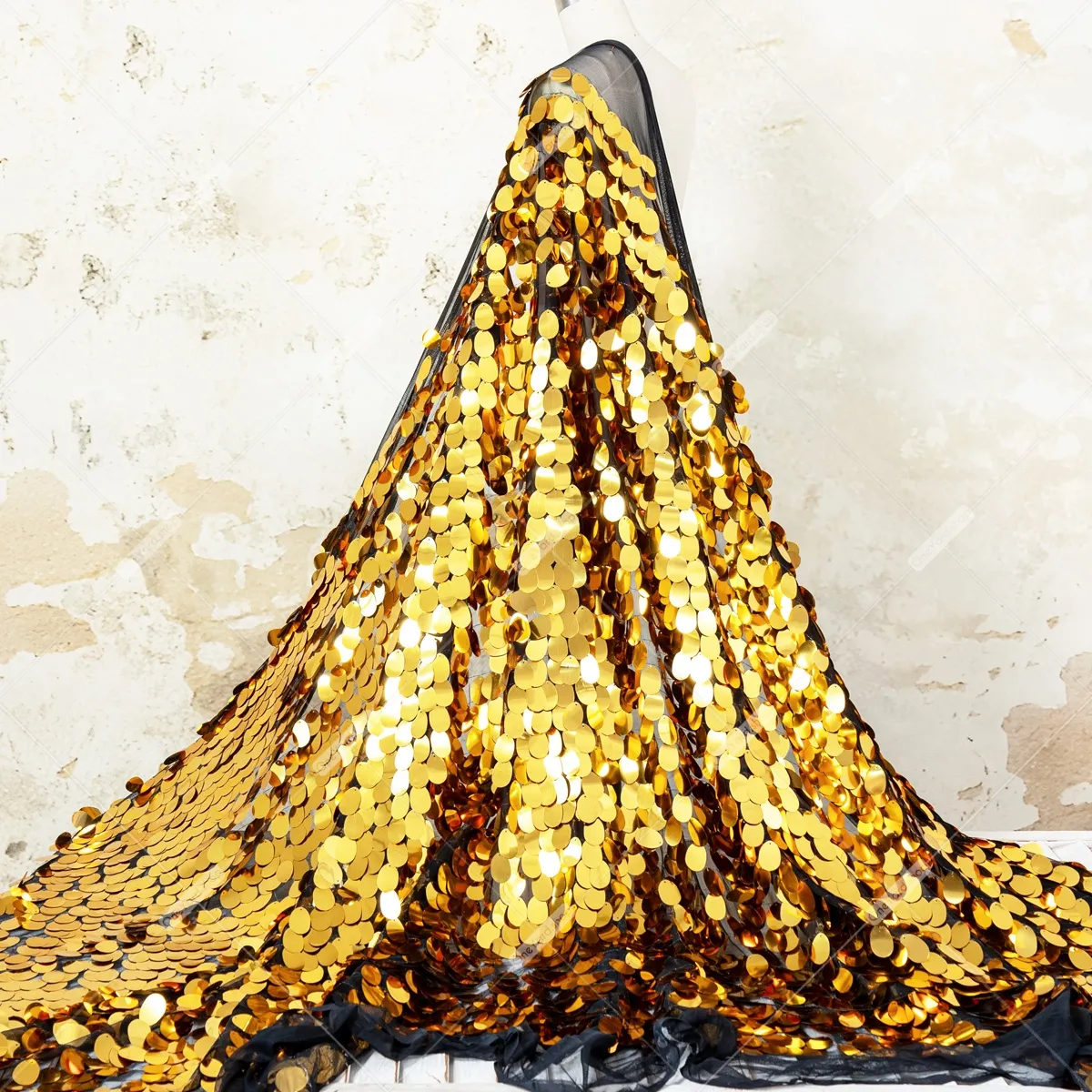 Ignite the room with the breathtaking shine of this metallic gold oval paillette sequin fabric. This material features large, oval-shaped sequins densely arranged in an overlapping, scale-like pattern that mimics the look of liquid metal or gilded armor. Each sequin is top-mounted onto a black mesh backing, allowing the embellishments to hang freely. Heavy and fluid, the fabric hangs with a luxurious weight, making it perfect for special occasion dresses or gravity-defying backdrops. Sequin size: 40mm.