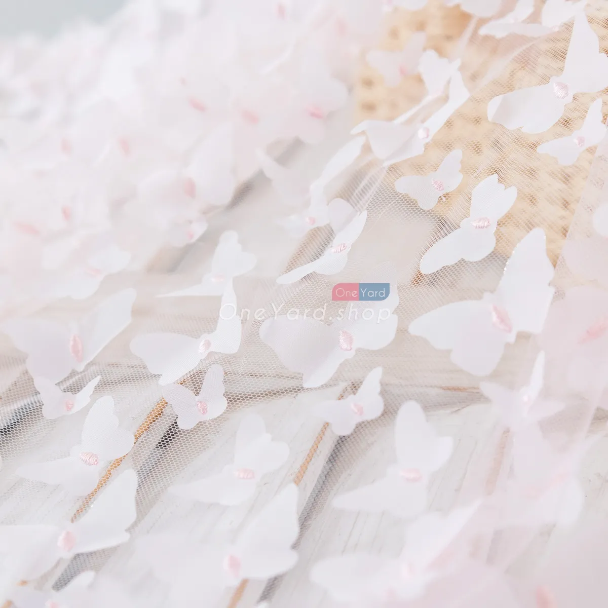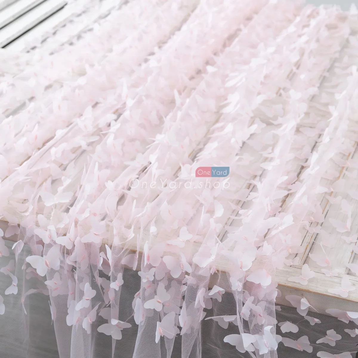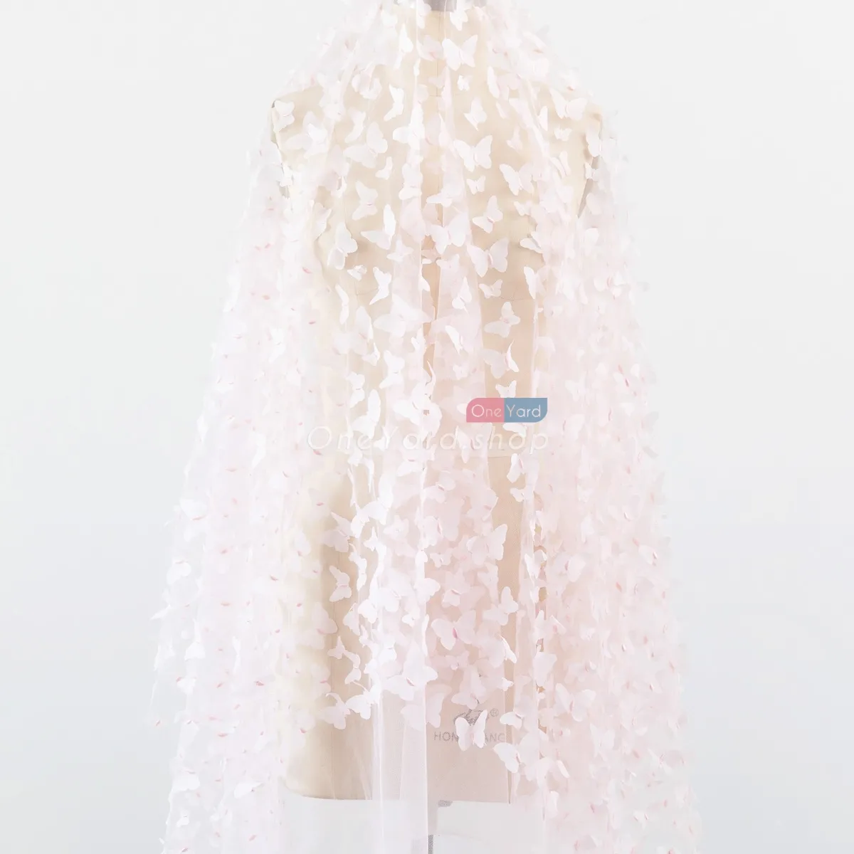 Silver tinsel glitter outlined pale pink 3D butterfly embroidery mesh fabric by the yard. Soft and lightweight pale pink 3d butterflies with tinsel details embroidered on mesh material, used for dressmaking, decorations, backdrops, and more.