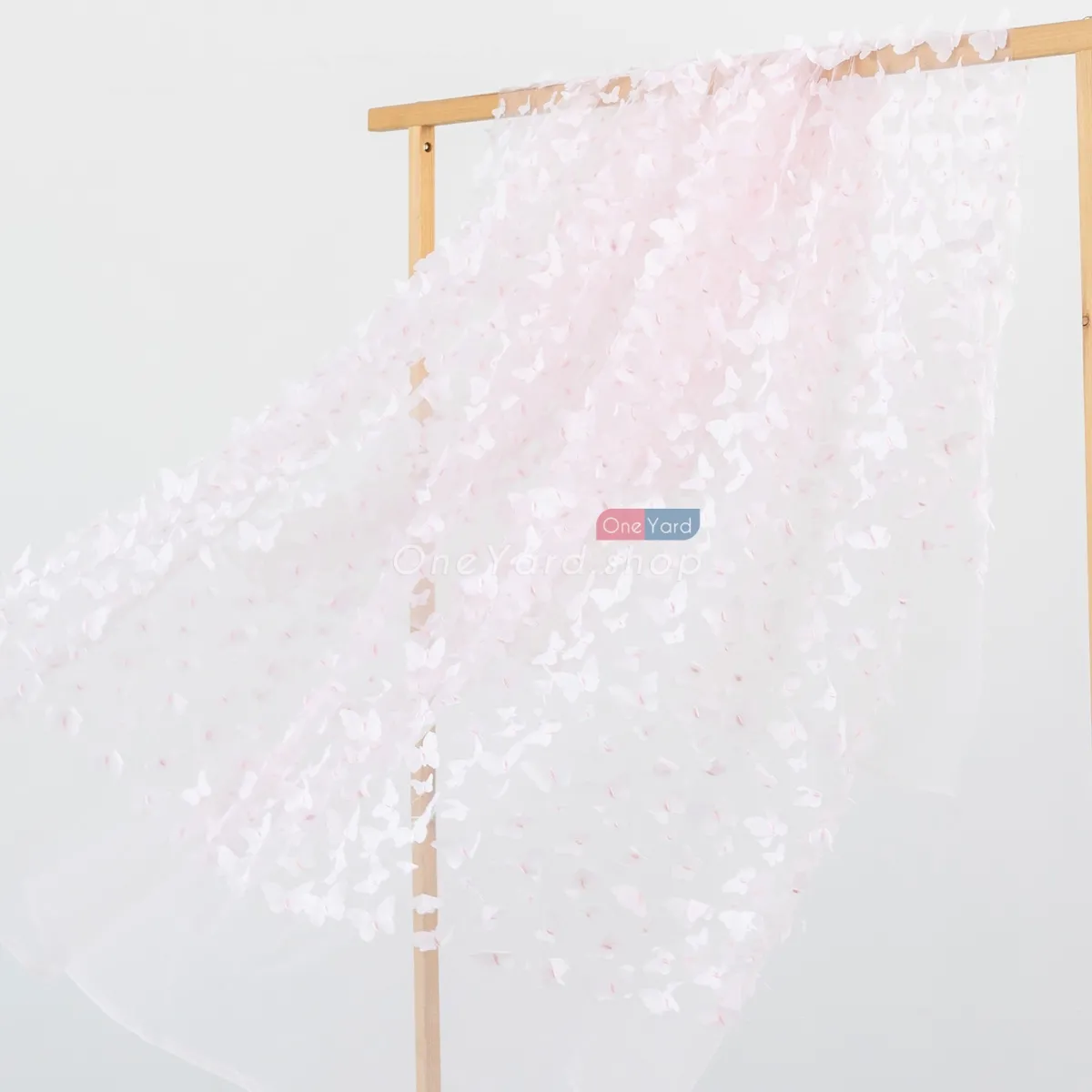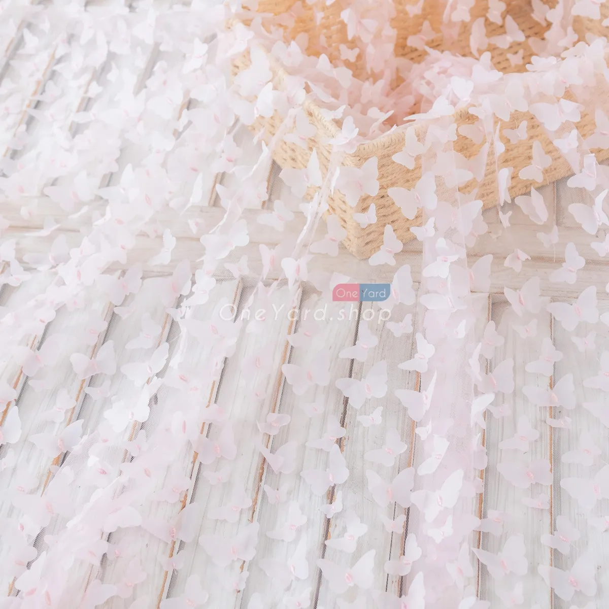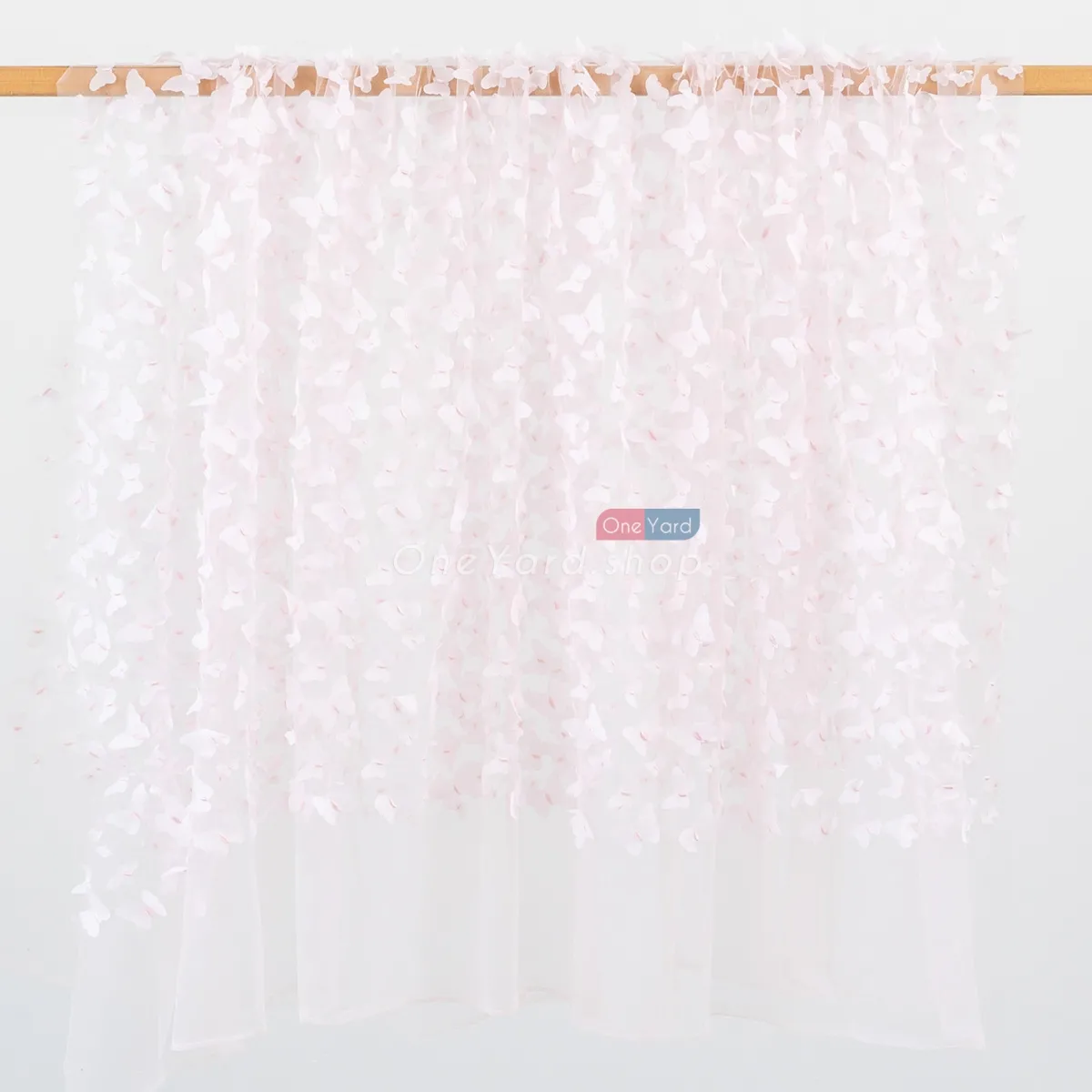 Silver tinsel glitter outlined pale pink 3D butterfly embroidery mesh fabric by the yard. Soft and lightweight pale pink 3d butterflies with tinsel details embroidered on mesh material, used for dressmaking, decorations, backdrops, and more.