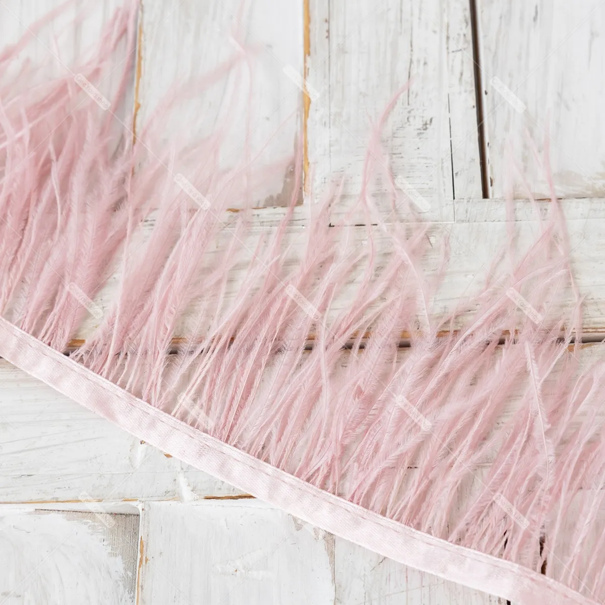 10-15cm width pastel pink feather trim with satin ribbon tape for sale by the yard. Pastel pink real soft ostrich hair feather material for dresses, crafts, decorations, and more.