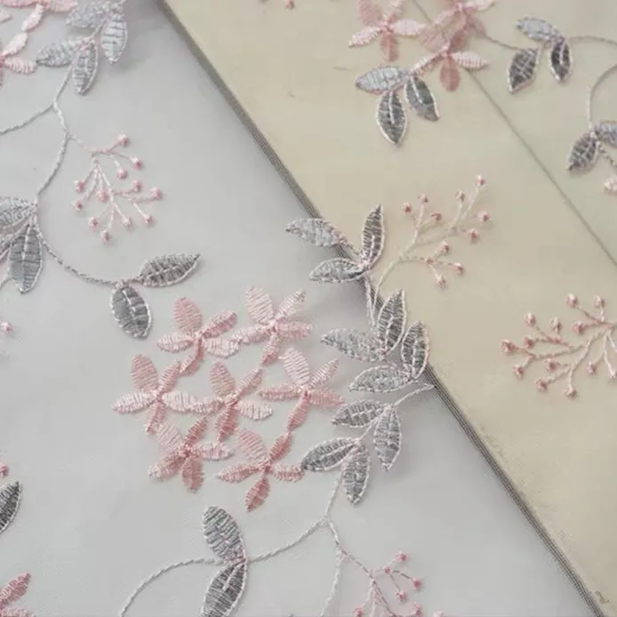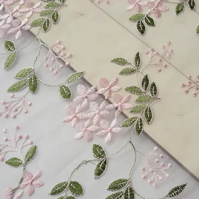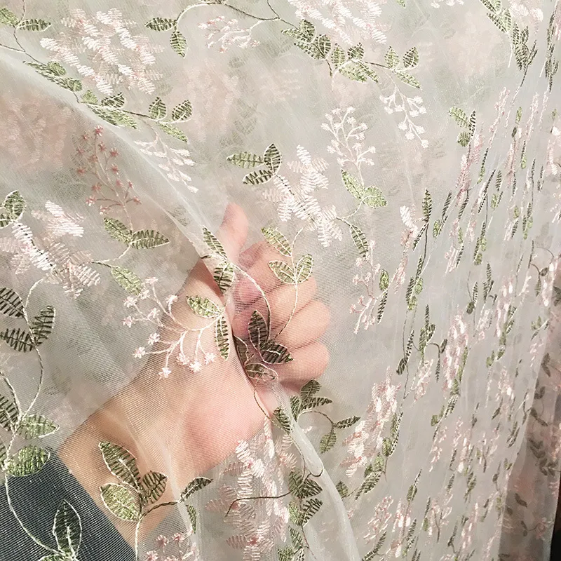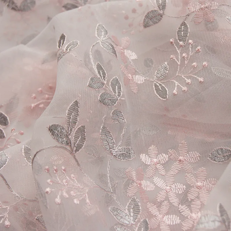 This is an exquisite pink/green and pink/gray embroidered sheer fabric featuring a soft, romantic, floral and leafy motif. The base material is a lightweight tulle, offering a lovely drape and a translucent quality. It's ideally suited for: Overlays for wedding dresses, bridesmaid gowns, or evening wear, elegant sheer curtains, decorative swags, or canopy detailing, embellishments for bags, headbands, or unique textile art.