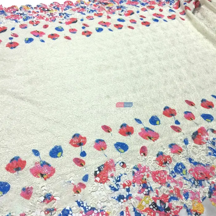 Pink floral printed hollow white chemical lace fabric for sale by the yard. Flowers print lace material for making bridal dresses, wraps, blouses, curtains, and craft projects.