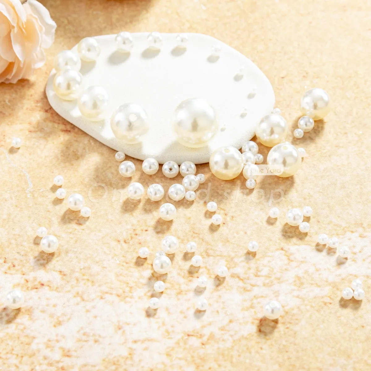 High-luster ivory plastic pearls with pre-drilled holes, designed to mimic the classic elegance of genuine pearls while providing the lightweight durability of modern materials. These round, faux pearls feature a smooth, polished finish with a soft ivory-white sheen. Each bead is pre-drilled with a center-through hole, making them ideal for stringing, sewing onto garments, or incorporating into jewelry designs. The collection offers an expansive range of sizes to suit any project scale, from 3mm to 30mm.