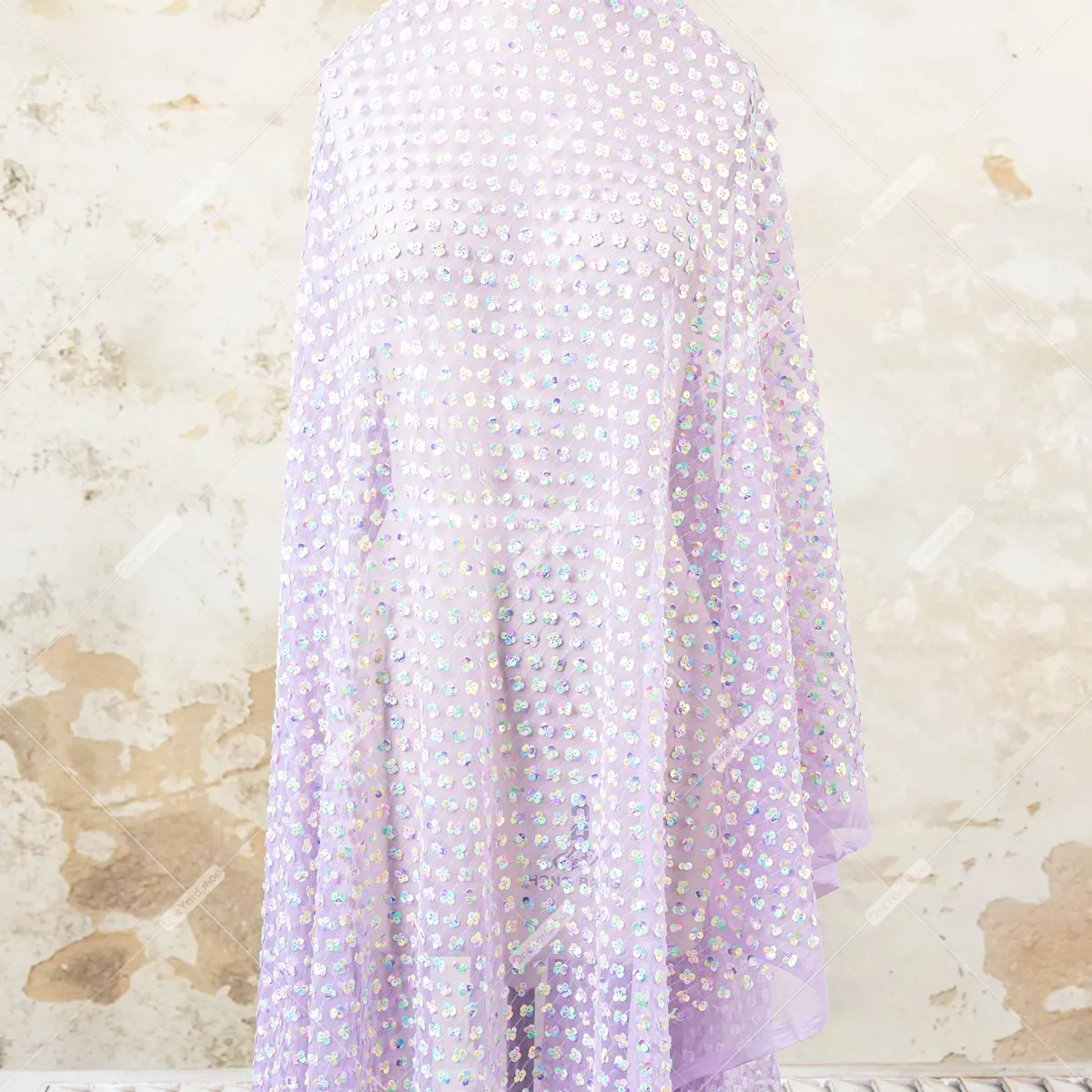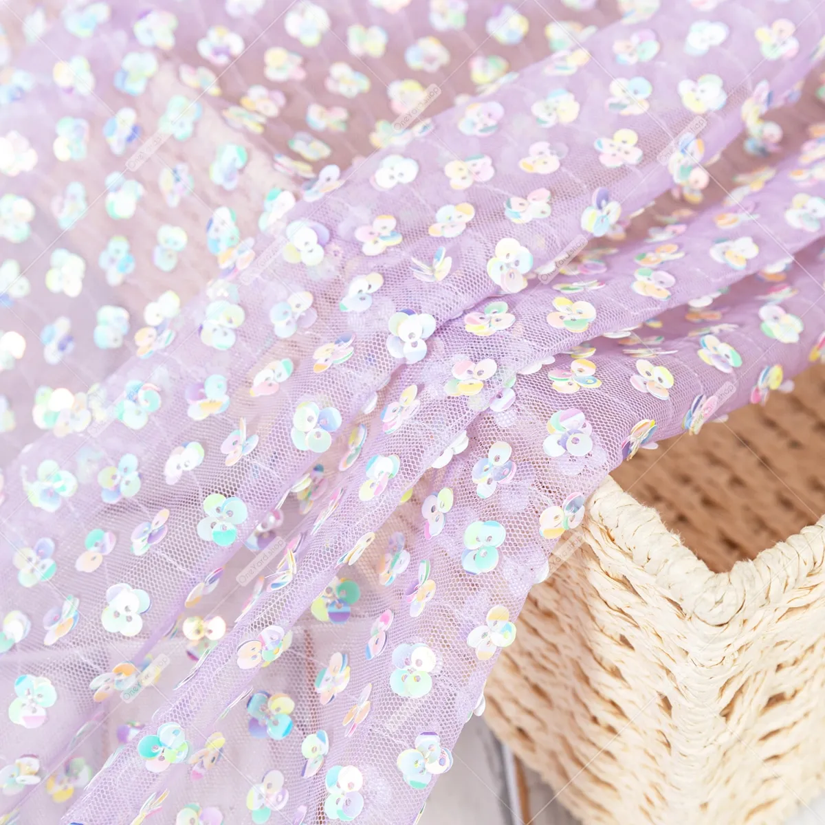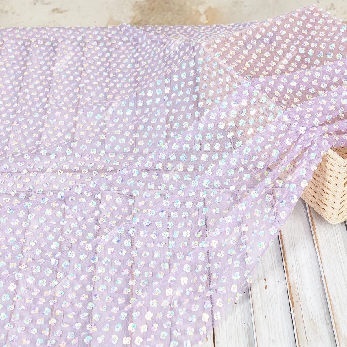 A sheer lilac soft tulle mesh base is lavishly embellished with a dense scattering of small rainbow sequin flowers. The sequins are arranged in charming, clustered patterns that resemble tiny flowers or clover shapes, catching the light to display a captivating spectrum of colors. It's an exquisite choice for eye-catching evening wear, dance costumes, theatrical designs, bridal accents, or any project requiring a touch of shimmering elegance and playful charm.