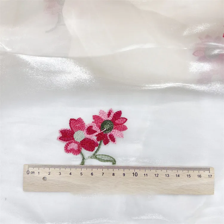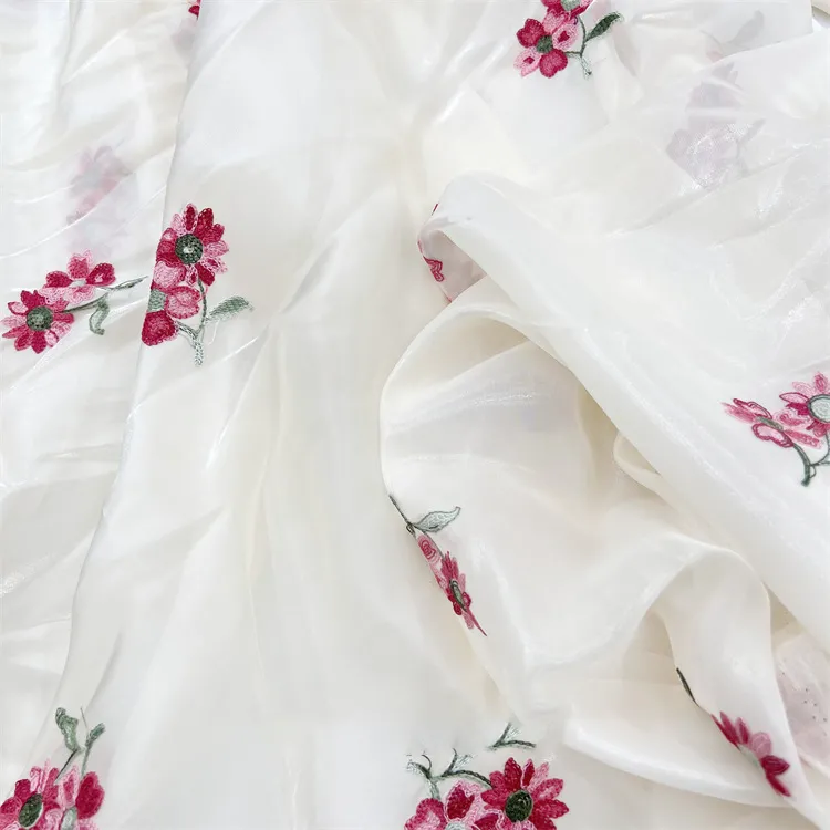 Red Floral Motif Embroidery Ivory/pink Organza Fabric