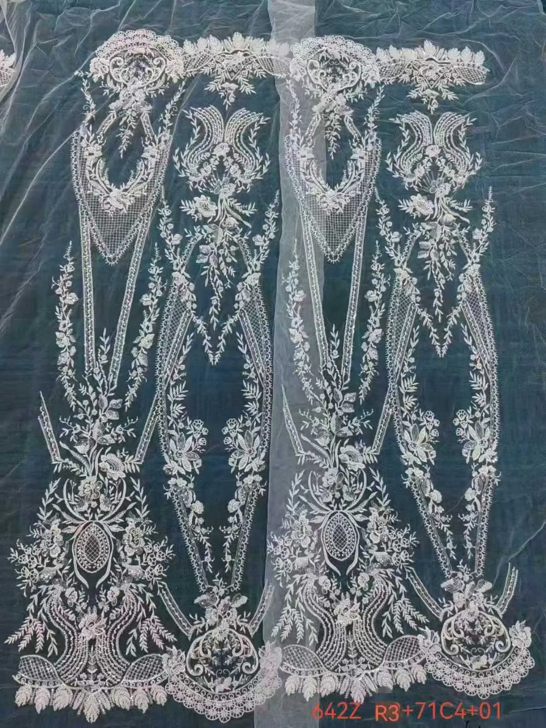 This striking design features lustrous rayon thread and prominent 3D cording, all beautifully illuminated by clear sequins. The most breathtaking feature is its vertically elongating structure: sharp, deep V-shaped (chevron) geometric lattice panels that cascade gracefully down the fabric. These striking architectural lines are intertwined with classic botanical scrollwork and framed by an incredibly ornate, heavy scalloped bottom hem featuring oval lattice cutouts, alongside a refined scalloped top border.