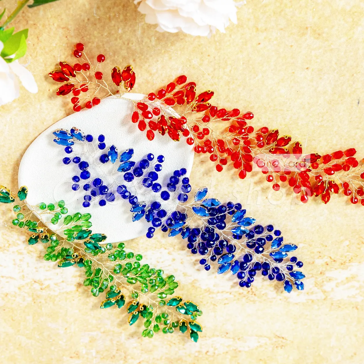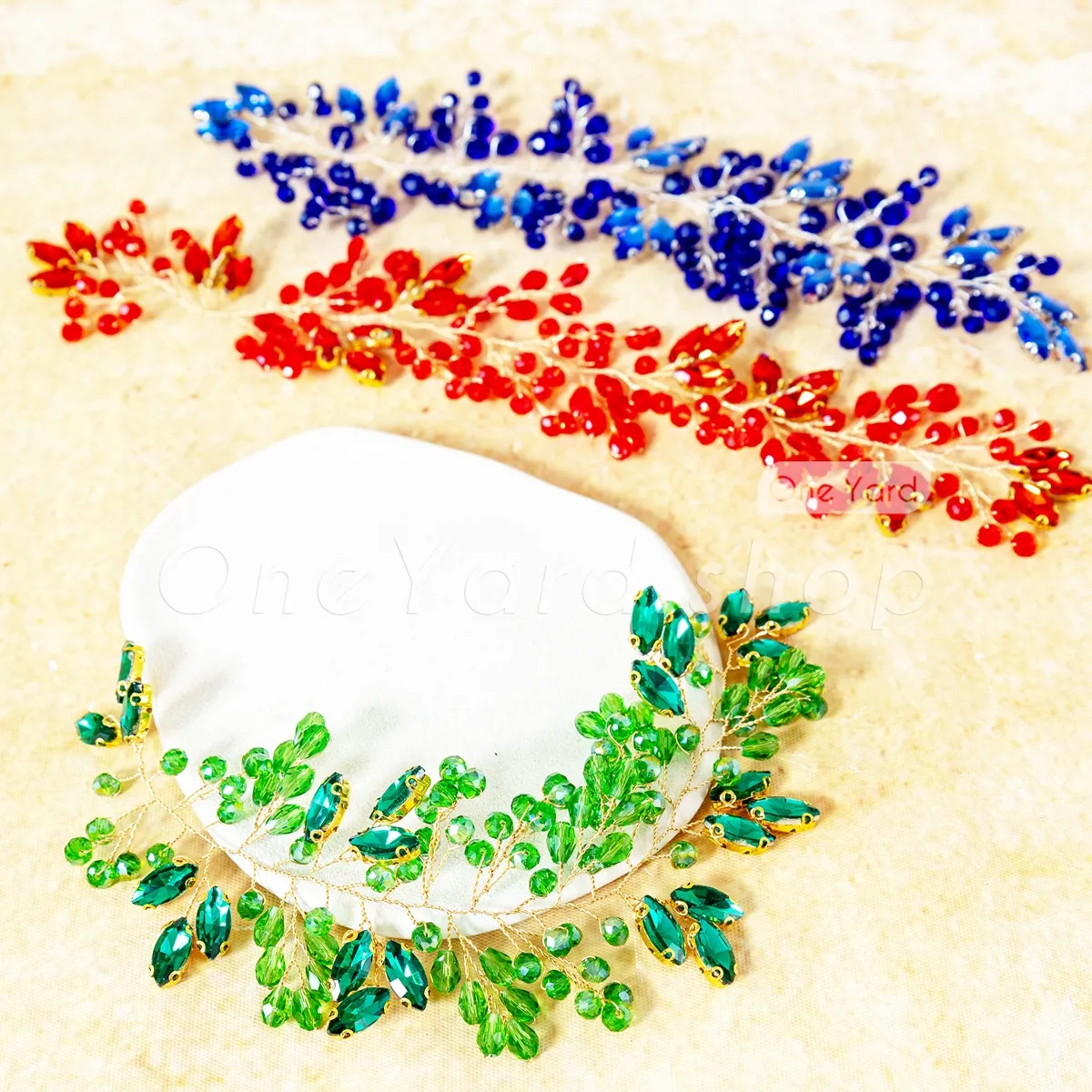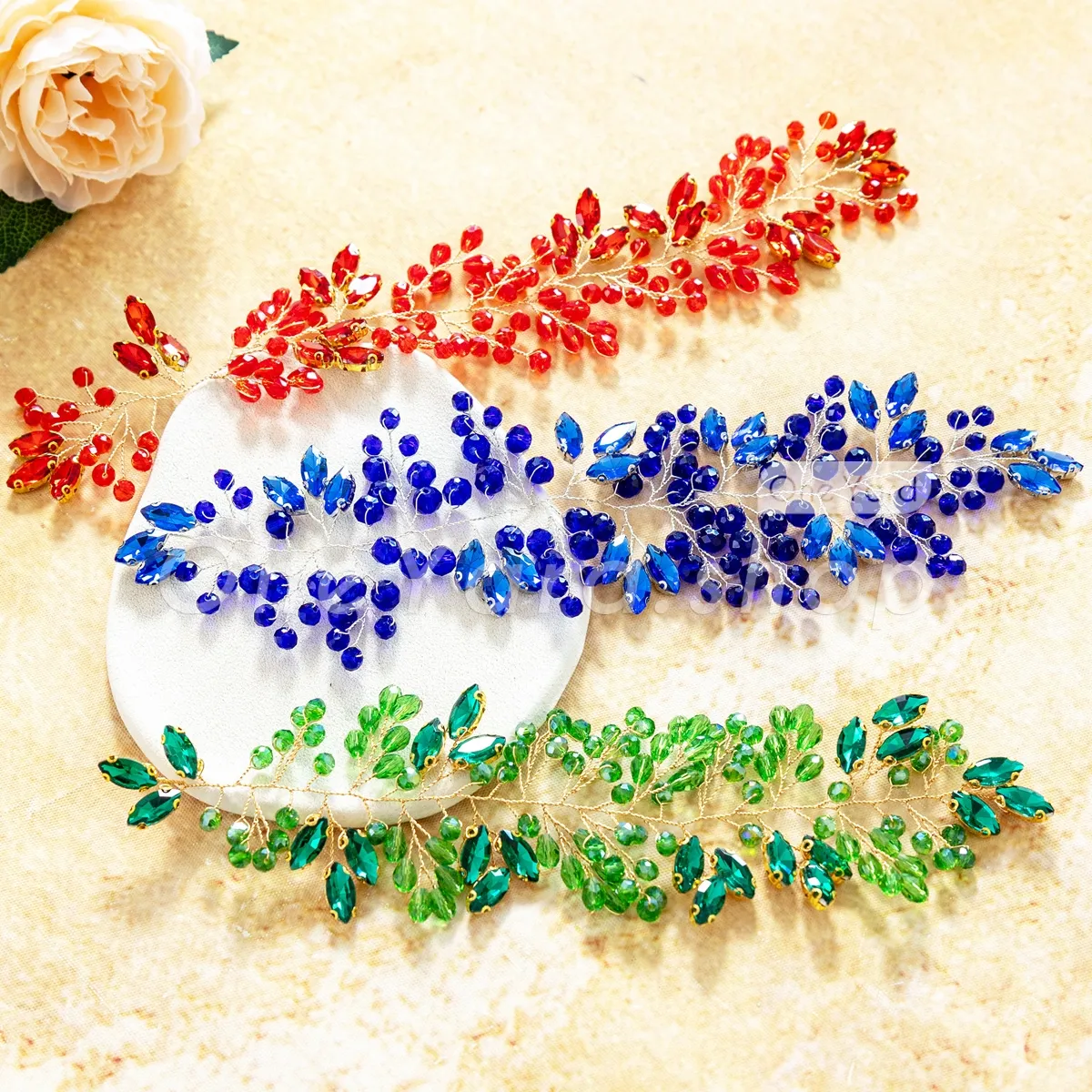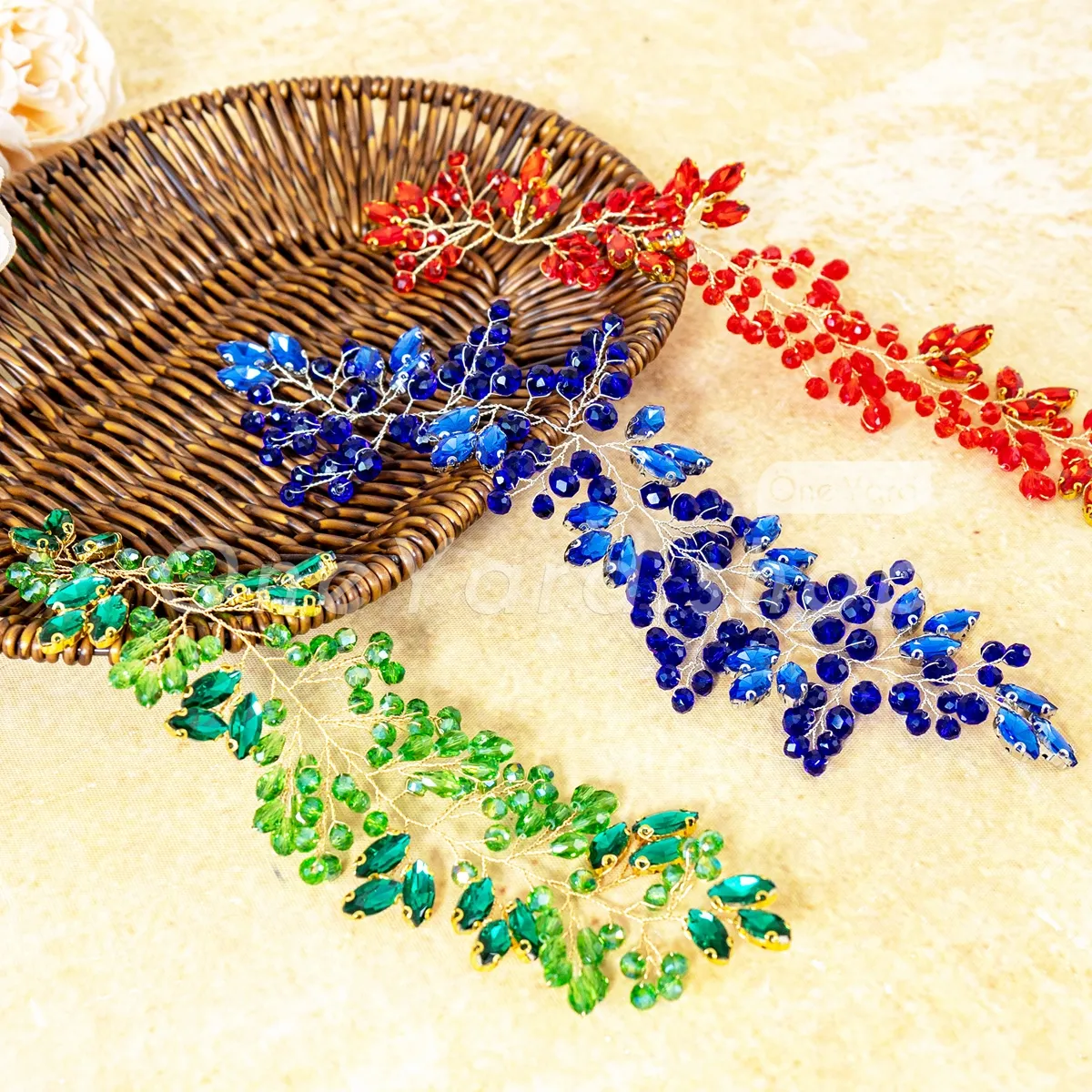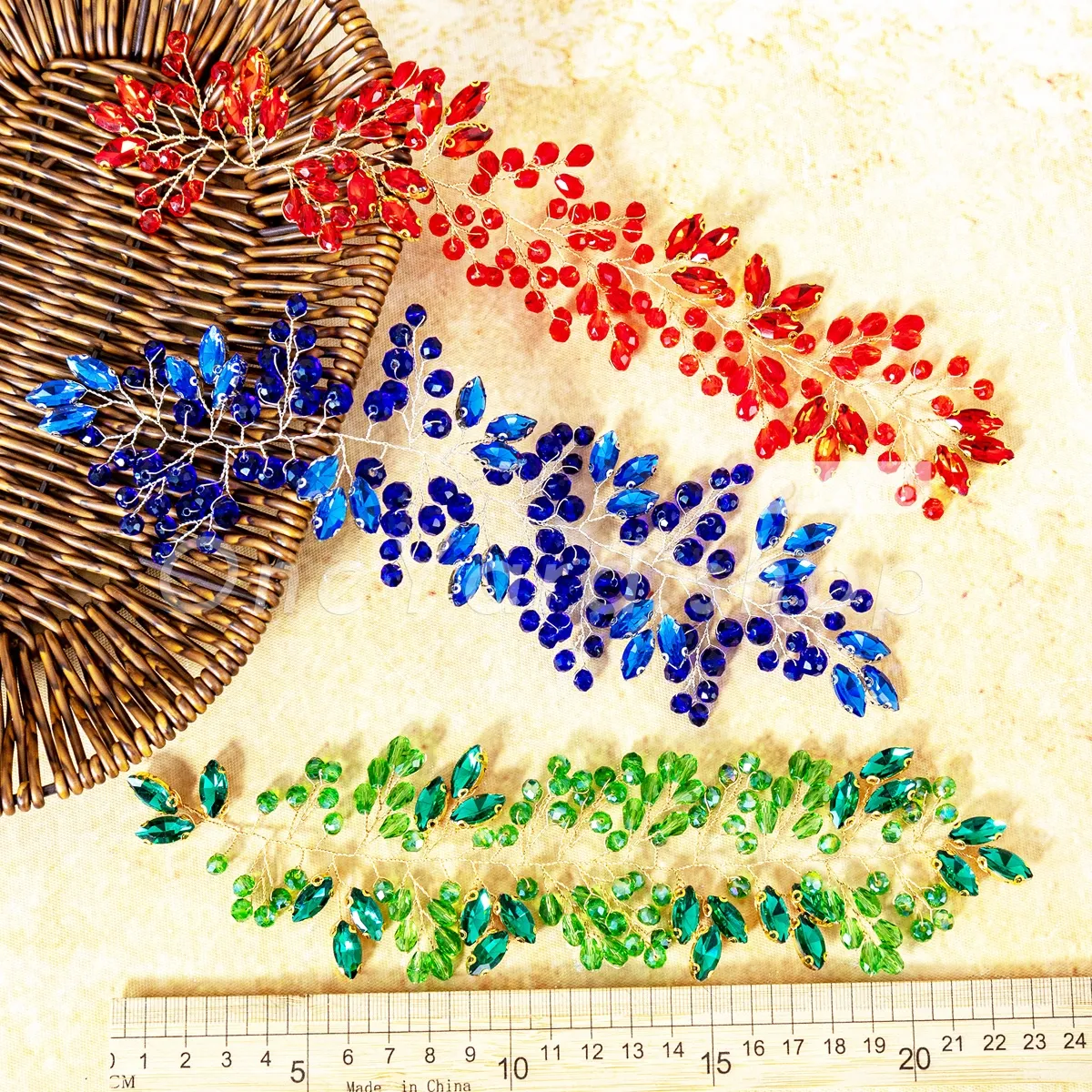 Completely free of any fabric or mesh backing, this exquisite motif is hand-twisted on a soft, malleable gold wire structure. Dazzling with brilliant, faceted acrylic rhinestones—including emerald green, ruby red, and sapphire blue—this trailing vine is designed to provide a brilliant jewelry illusion when applied to garments or accessories. It's a choice for highlighting necklines, cascading along shoulder straps, accentuating beautiful waist sashes, or embellishing bespoke bridal headpieces and sashes.