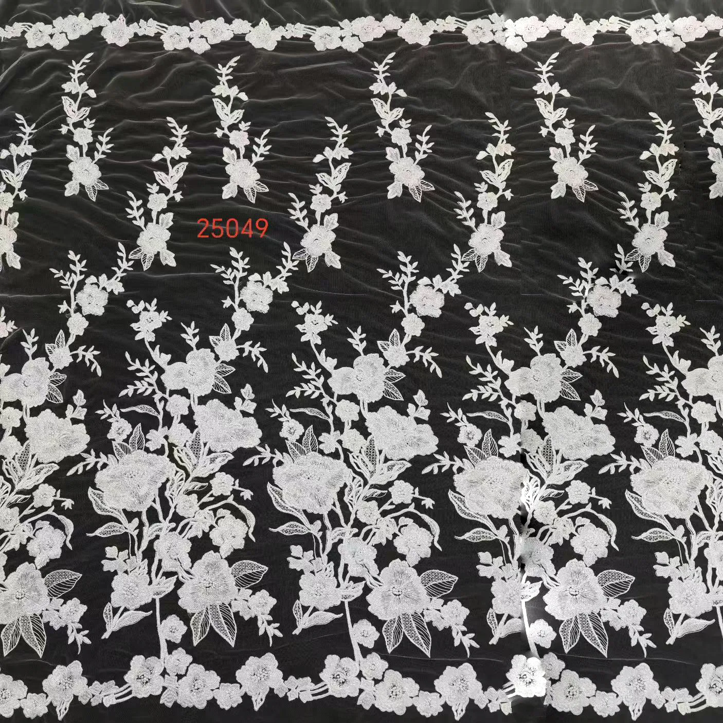 This unique, floral embroidered lace fabric has a distinctive border design. Unlike an all-over pattern, this type of lace is specifically designed to be used with its scalloped edge as a hemline or on a cuff, neckline, or other edge of a garment. From the dense border, the floral and vine motifs gradually thin out and trail upwards, becoming more scattered and delicate as they move up the fabric. This creates a beautiful, romantic "growing" or "trailing" effect.