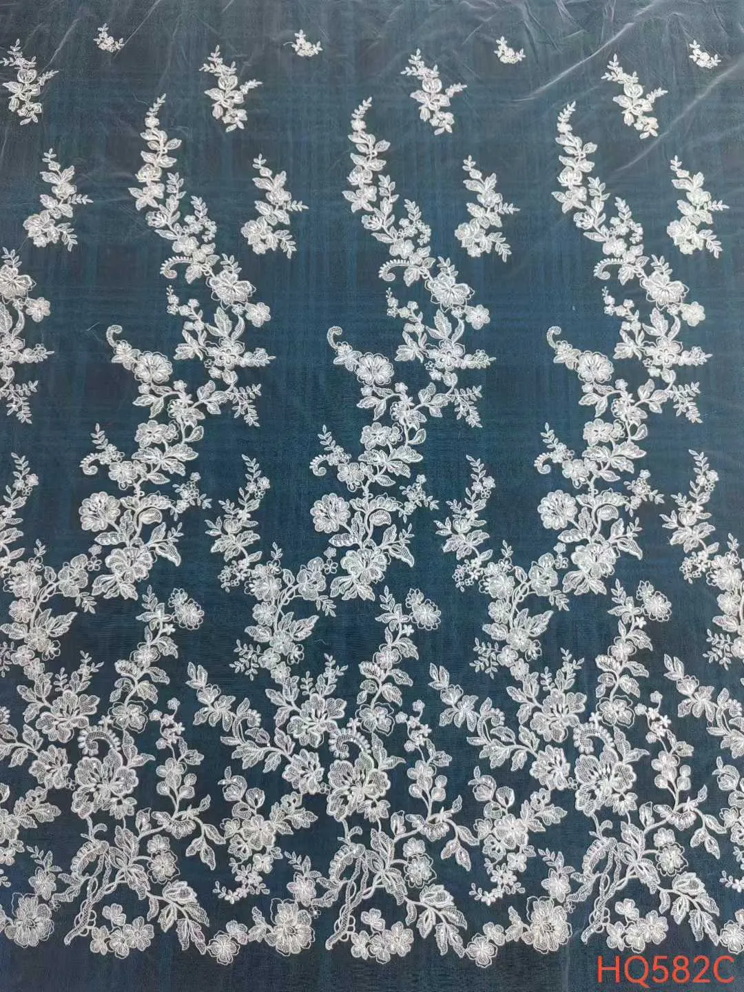 Elevate your bridal or evening wear with the embroidered mesh lace fabric. This enchanting design features continuous, flowing S-curve floral vines adorned with delicate leaf motifs and blooming clusters. Crafted with high-quality embroidery thread and subtly accented with shimmering sequins, it creates a multidimensional texture on a sheer mesh base. The rhythmic, meandering pattern provides a beautiful natural flow, making it ideal for romantic bridal gowns, elegant overlays, and ethereal skirts.