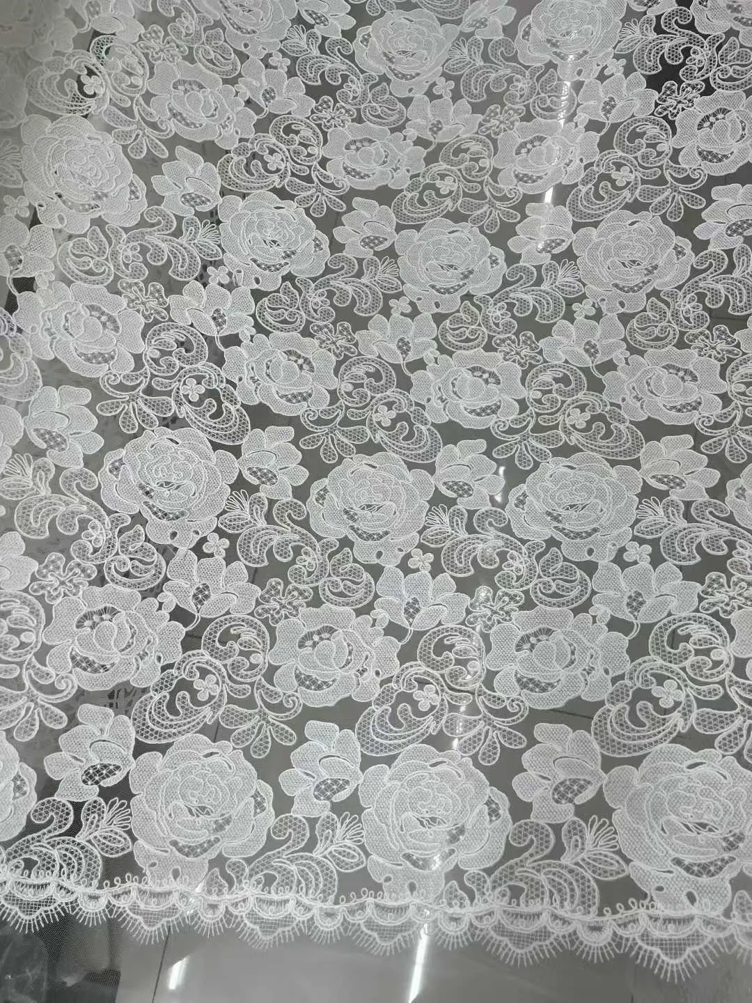 A breathtaking new arrival featuring bold, laser-cut rose floral appliques beautifully arranged on a sheer mesh base. This striking fabric is perfectly finished with a delicate scalloped eyelash border along the edge, offering a flawless blend of modern texture and classic romance. Ideal for crafting statement bridal gowns, stunning ready-to-wear hemlines, and luxurious dresses. Sold by the yard.