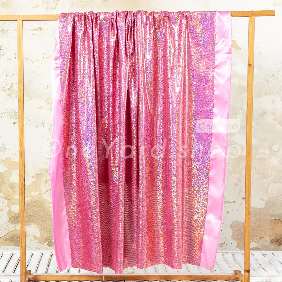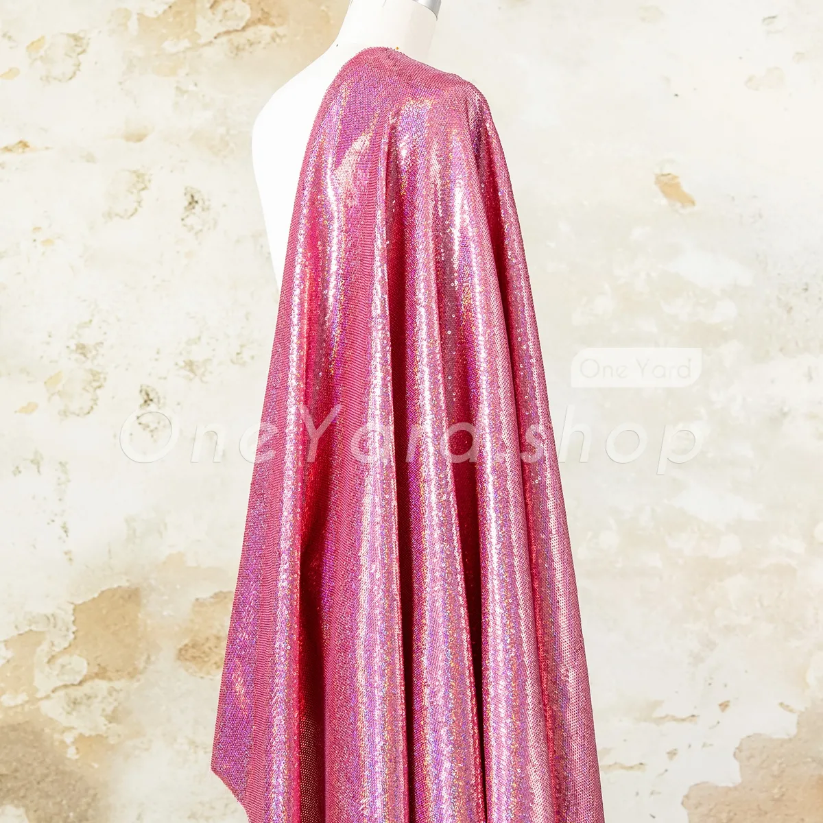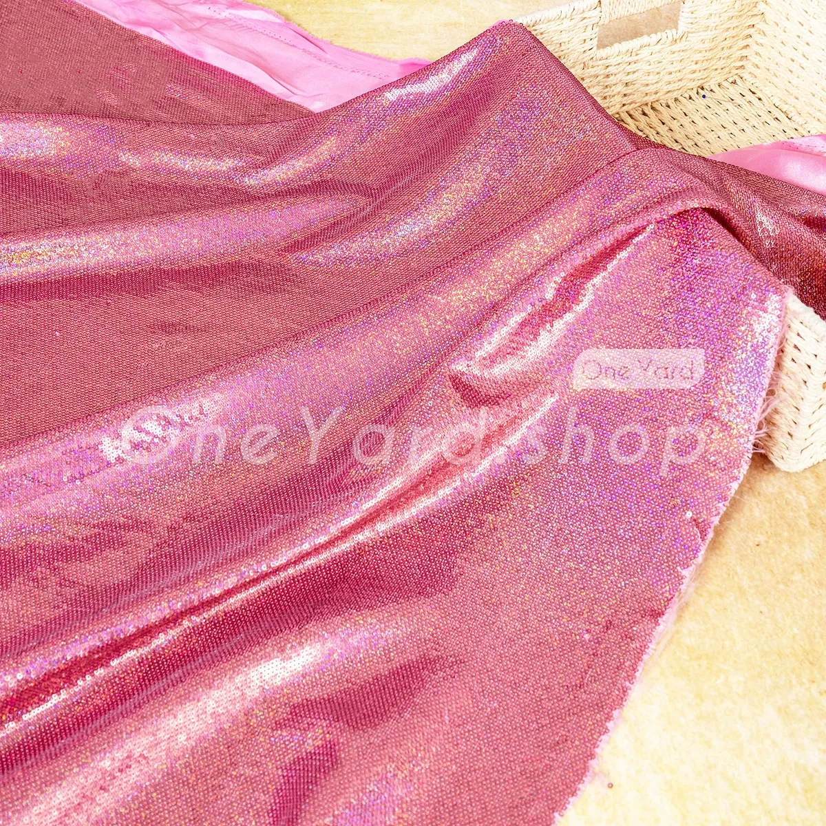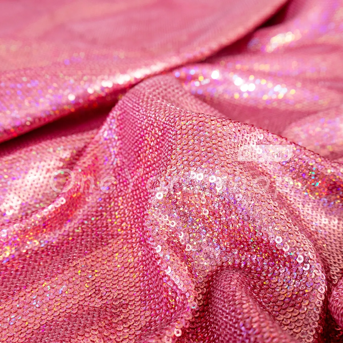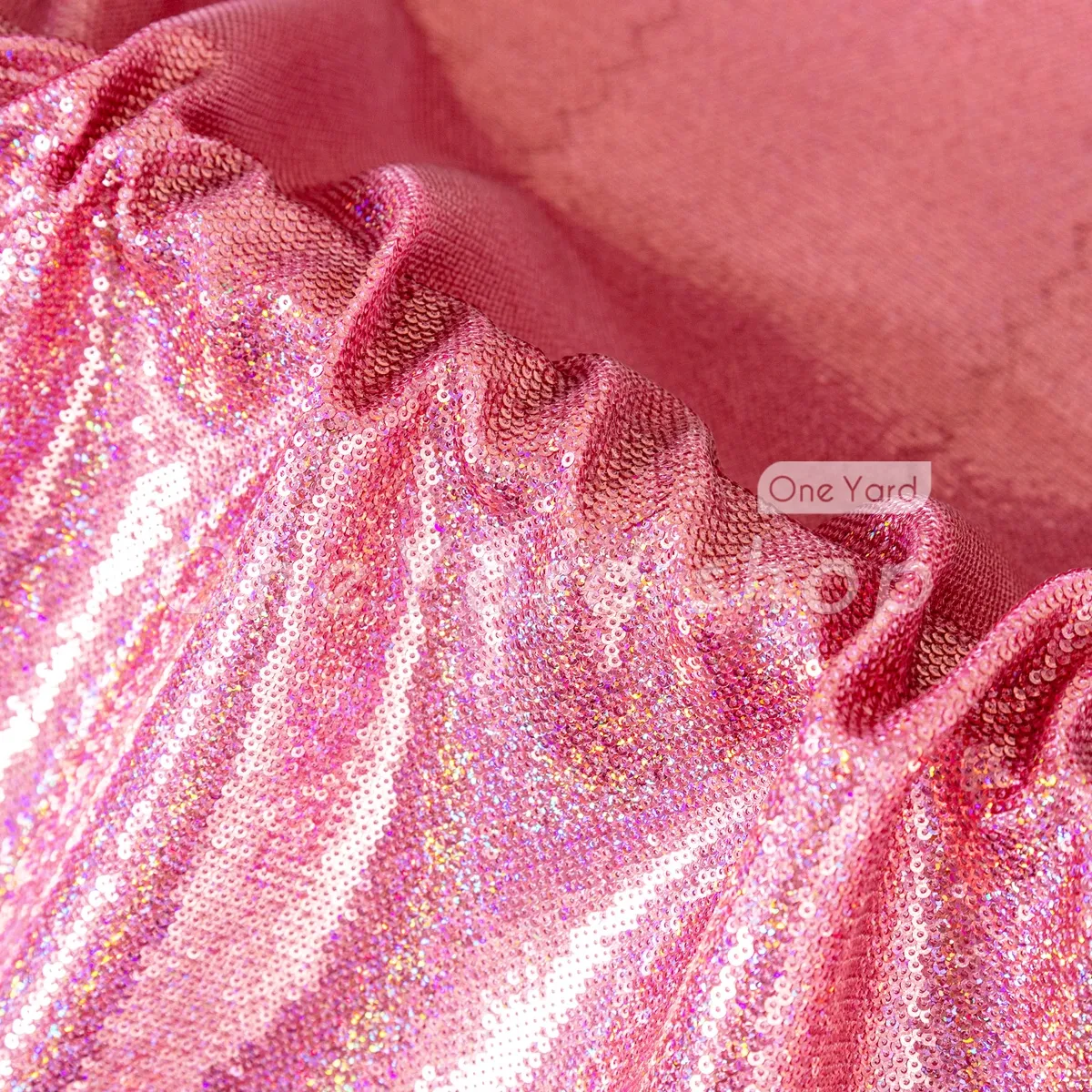This rose pink iridescent sequin satin fabric combines a firm satin base with the brilliant sparkle of all-over sequin embroidery, making it a luxurious choice for structured evening wear and high-end decor. Thousands of petite, high-luster iridescent rose pink sequins are densely sewn onto the satin, reflecting a stunning multi-color spectrum that shifts with light and movement.