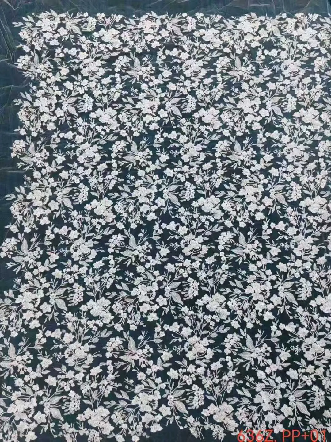 Crafted using durable premium threads (PP thread), this breathtaking floral lace features an incredibly dense, all-over pattern of delicate ditsy florals, blossoming branches, and petite leaves on a sheer mesh base. The intricate botanical embroidery is beautifully illuminated by a generous scattering of light-catching sequins, creating a magical, starry sparkle with every movement. It is the perfect choice for crafting fairycore dresses, woodland bridal gowns, sheer overlays, and flower girl dresses.