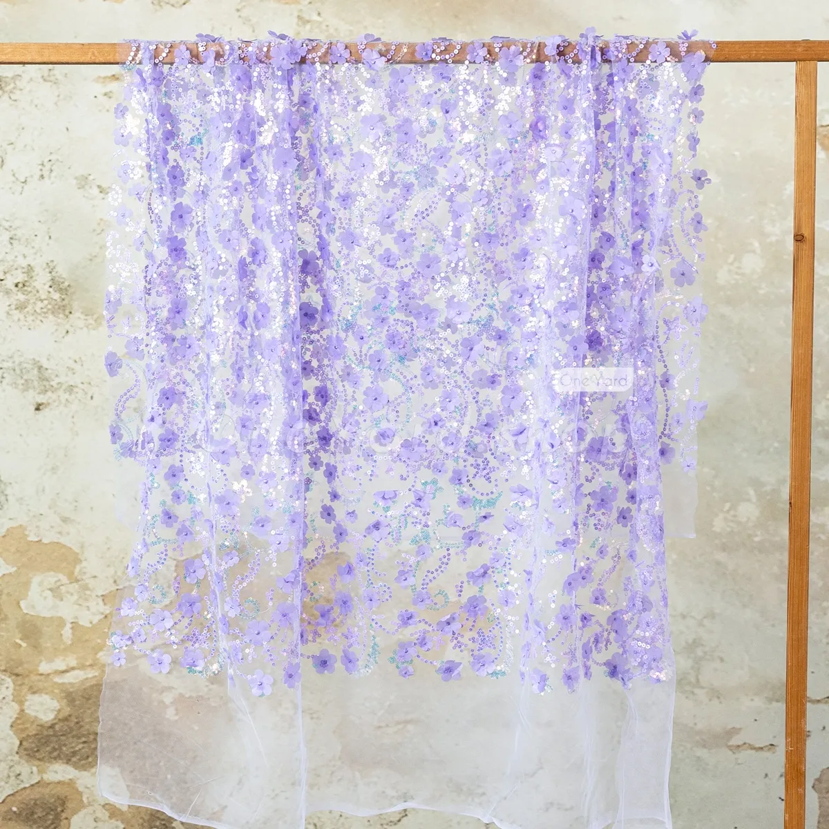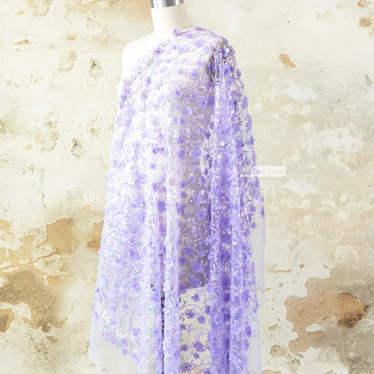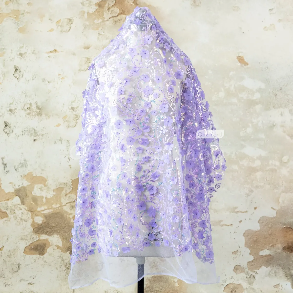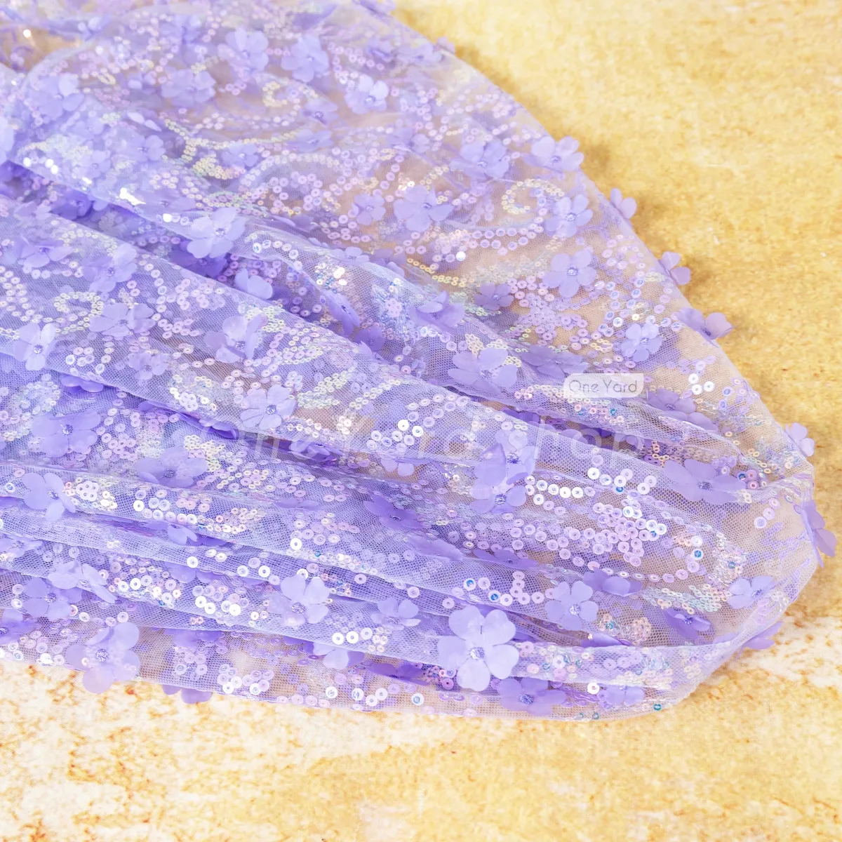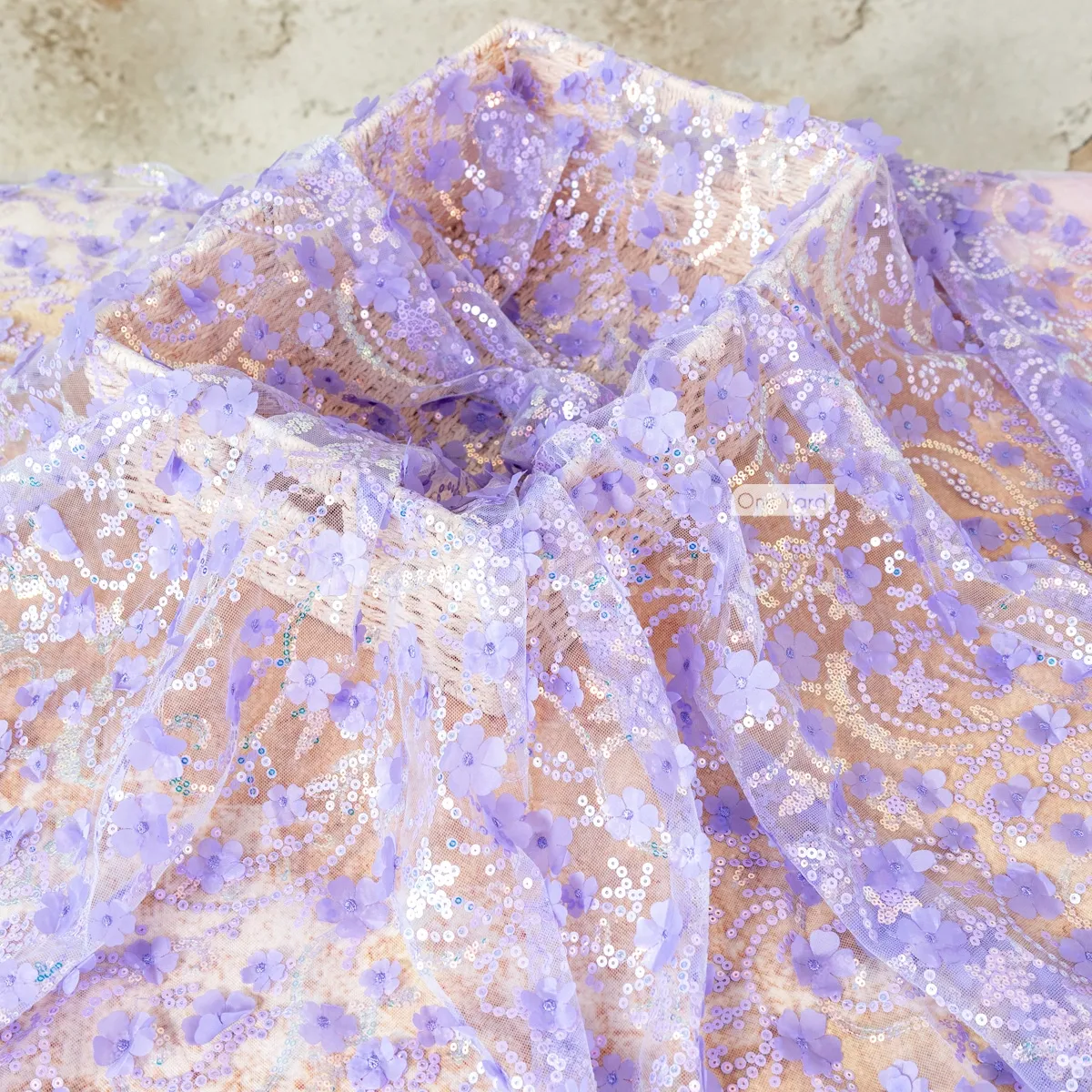 Bring a fairytale vision to life with this breathtaking sequinned lavender 3D flower mesh fabric. This fabric features a delicate lavender soft mesh base adorned with a mesmerizing combination of light-catching iridescent sequins and soft, three-dimensional small flower appliqués. It's perfect for prom & Quinceañera dresses, flower girl dresses, overlays & capes, and more.