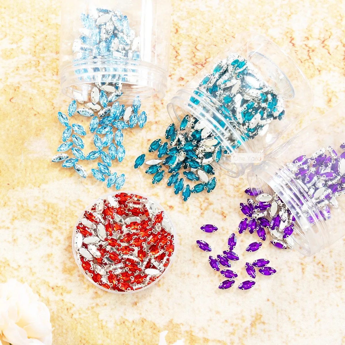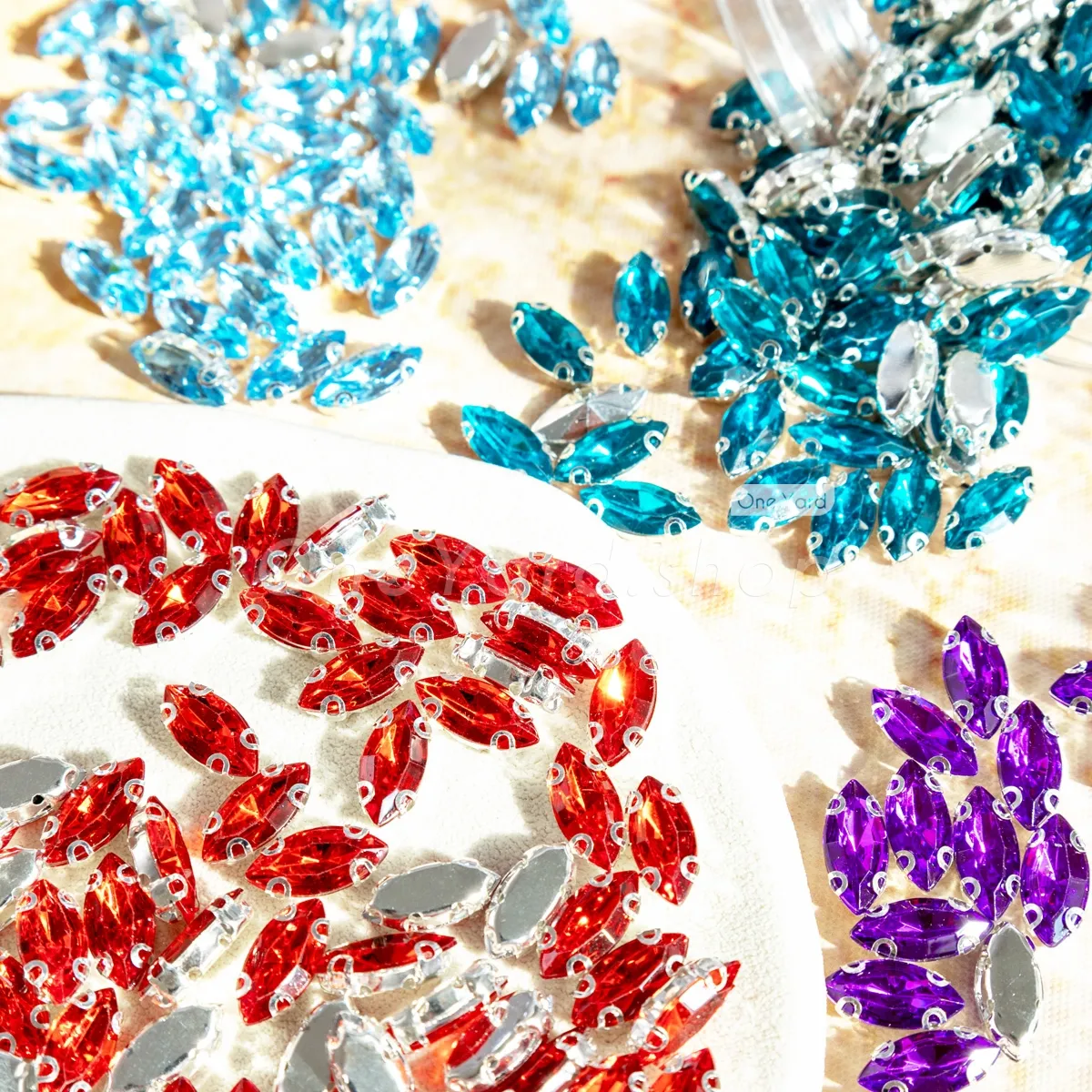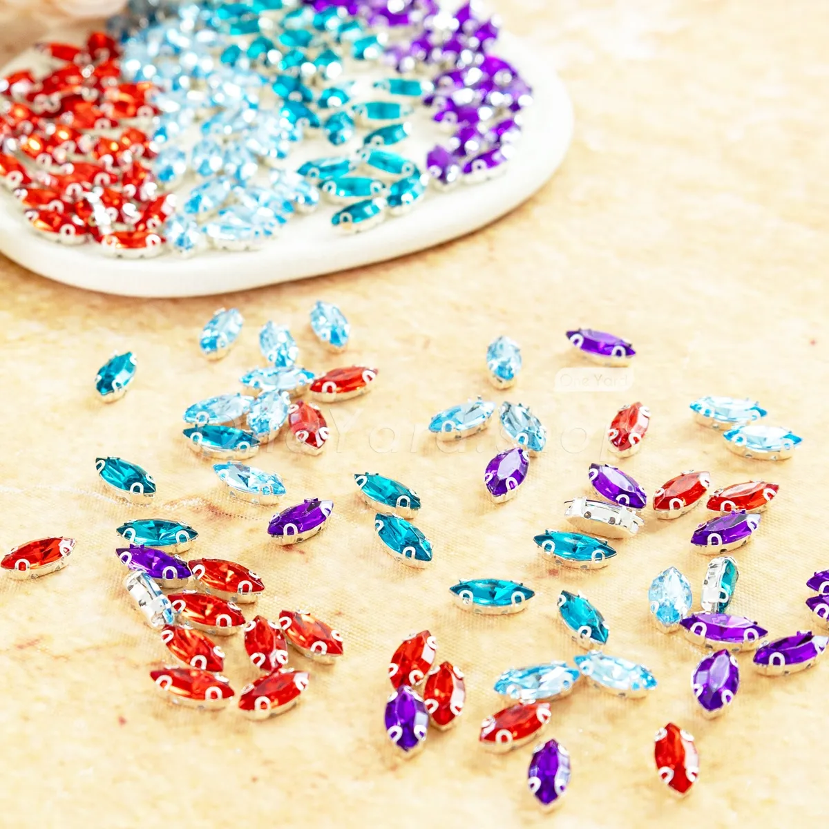 Add a splash of bold color to your projects with these 7x15mm lightweight acrylic sew-on stones. Designed in the classic Horse Eye (Navette) shape, they offer a brilliant pop of color and are an alternative to glass crystals. Each stone is securely mounted in a silver metal claw setting(4 sewing holes allowing you to stitch them firmly onto fabric, leather, or mesh) that protects the edges of the acrylic. Applications: cosplay and theatrical costumes, prom dresses, craft projects needing bulk embellishment.