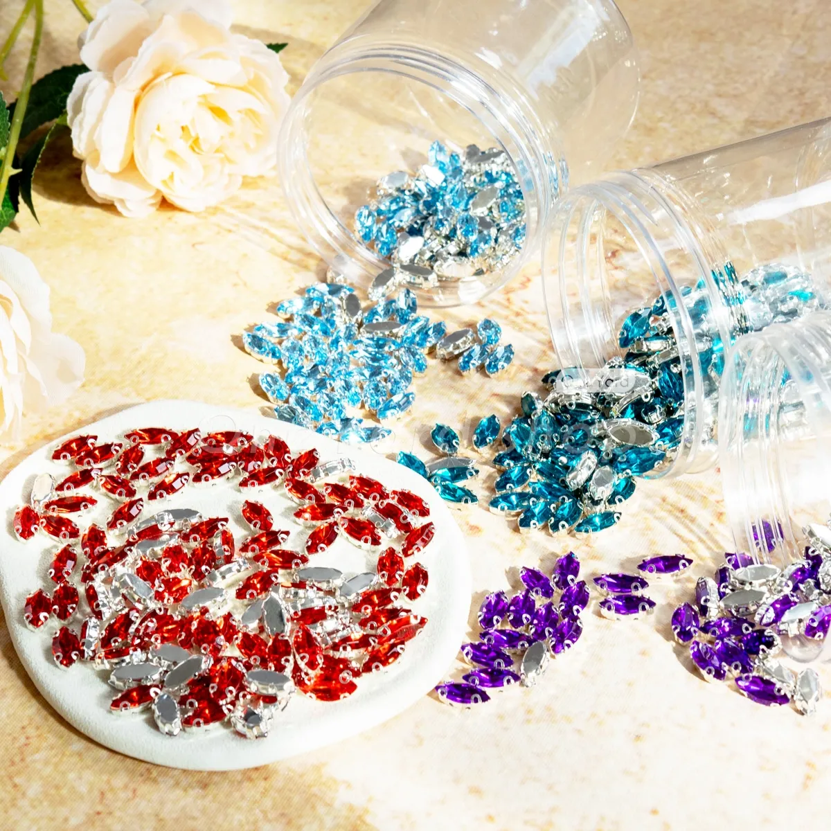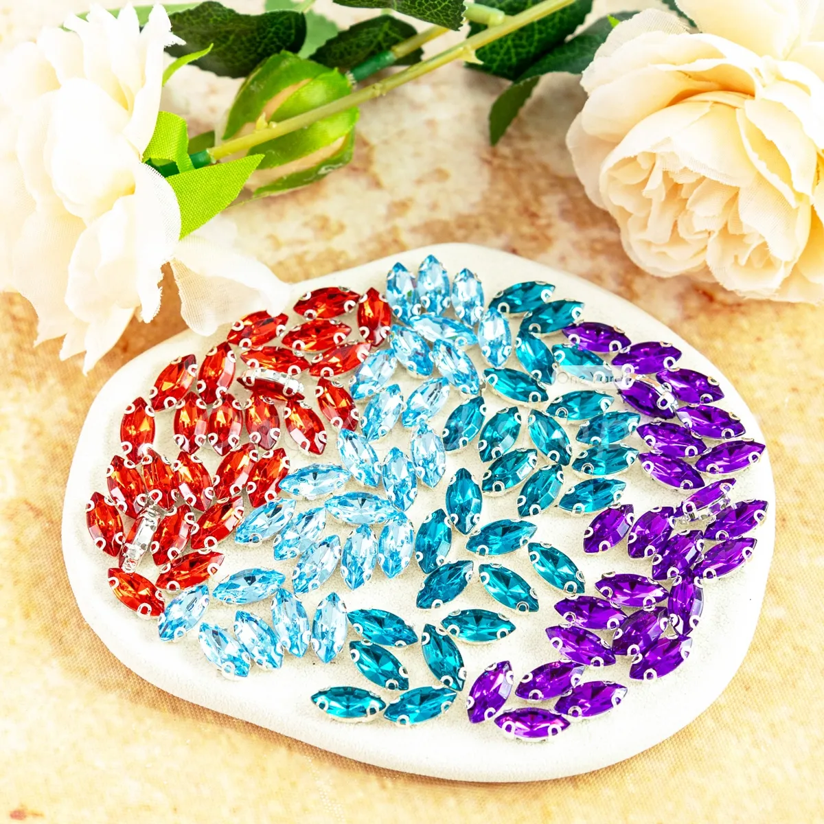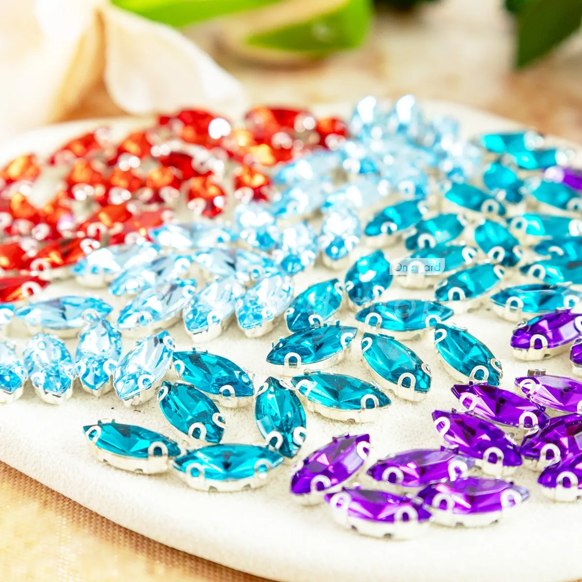 Add a splash of bold color to your projects with these 7x15mm lightweight acrylic sew-on stones. Designed in the classic Horse Eye (Navette) shape, they offer a brilliant pop of color and are an alternative to glass crystals. Each stone is securely mounted in a silver metal claw setting(4 sewing holes allowing you to stitch them firmly onto fabric, leather, or mesh) that protects the edges of the acrylic. Applications: cosplay and theatrical costumes, prom dresses, craft projects needing bulk embellishment.