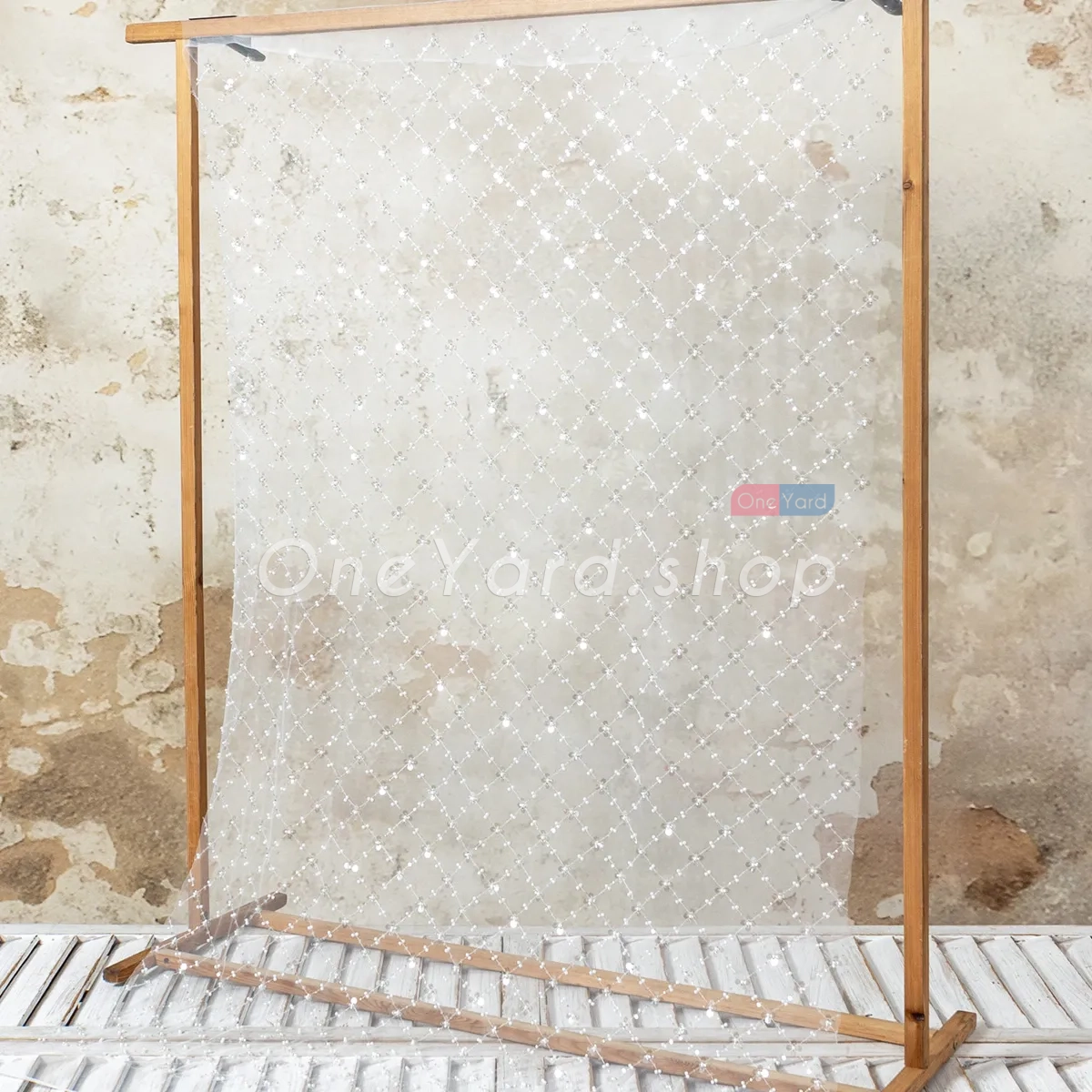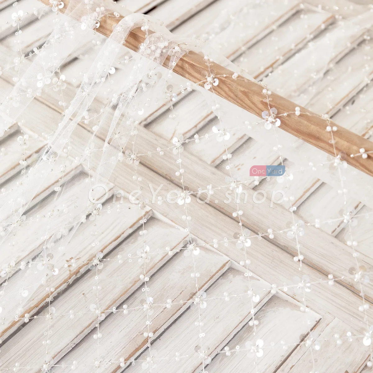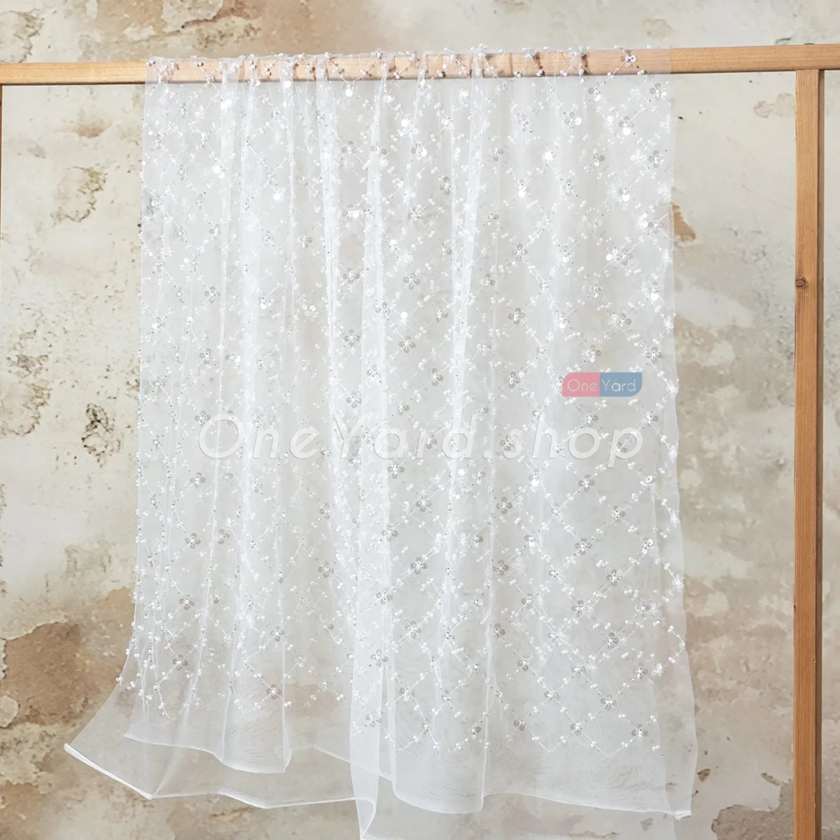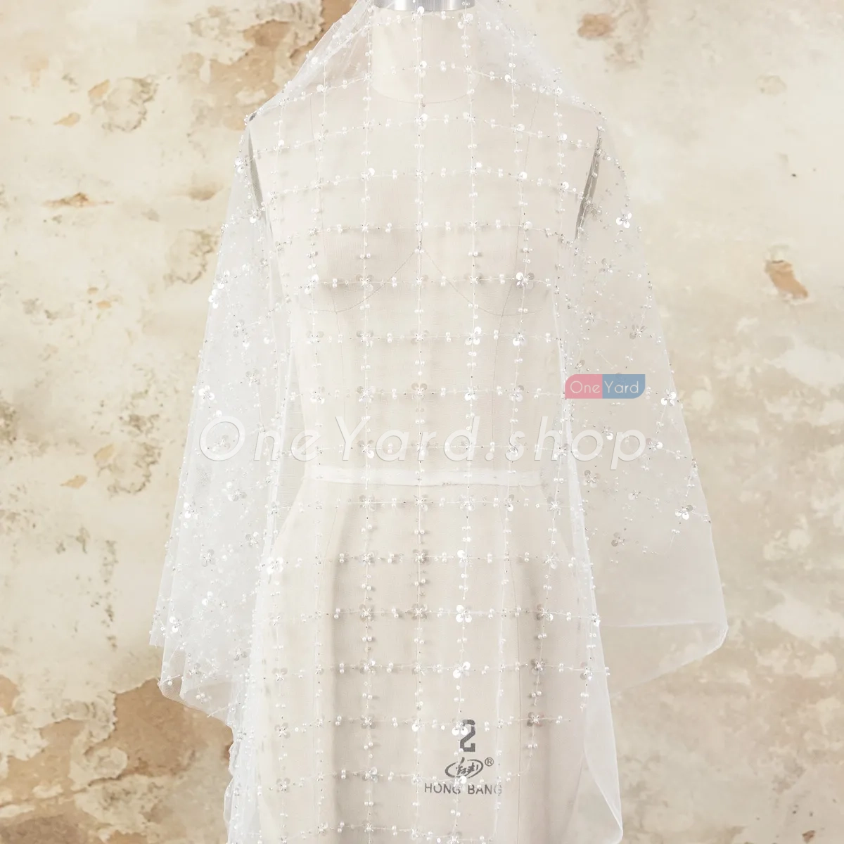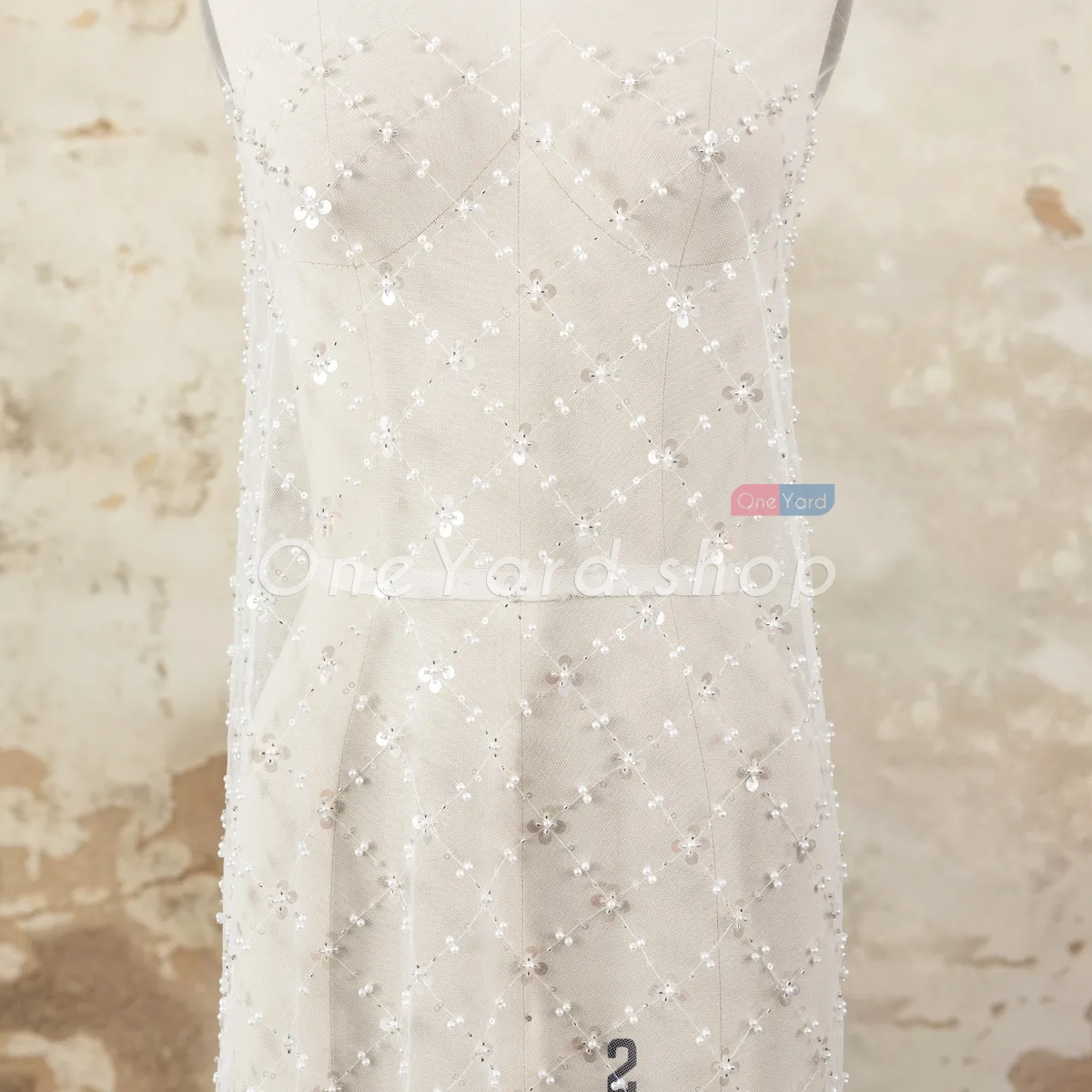 Sparkly silver bead, sequin, and pearl flowers with a grid pattern embellished on light and airy off-white mesh material. The silver-white fabric is adorned with a grid pattern of small beading flowers, giving the fabric a structured yet delicate appearance. It would be suitable for overlays, veils, bridal wear, evening gowns, or other delicate garments where a touch of sparkle is desired.
