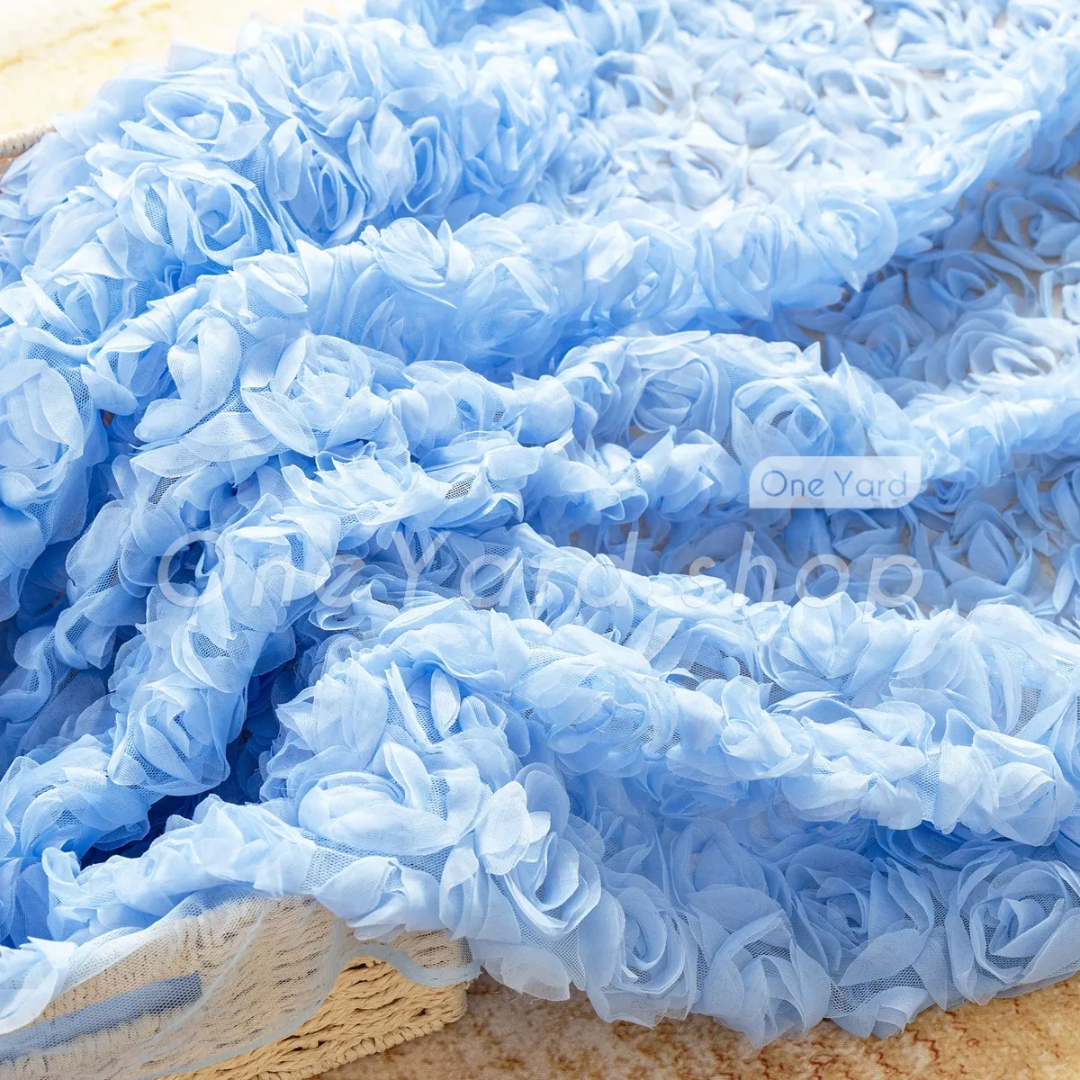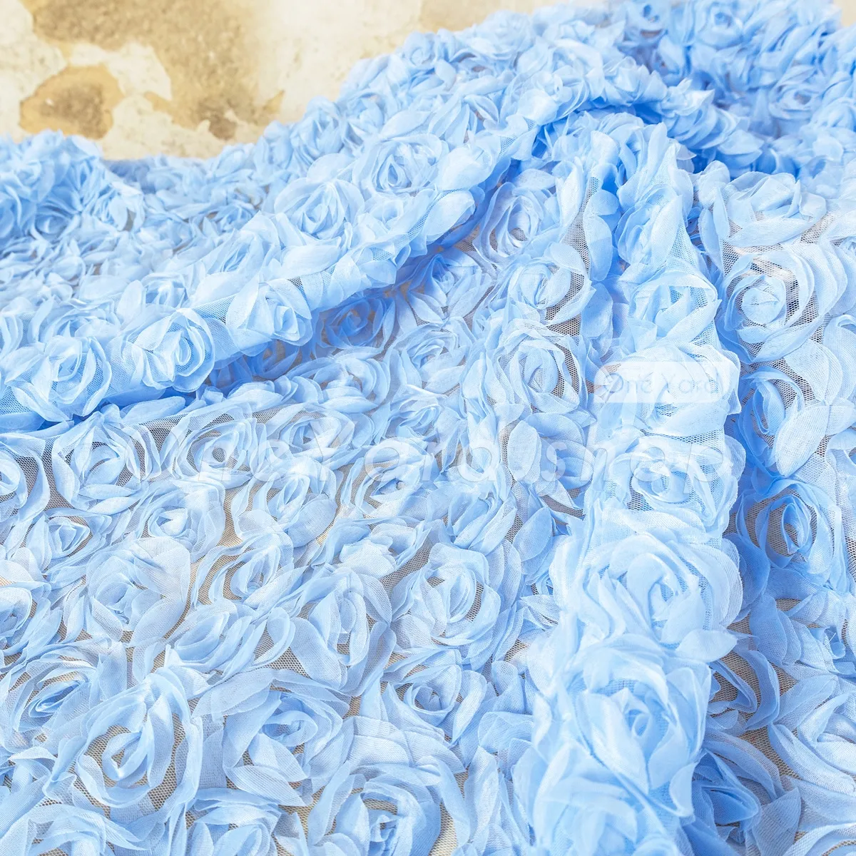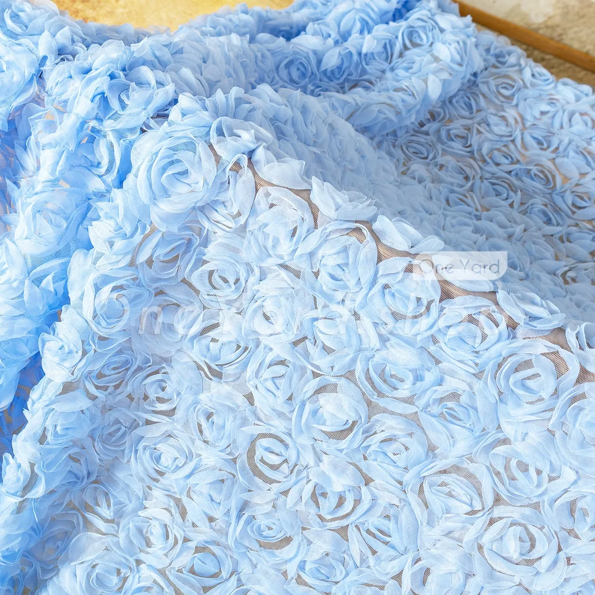 This charming sky blue 3D rosette tulle embroidery fabric offers a romantic, high-texture design that is perfect for creating special occasion dresses and dreamy event decor. The rosettes are anchored to a fine, sheer tulle mesh that provides a lightweight and breathable foundation. The consistent sky blue tone provides a delicate and calming aesthetic suitable for bridal, baby, or formal themes.