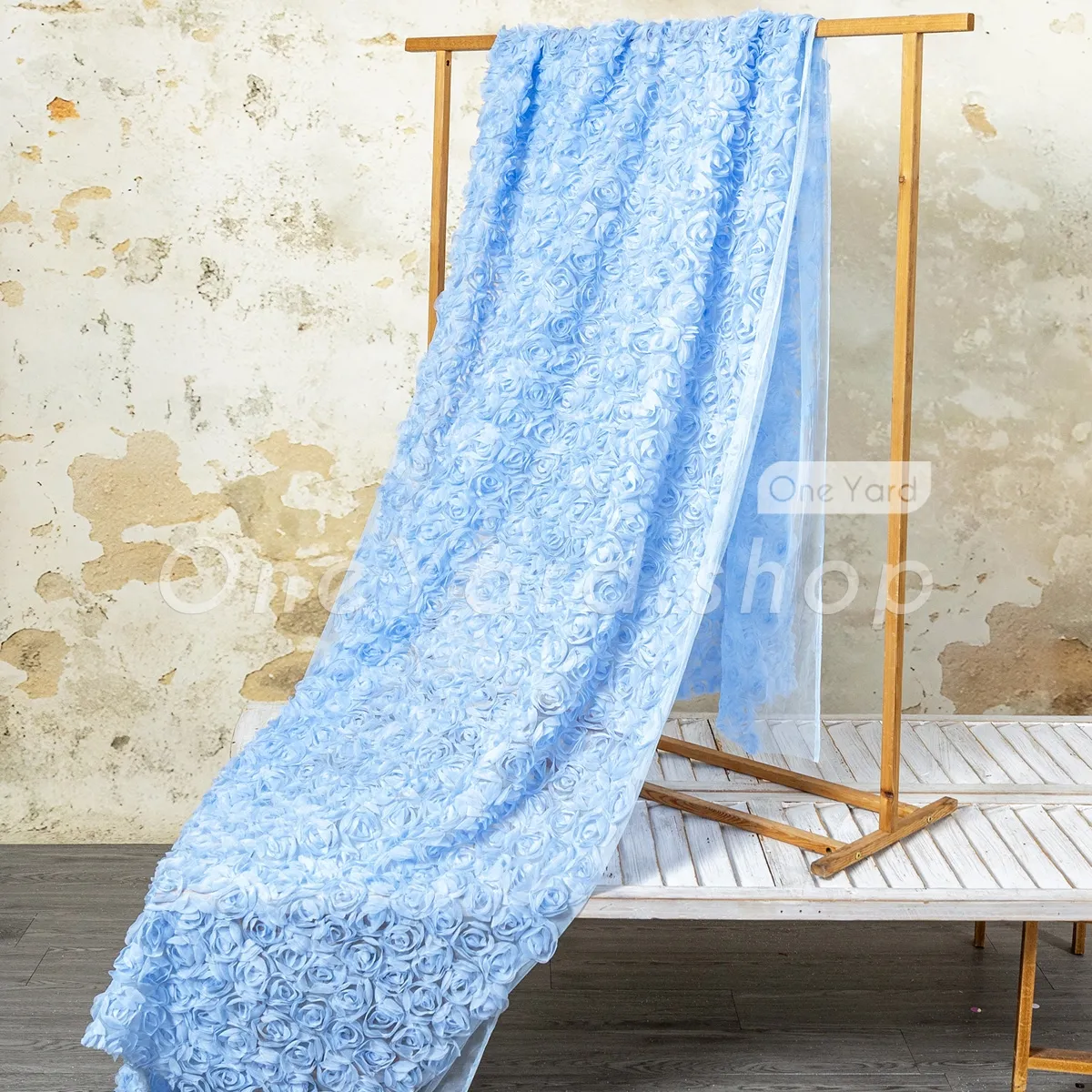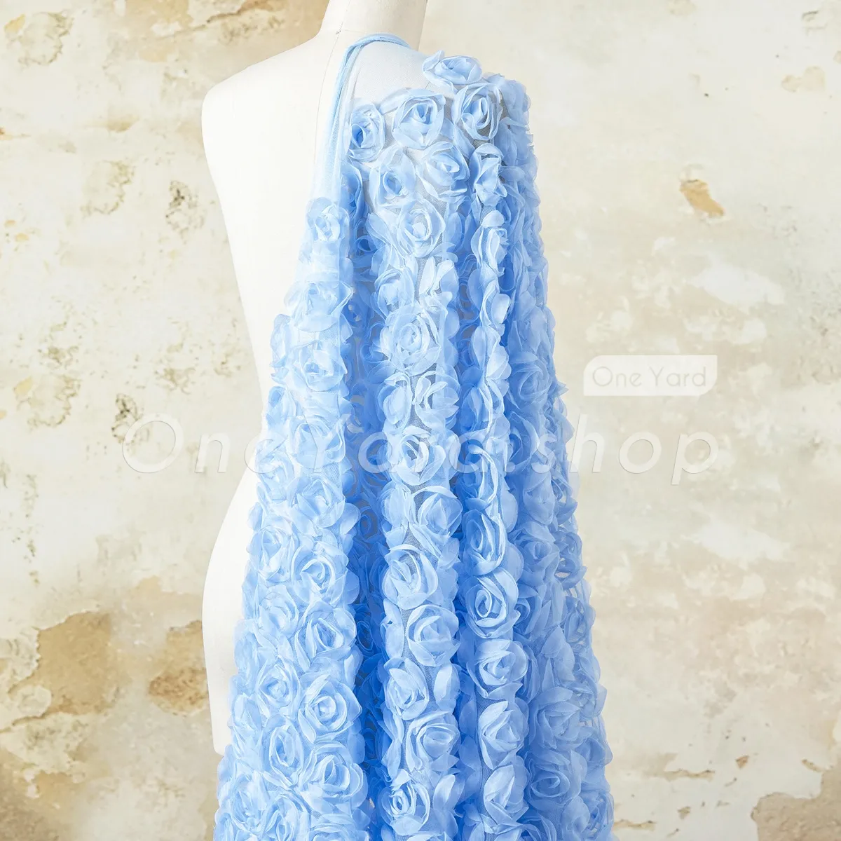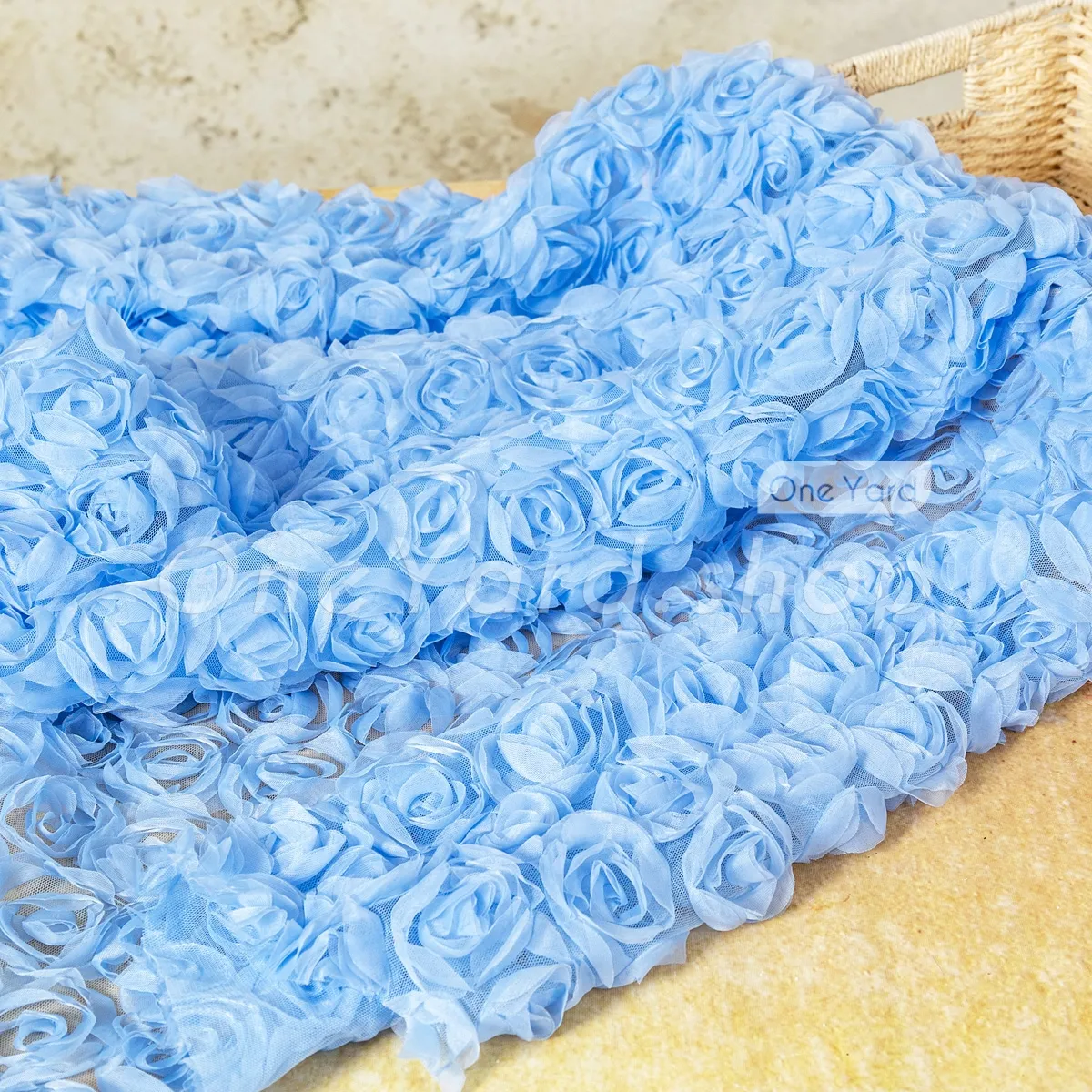 This charming sky blue 3D rosette tulle embroidery fabric offers a romantic, high-texture design that is perfect for creating special occasion dresses and dreamy event decor. The rosettes are anchored to a fine, sheer tulle mesh that provides a lightweight and breathable foundation. The consistent sky blue tone provides a delicate and calming aesthetic suitable for bridal, baby, or formal themes.