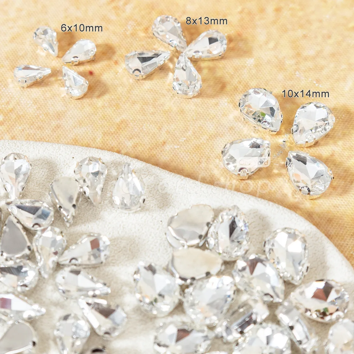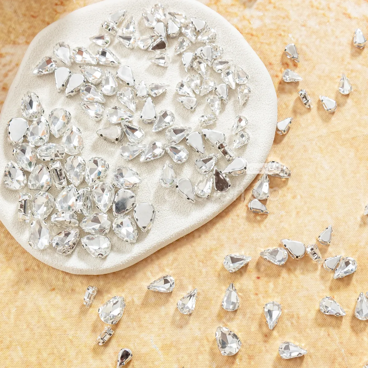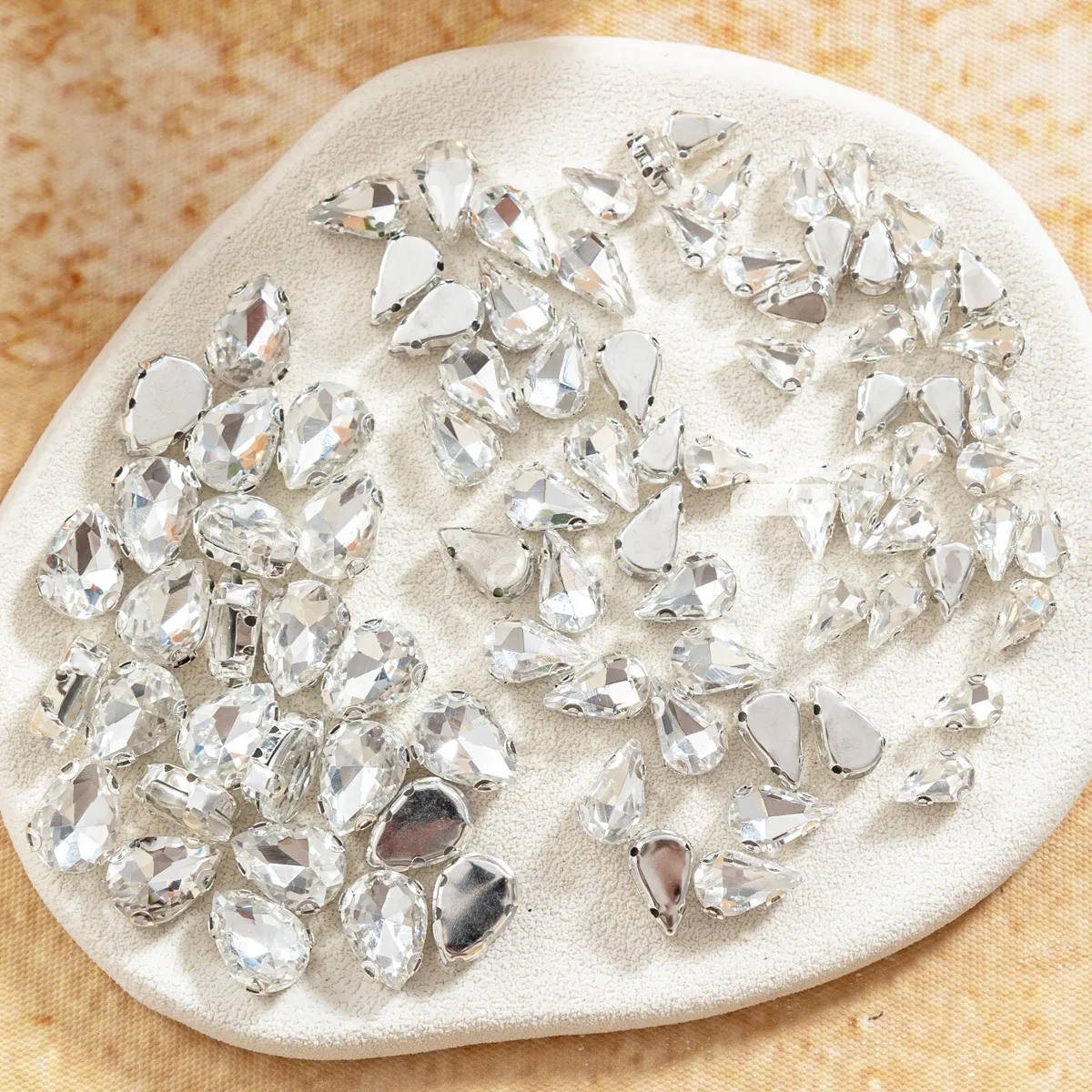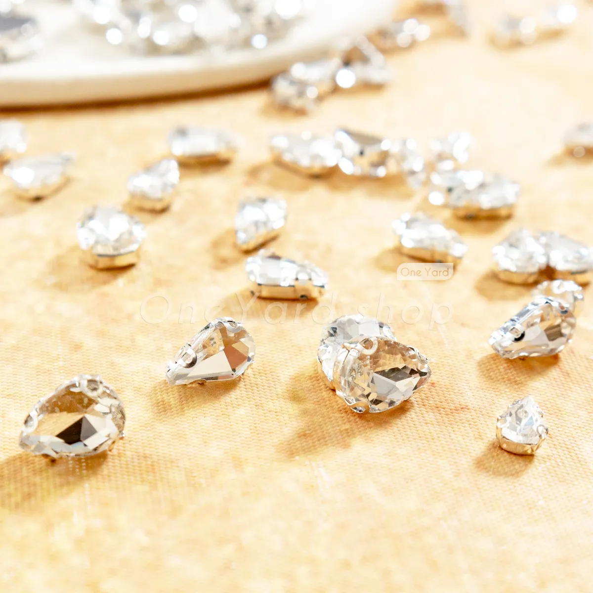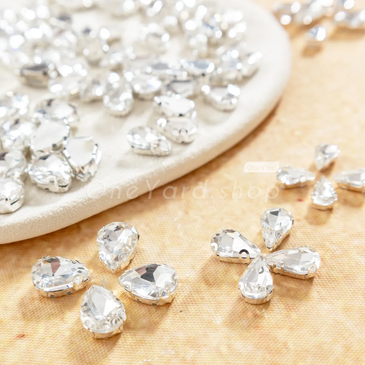 These premium teardrop crystal-clear sew-on rhinestones are crafted from high-quality faceted glass, offering superior clarity and a diamond-like brilliance that distinguishes them from acrylic alternatives. Designed for high-end garment embellishment, the glass material ensures a lasting shine that does not dull over time. Each stone features sharp, multi-angled facets that maximize light refraction for exceptional sparkle and is securely encased in a sturdy silver-tone metal claw base.