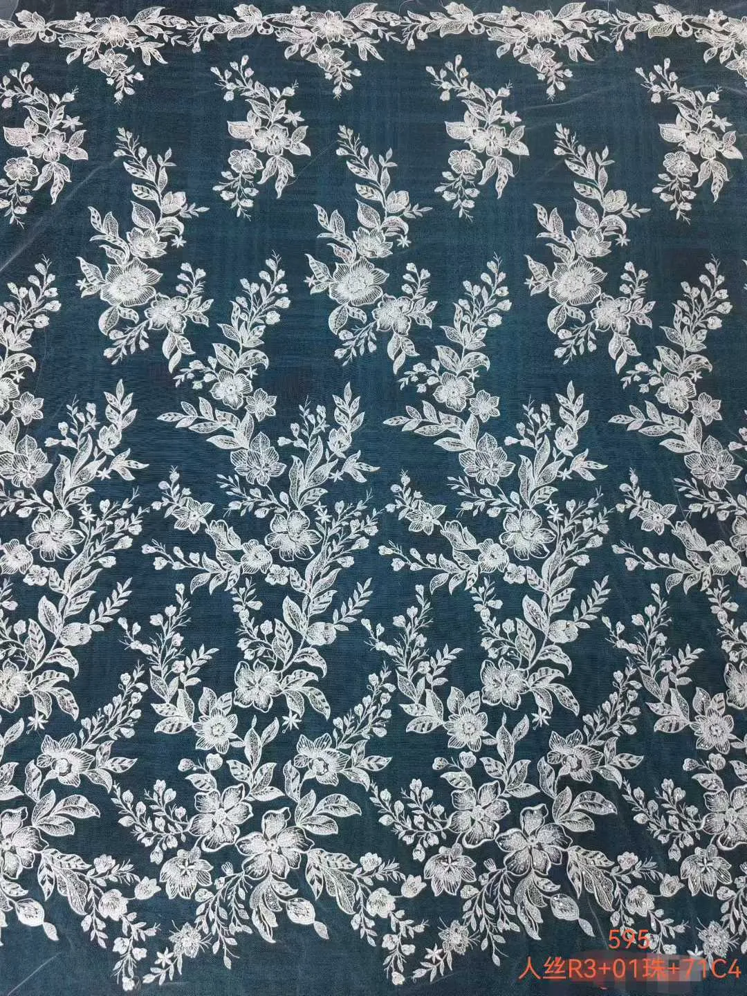 Add a touch of ethereal romance to your couture designs with this embroidered lace fabric. Featuring a graceful, continuous all-over pattern of meandering floral vines and delicate leaves, this botanical fabric is beautifully crafted with lustrous rayon thread. Subtle, shimmering sequins are delicately scattered throughout the motifs, catching the light perfectly. Ideal for crafting breathtaking bridal gowns, sweeping romantic skirts, and sophisticated fashion overlays.