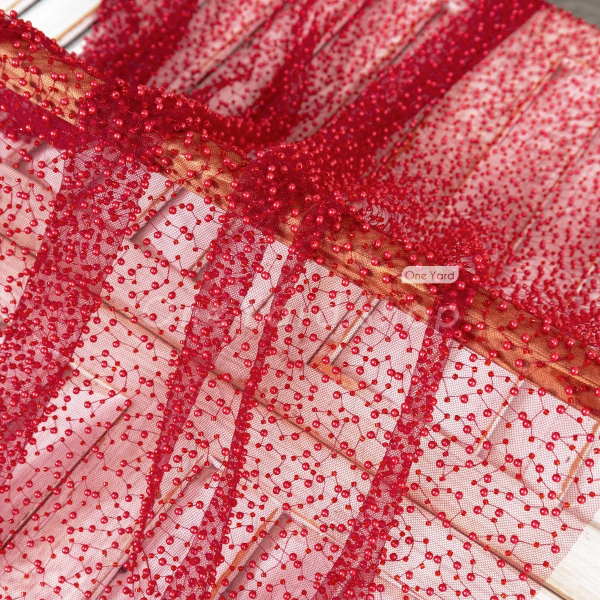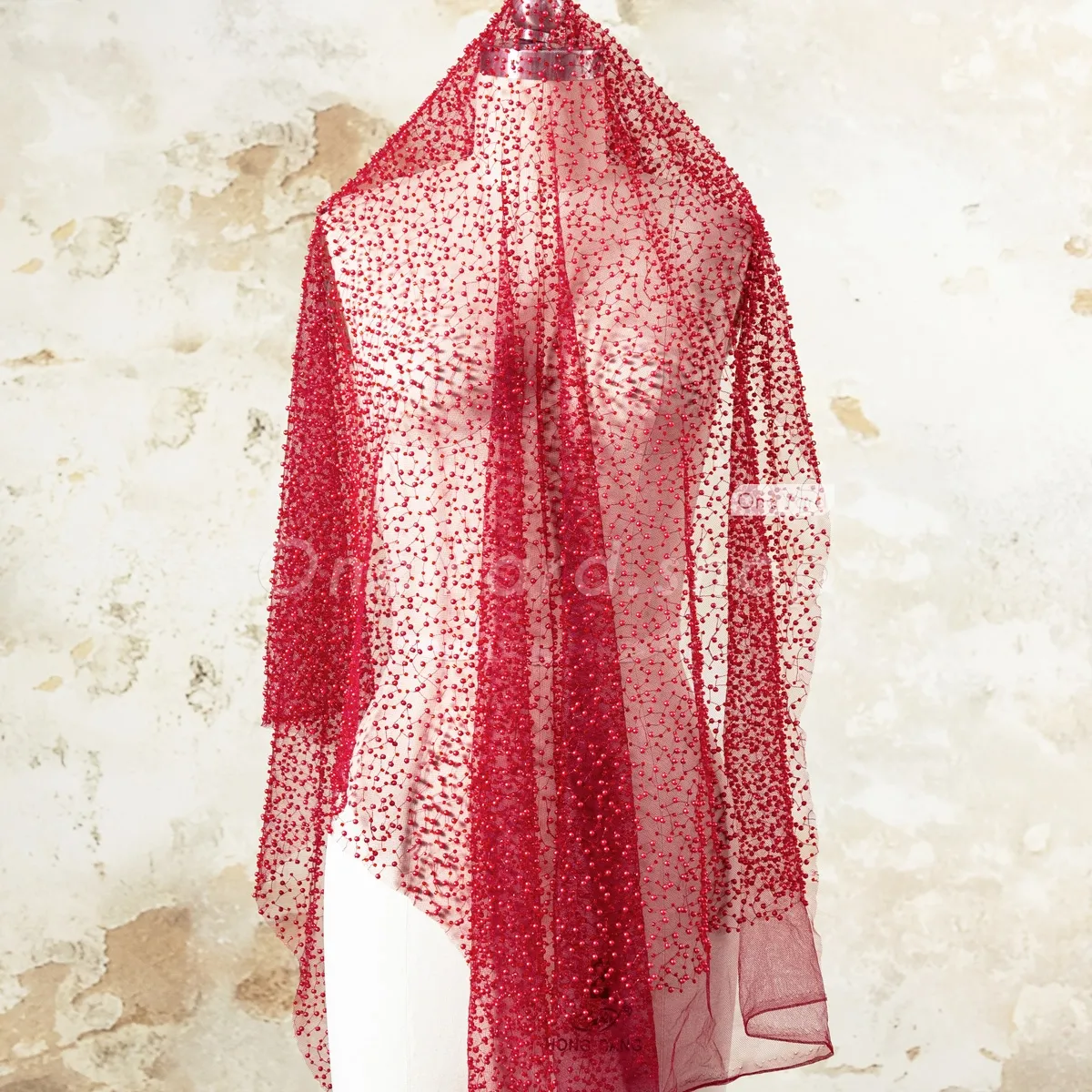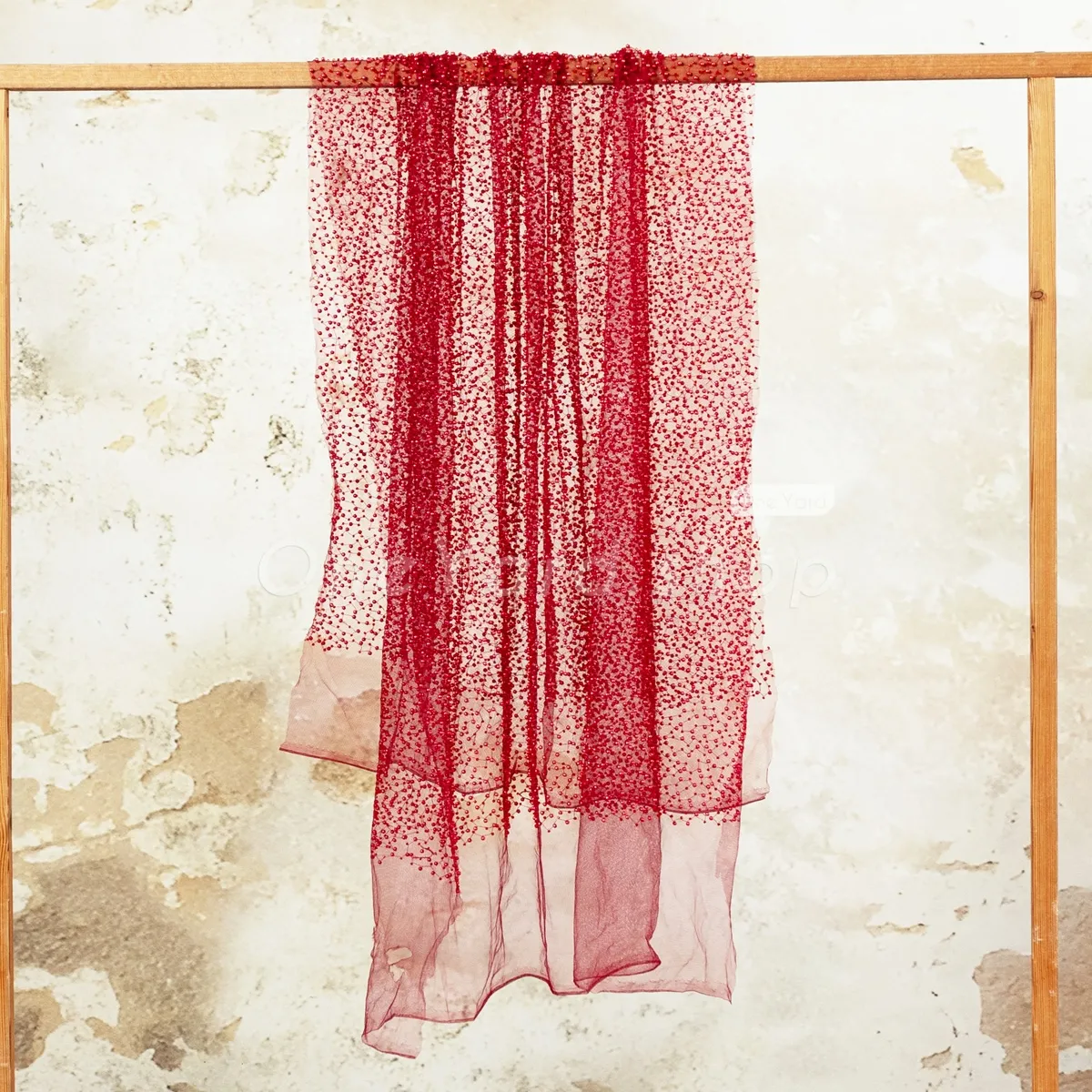 Vibrant Garnet Pearl Beading Sheer Mesh Material