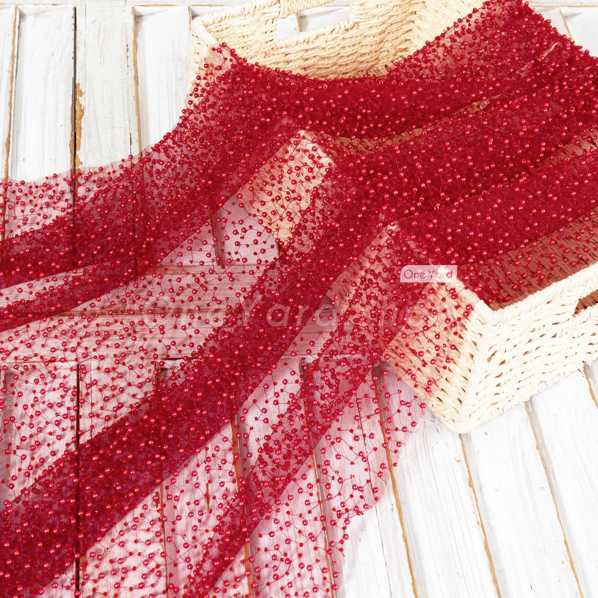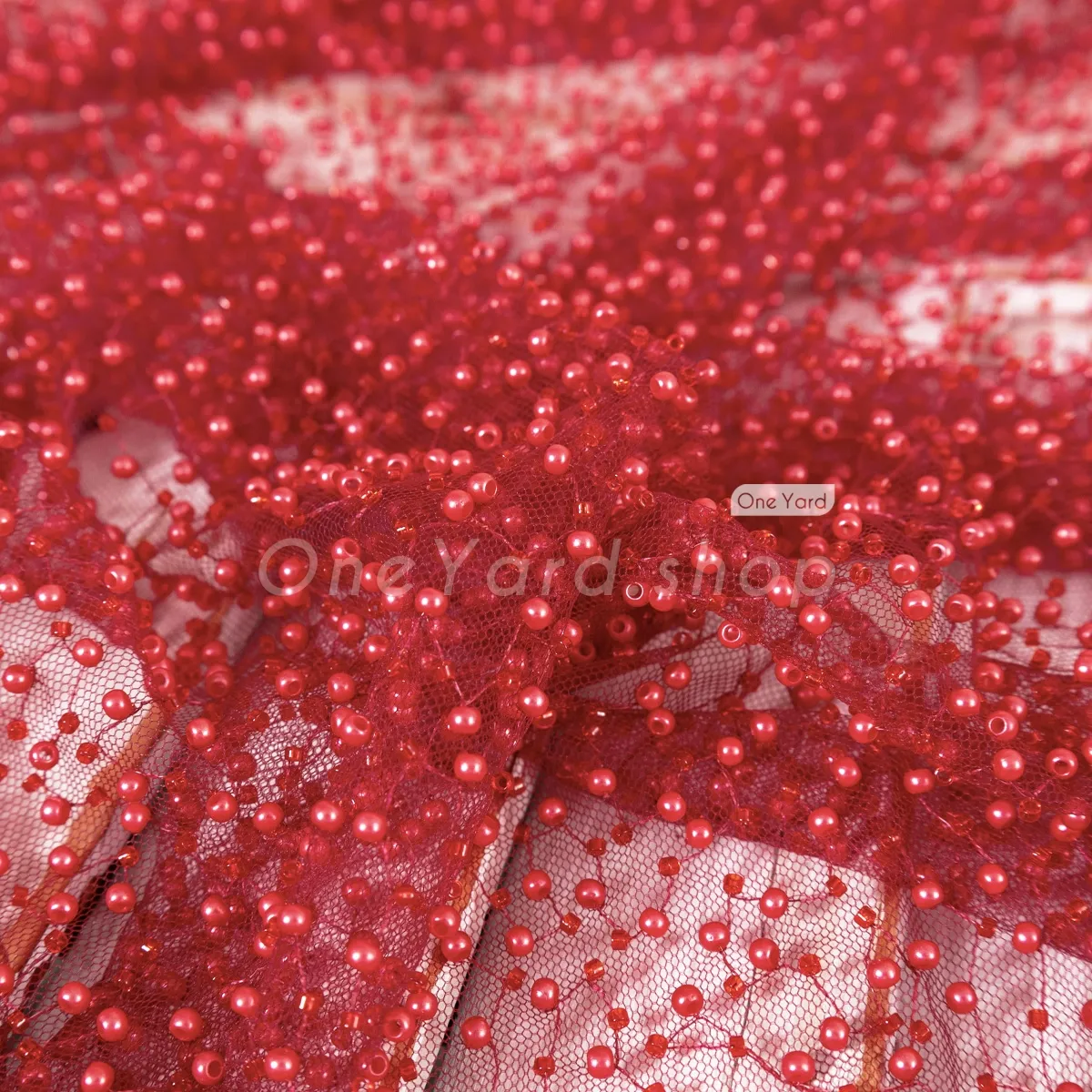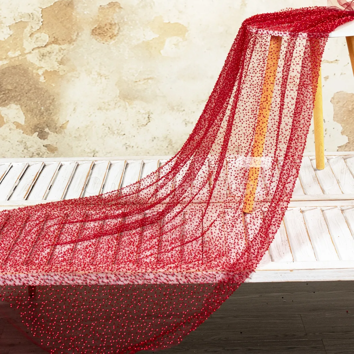 Vibrant Garnet Pearl Beading Sheer Mesh Material