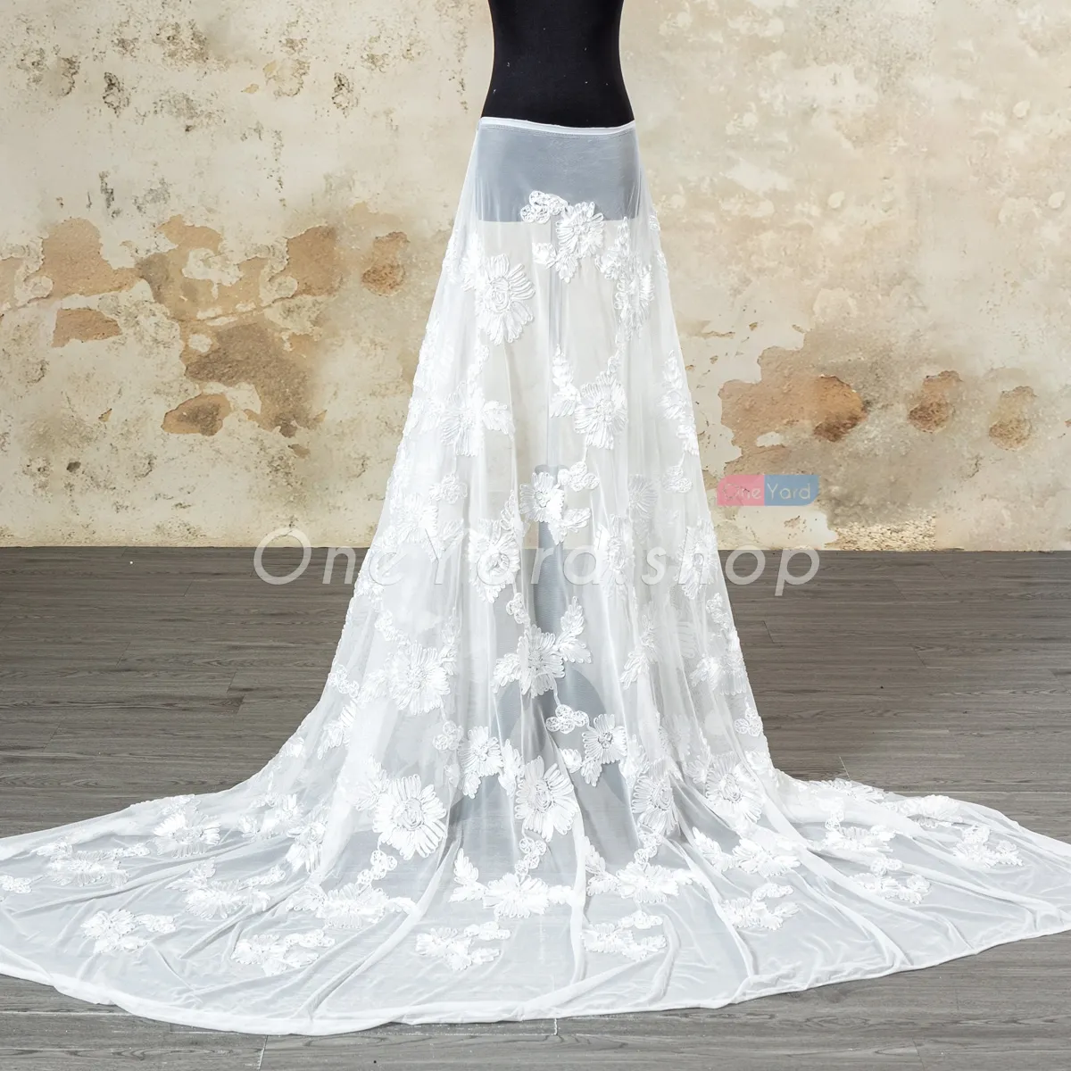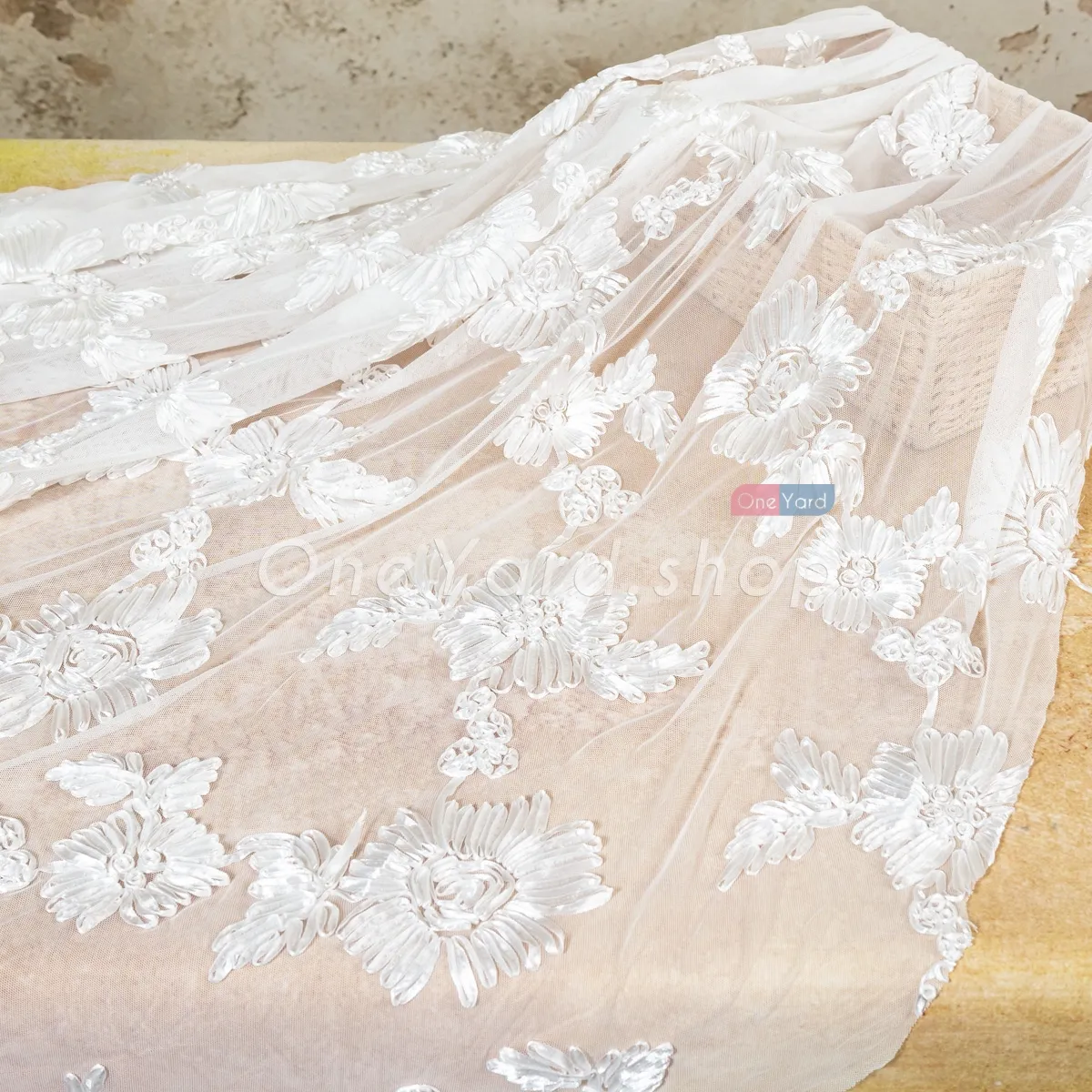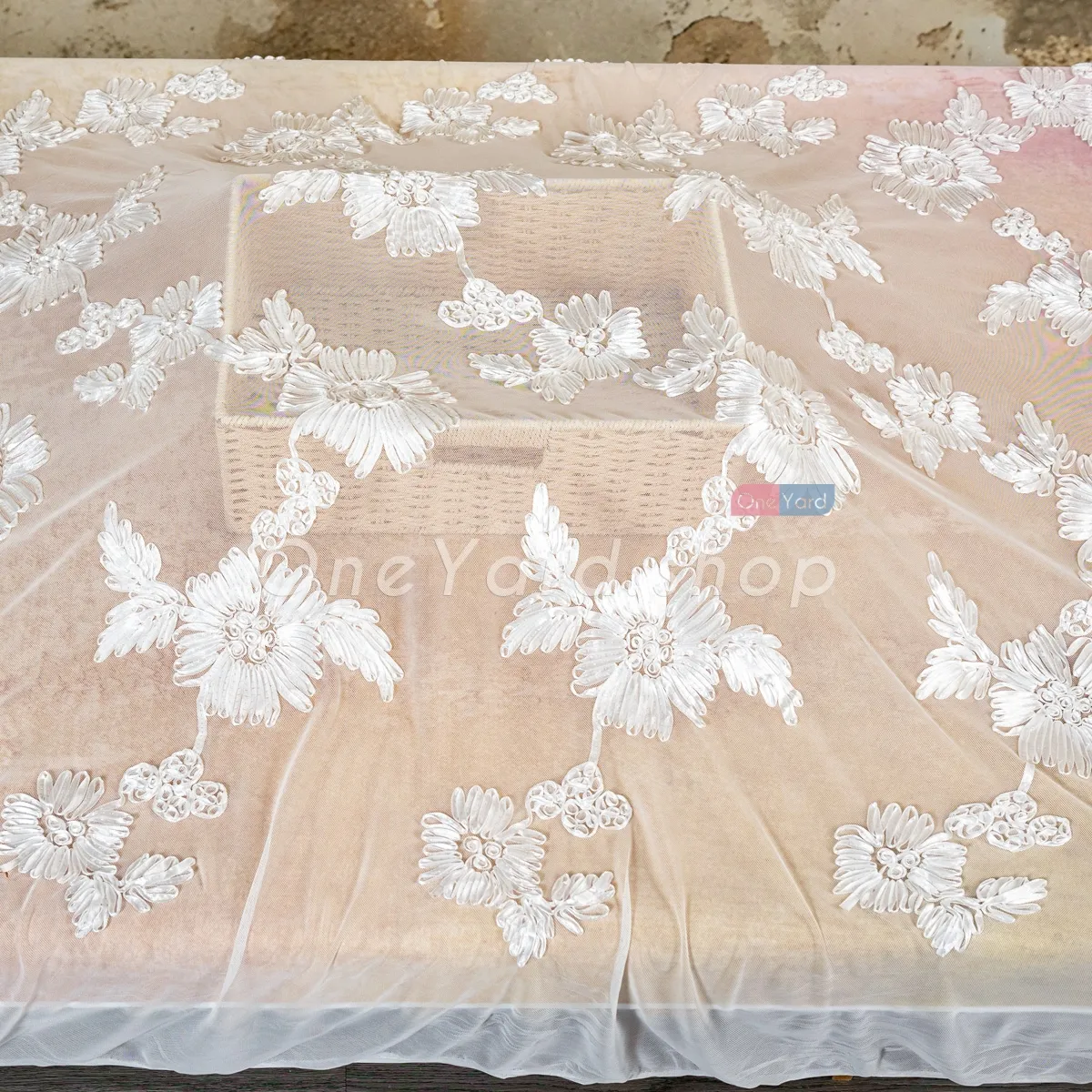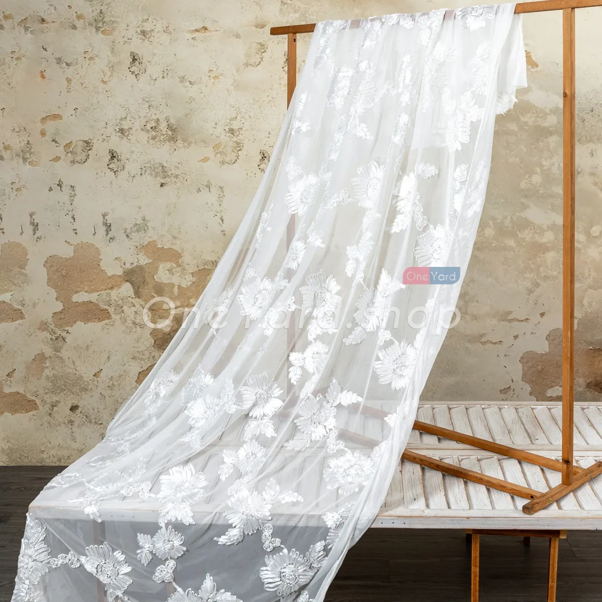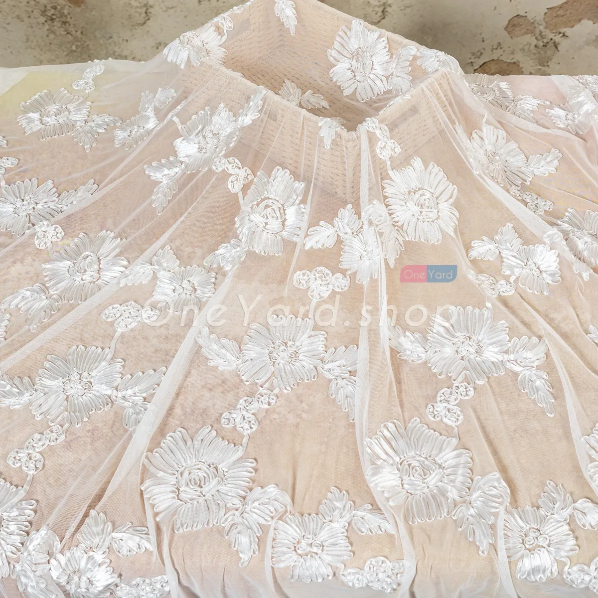 Stunning sheer white three-dimensional hibiscus flower embroidered on stretch soft tulle mesh. The white 3D embroidery lace fabric is covered in an elaborate, repeating pattern of large, thickly embroidered flowers and smaller clustered motifs.
