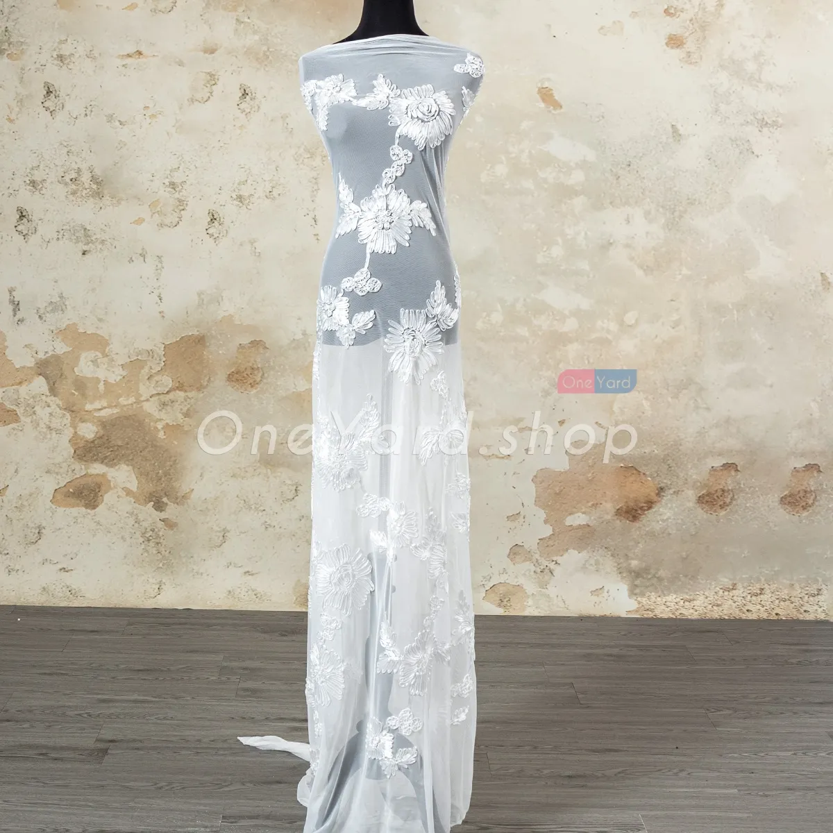 White 3D Hibiscus Flower Embroidery Stretch Lace Fabric