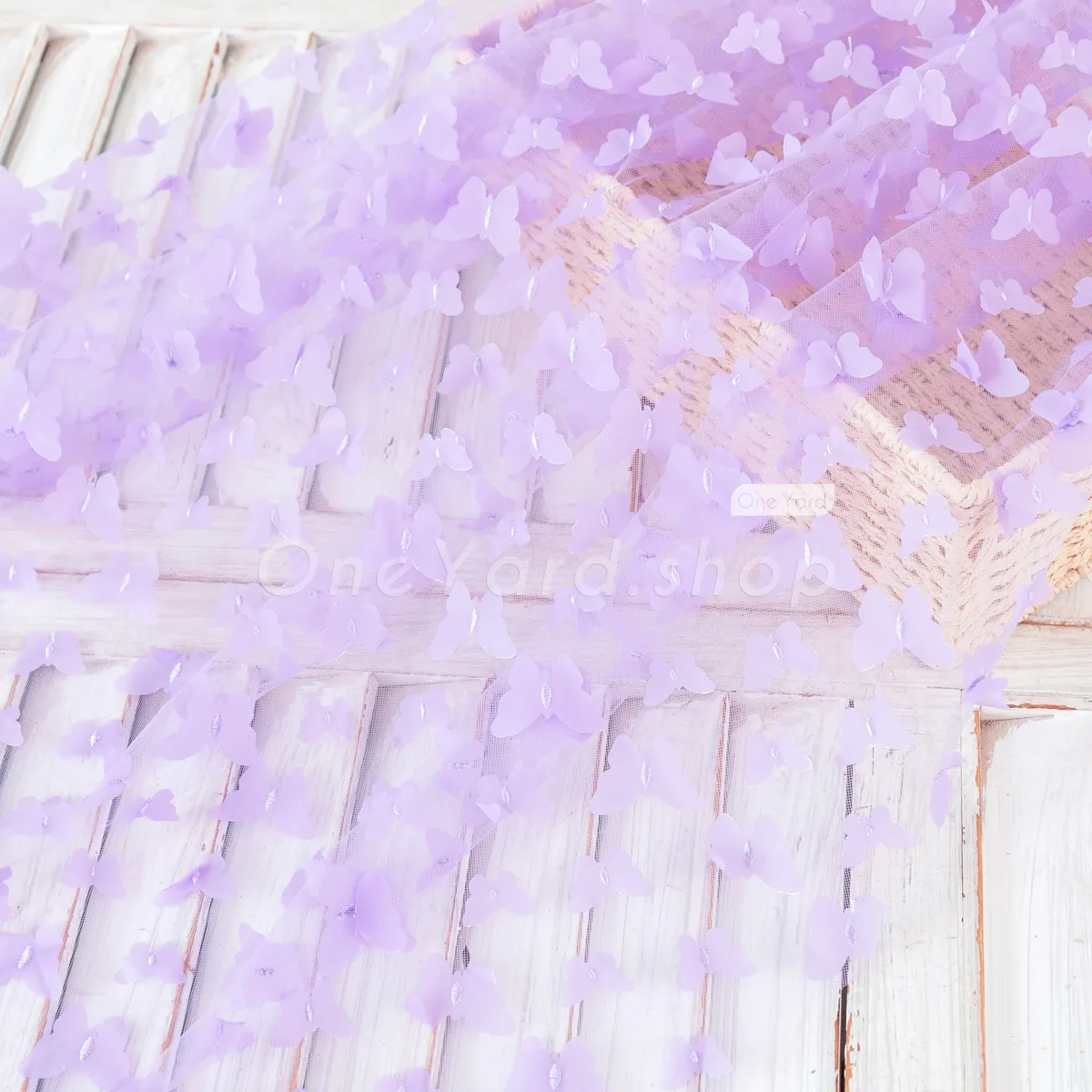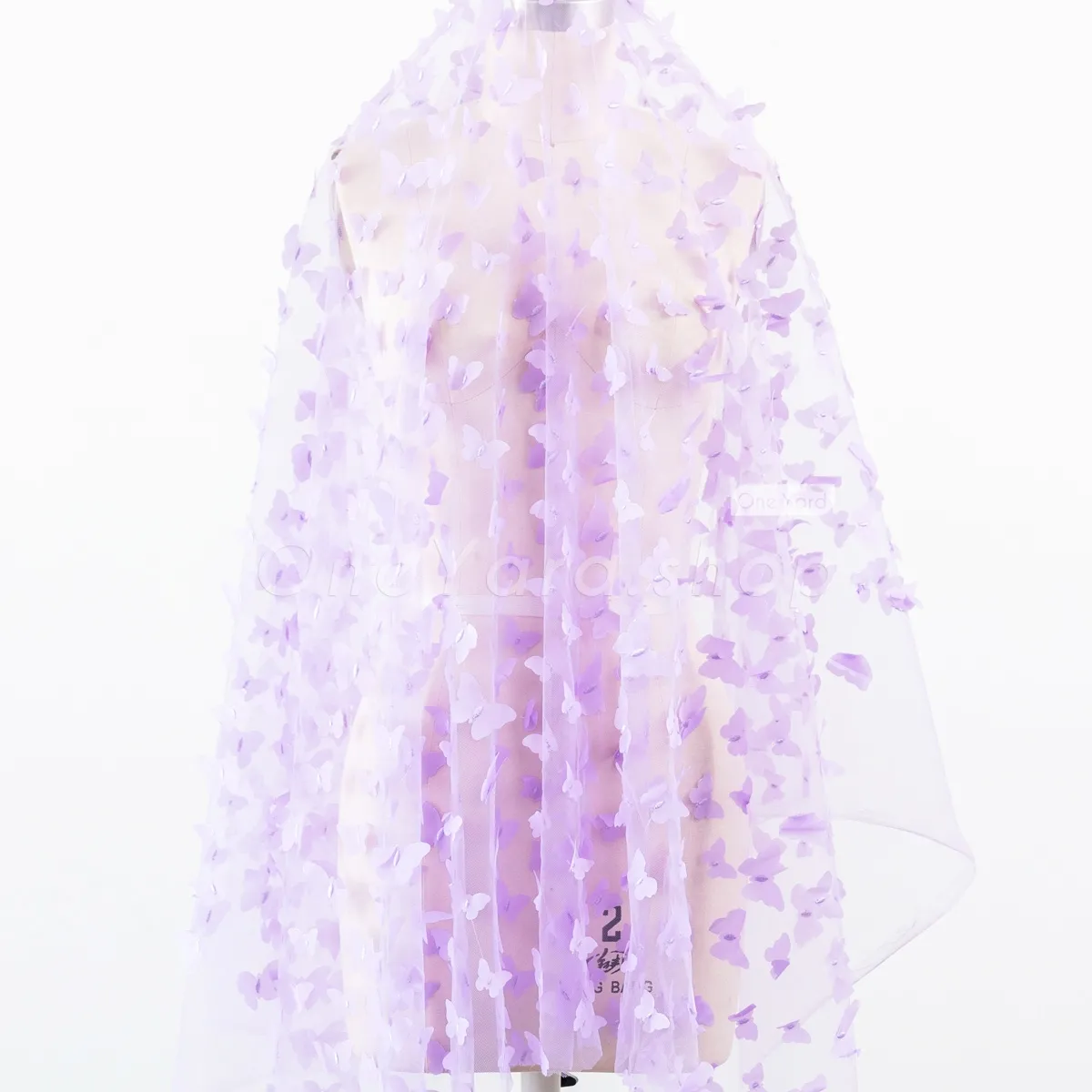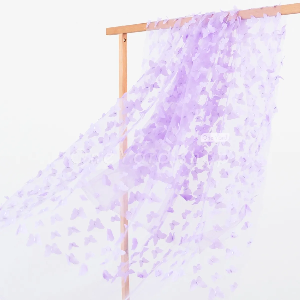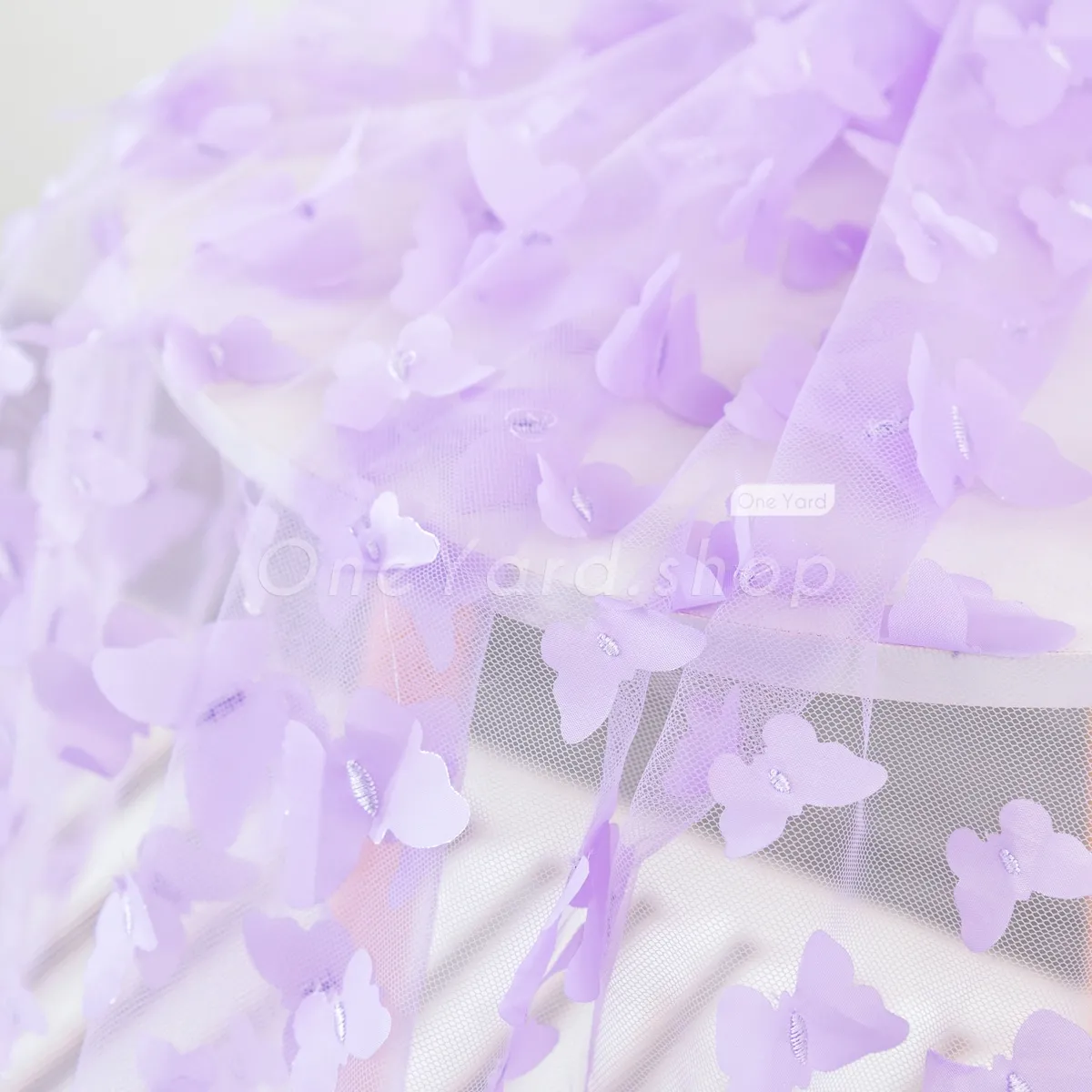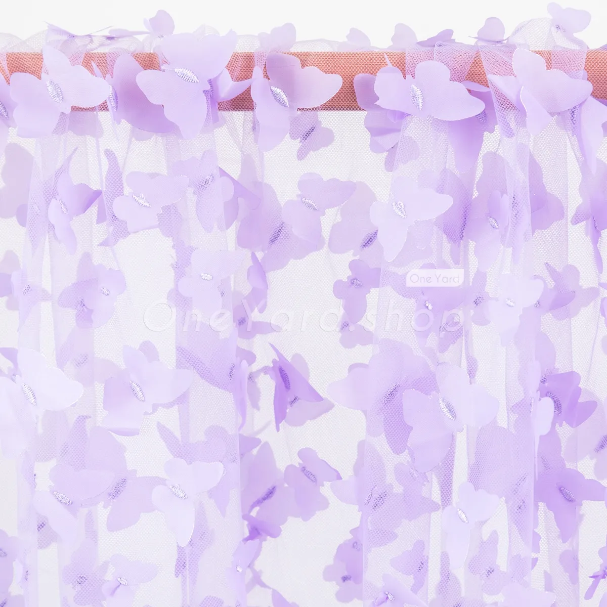 Beautiful wisteria 3D butterfly all over soft mesh embroidery fabric. The solid wisteria purple butterfly embroidery mesh fabric is perfect for making dresses, decorations, wedding events, and more.